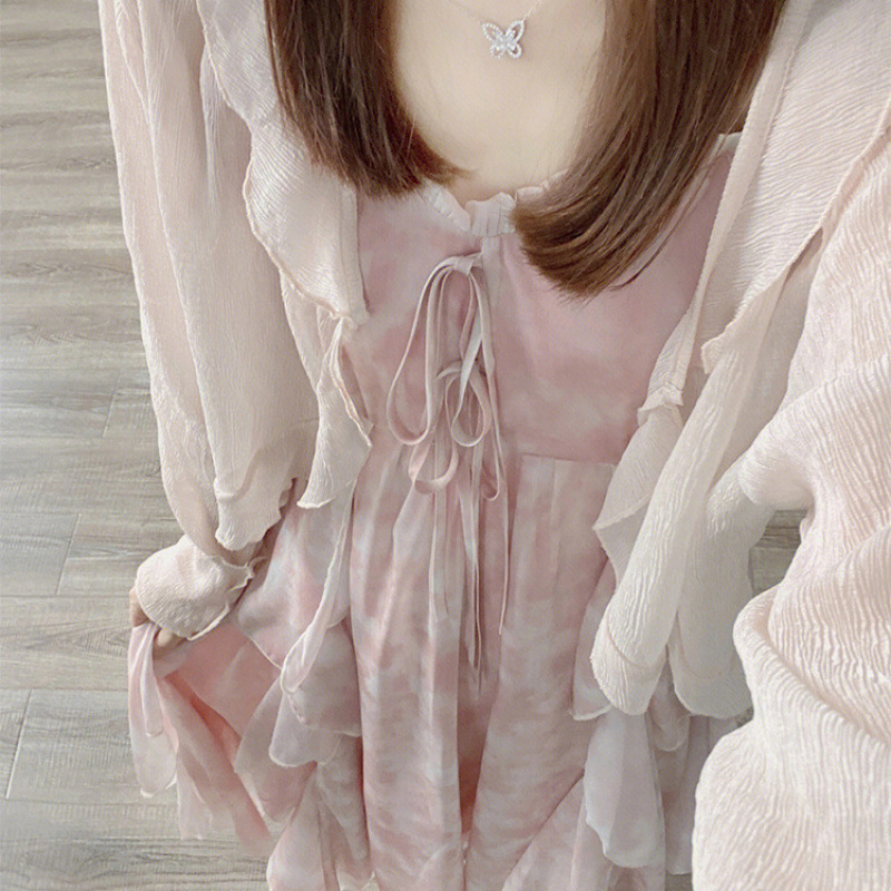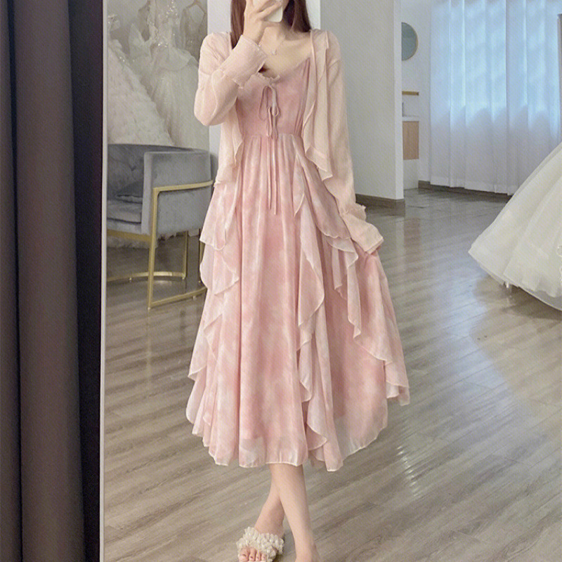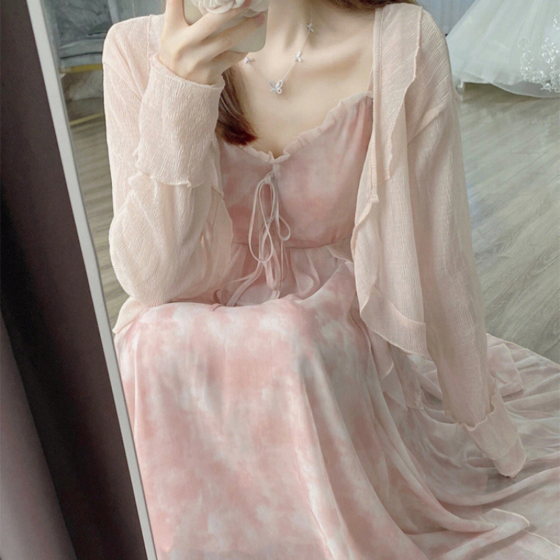 핑크 꽃 부드러운 스타일 카디건 투피스 고급 요정 원피스 여성 여름 치마 세트
