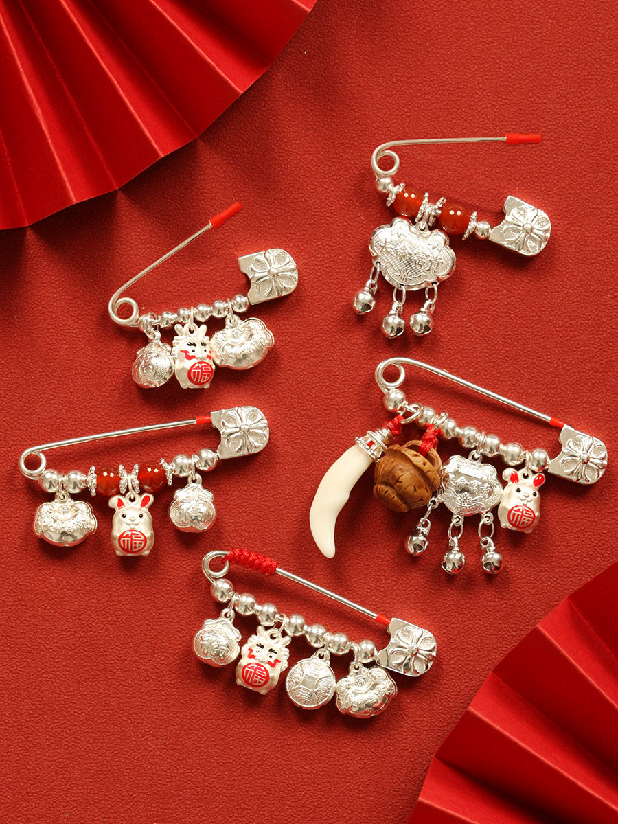 S925 스털링 실버 임산부 아기 핀 브로치 신생아 건강 장수 잠금 토끼 용 Cinnabar Xu Xiao