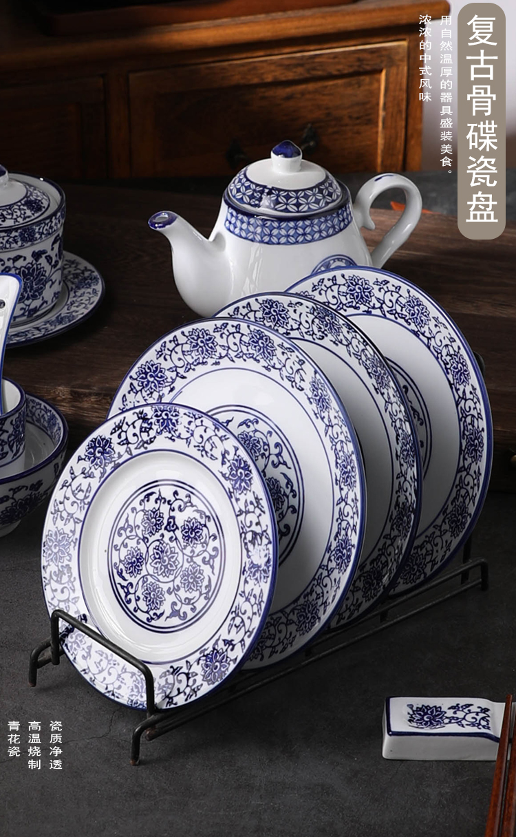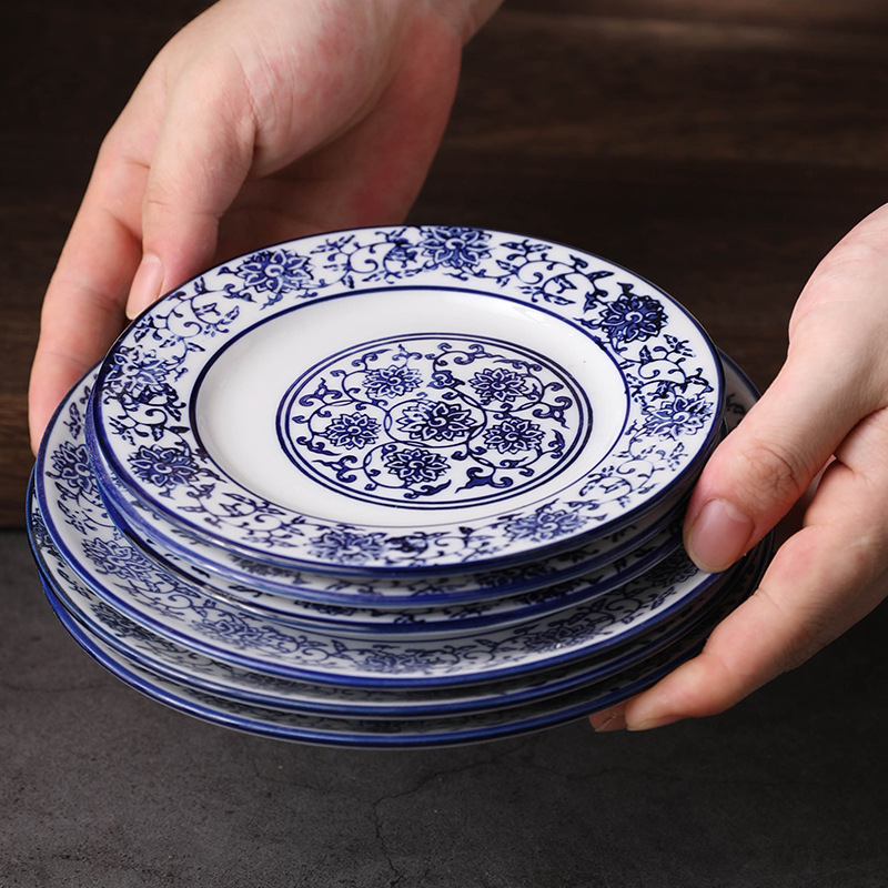 파란색과 흰색 플레이트 중국 복고풍 둥근 7 인치 뼈 플레이트 가정용 레스토랑 평면 판 얕은 판 밑유약 컬러 세라믹 주에진스토어 가기