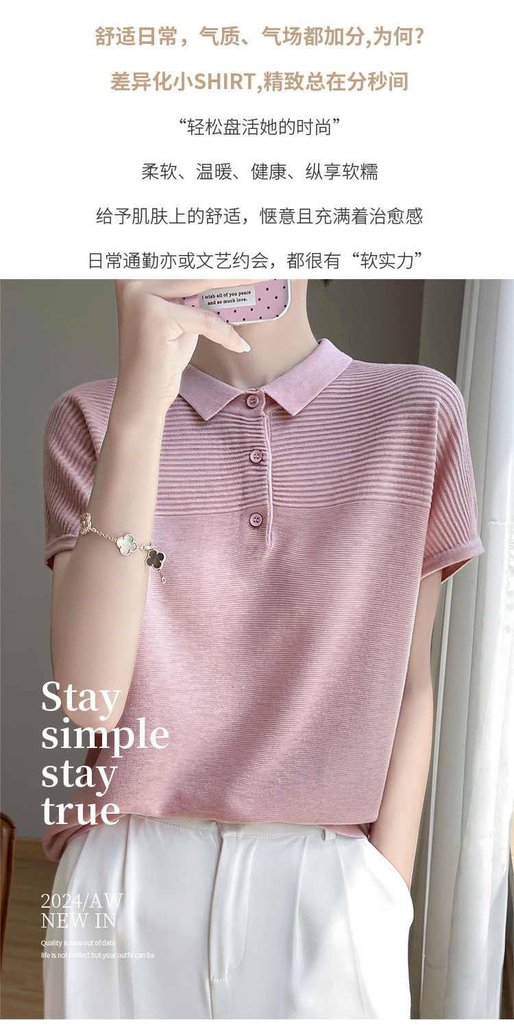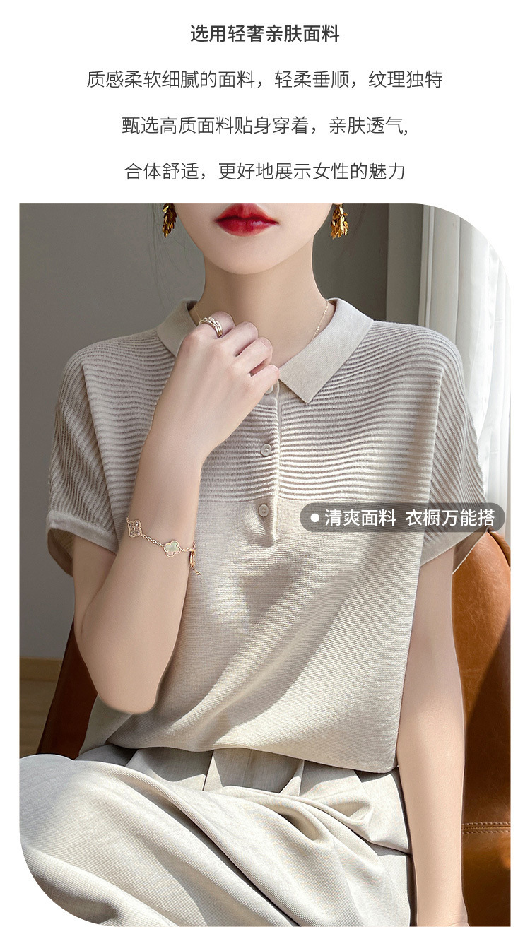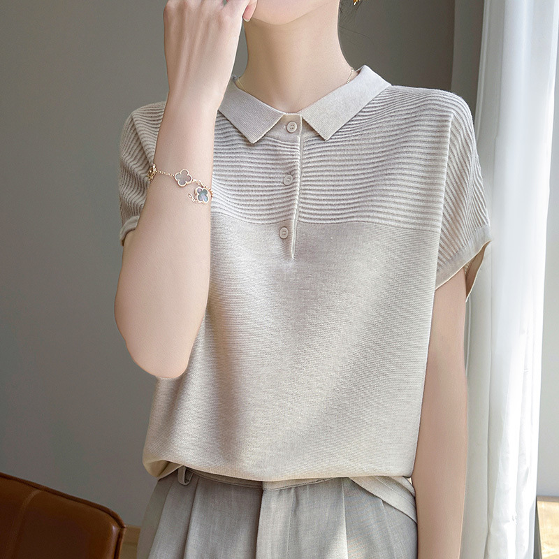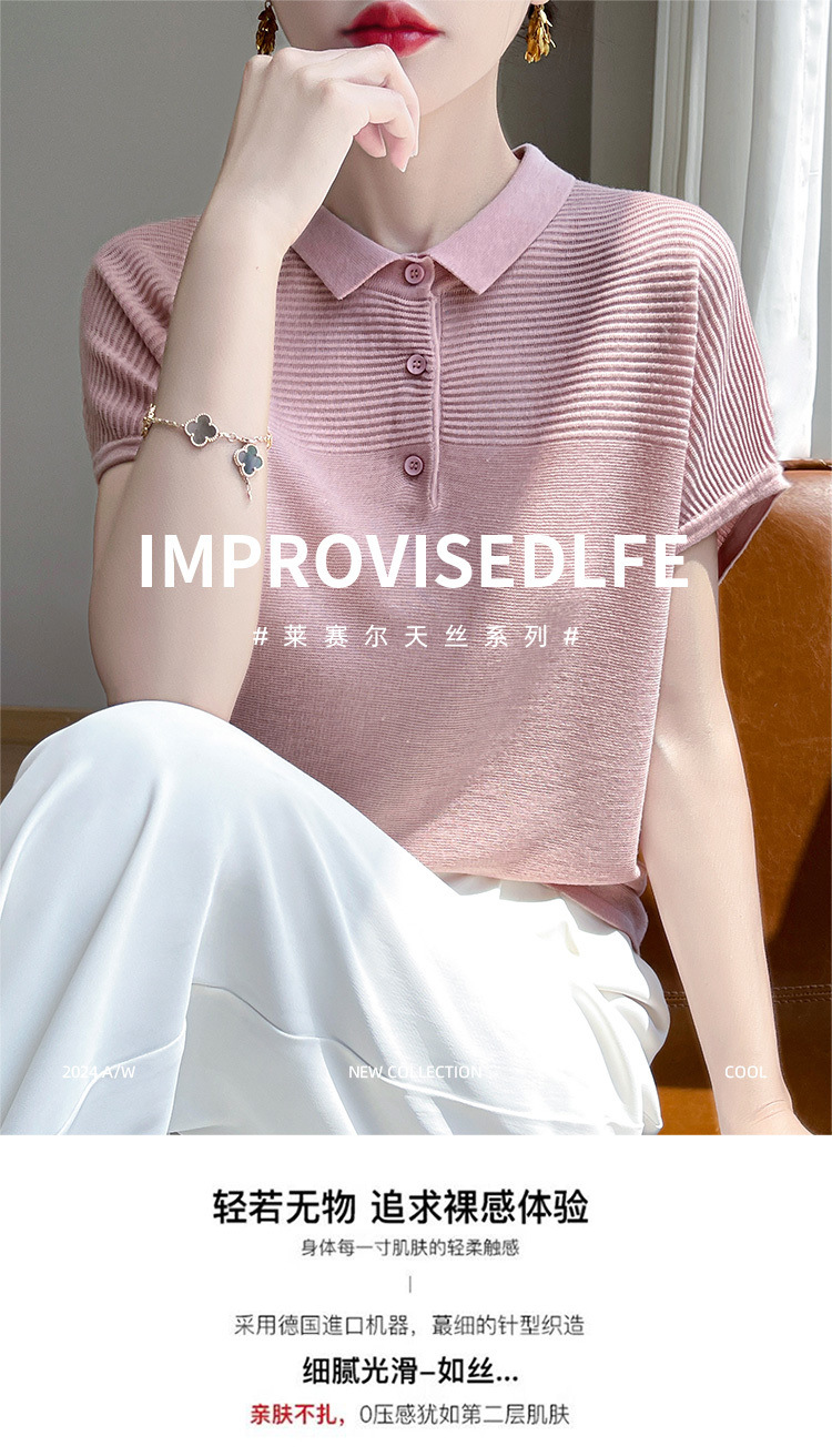 100 텐셀 니트 반팔 티셔츠 여성용 여름 뉴 멀 베리 실크 우아한 루즈 셔츠 칼라 탑 크로스스토어 가기