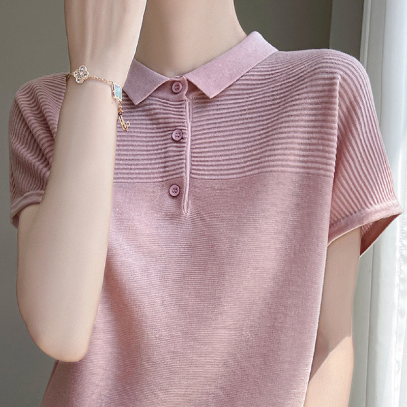 100 텐셀 니트 반팔 티셔츠 여성용 여름 뉴 멀 베리 실크 우아한 루즈 셔츠 칼라 탑 크로스