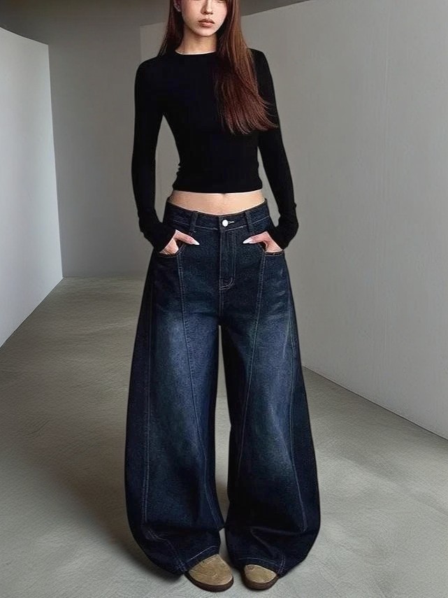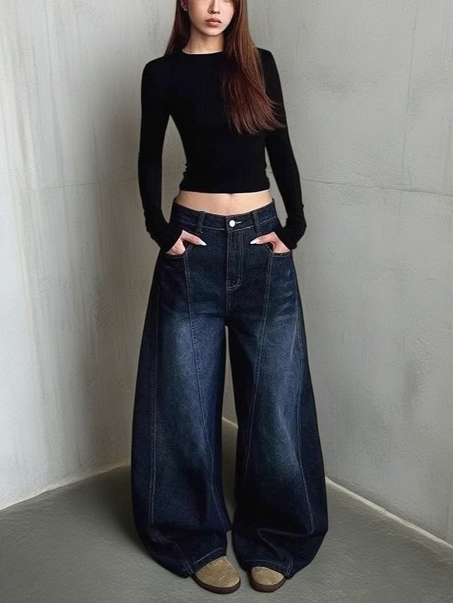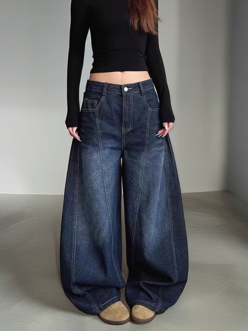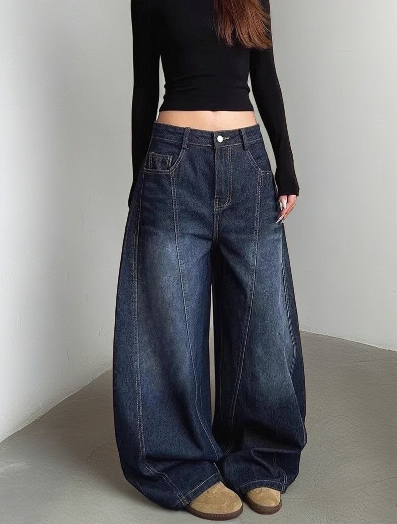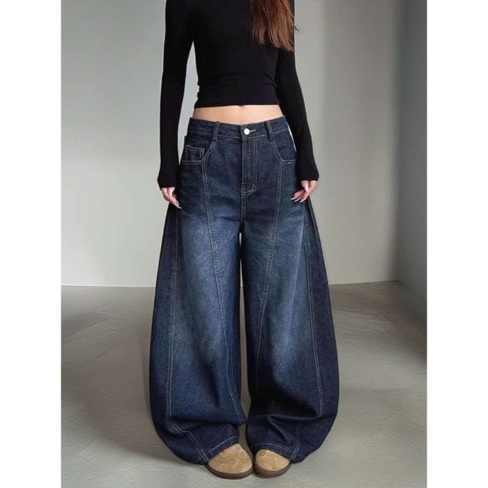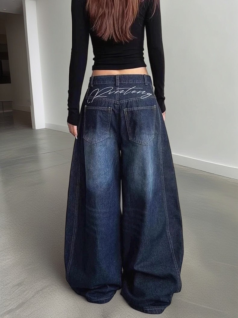 마체 테 디자인 센스 다크 블루 청바지 플러스 사이즈 남성 아메리칸 스타일 레트로 하이 스트리트 스트레이트 레그 와이드 레그 루즈 바지스토어 가기