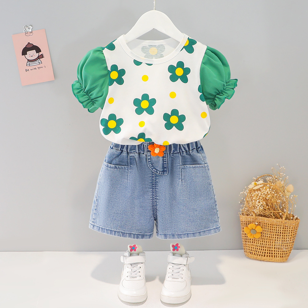 • 플라워 도트 데님 쇼츠 슈트 (그린)