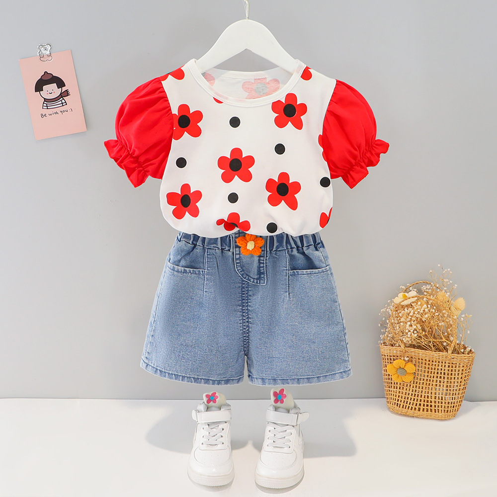 • 플로럴 도트 데님 쇼츠 슈트 (레드)