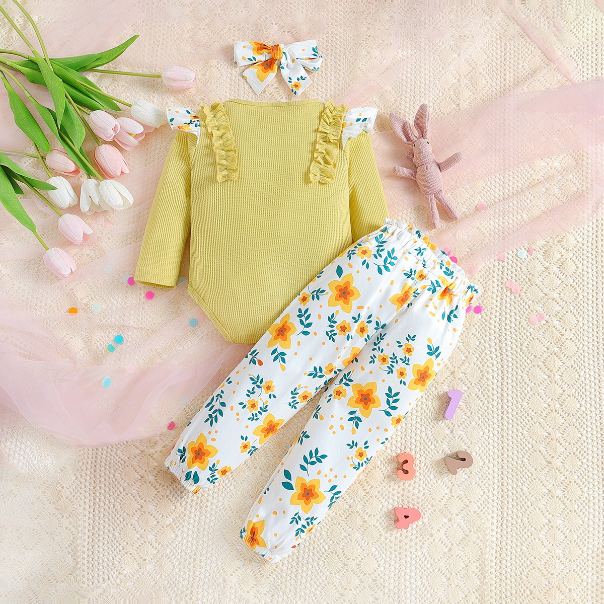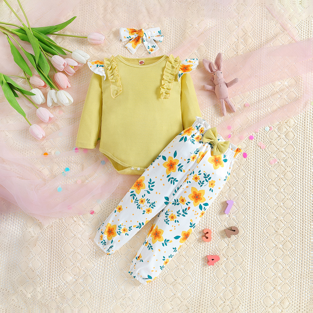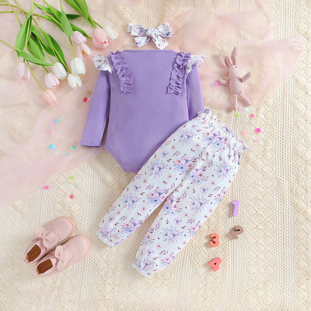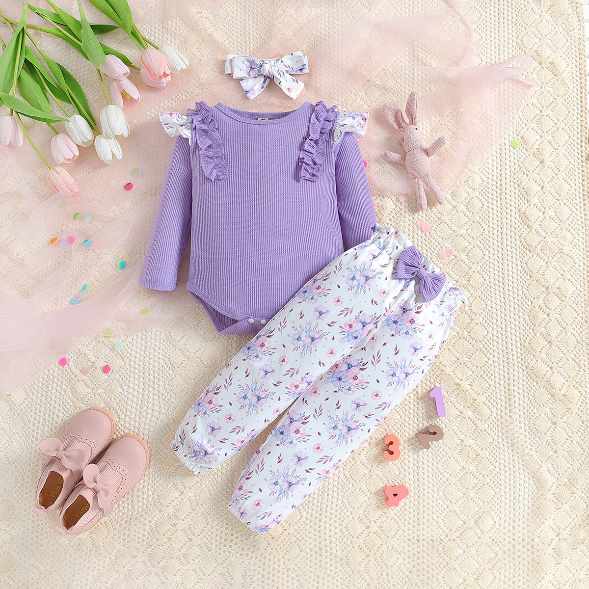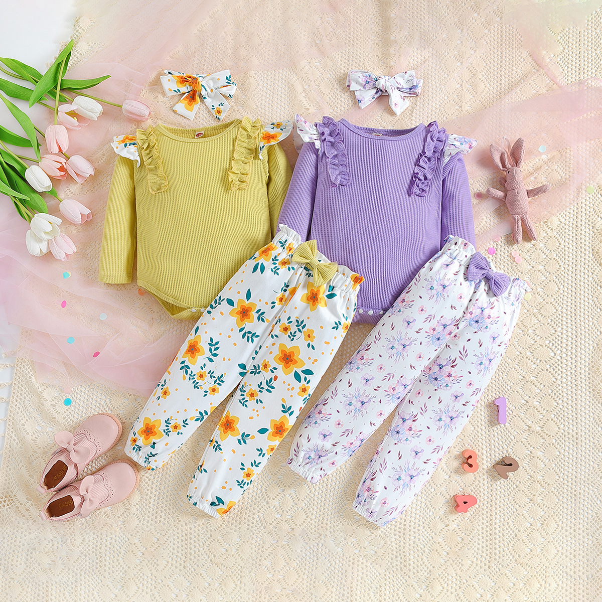 SAMGAMI BABY 국경 간 아기 봄 긴 소매 레이스 랩 방귀 의류 프린트 바지 소녀 세트스토어 가기