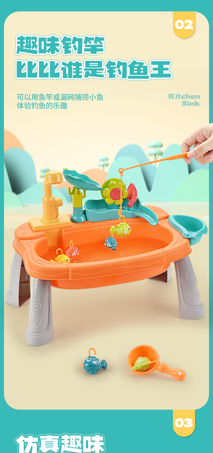 • 식기세척기 낚시 꽃 물레방아 3-in-1 식기세척기(물고기 8마리, 낚싯대 2개 포함) - 주황색