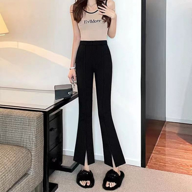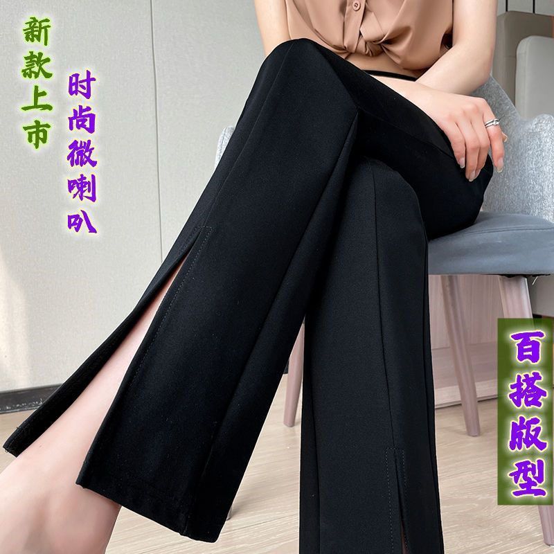 검은 색 마이크로 플레어 바지 여자 프론트 스플릿 2024 펜던트 스트레치 높은 허리 슬리밍 서양식 올 매치 세트 바지스토어 가기