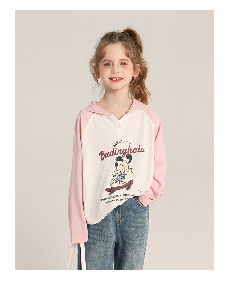 푸딩 하루 걸스 후드 티셔츠 2025 봄 새로운 어린이 만화 인쇄 Raglan 소매 긴 소매 탑
