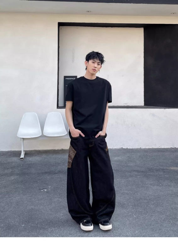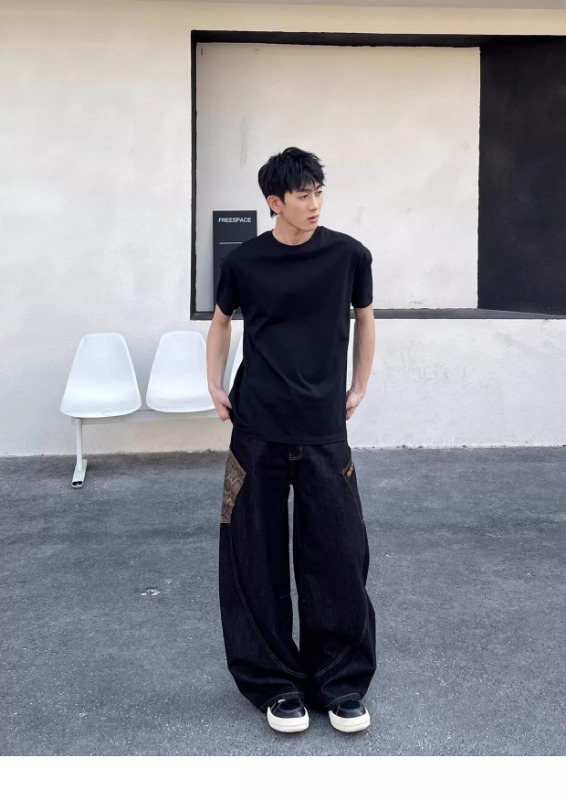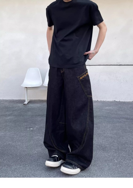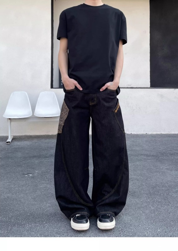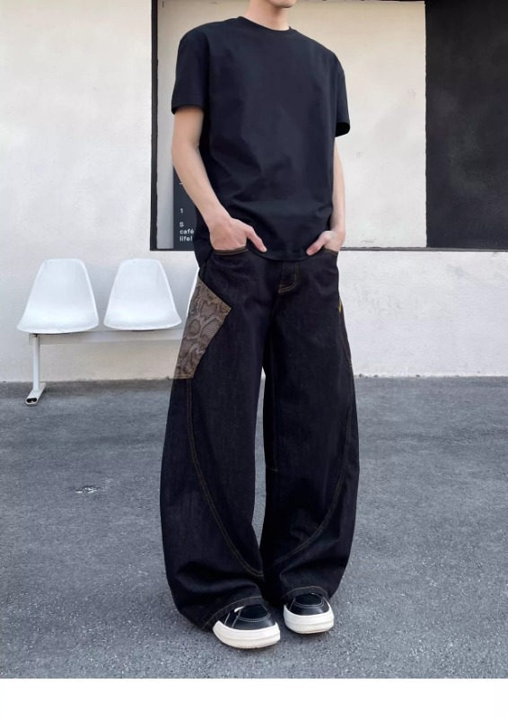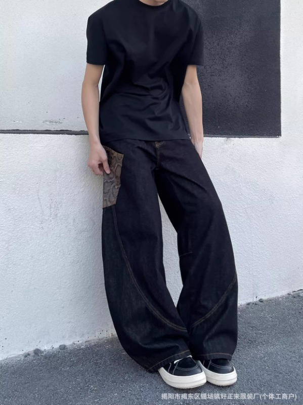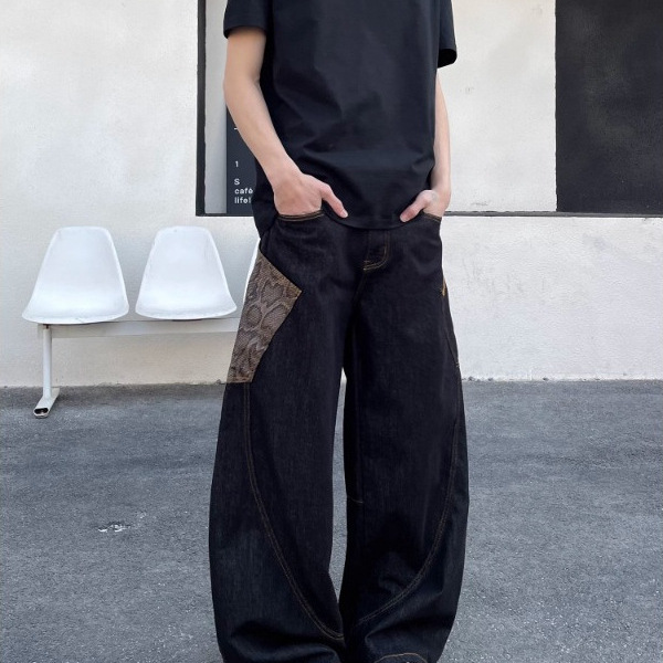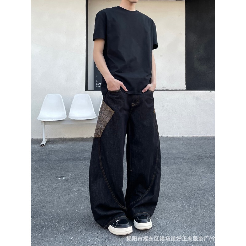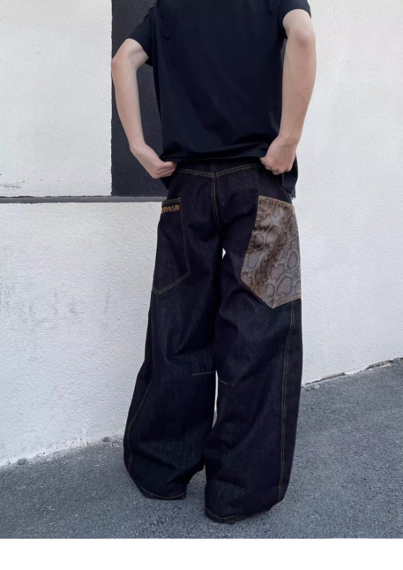 뱀의 해 한정판【뱀피 무늬 바지】미국 스타일 브랜드 블랙 커브드 데님 팬츠 와이드 팬츠 배색 디자인스토어 가기