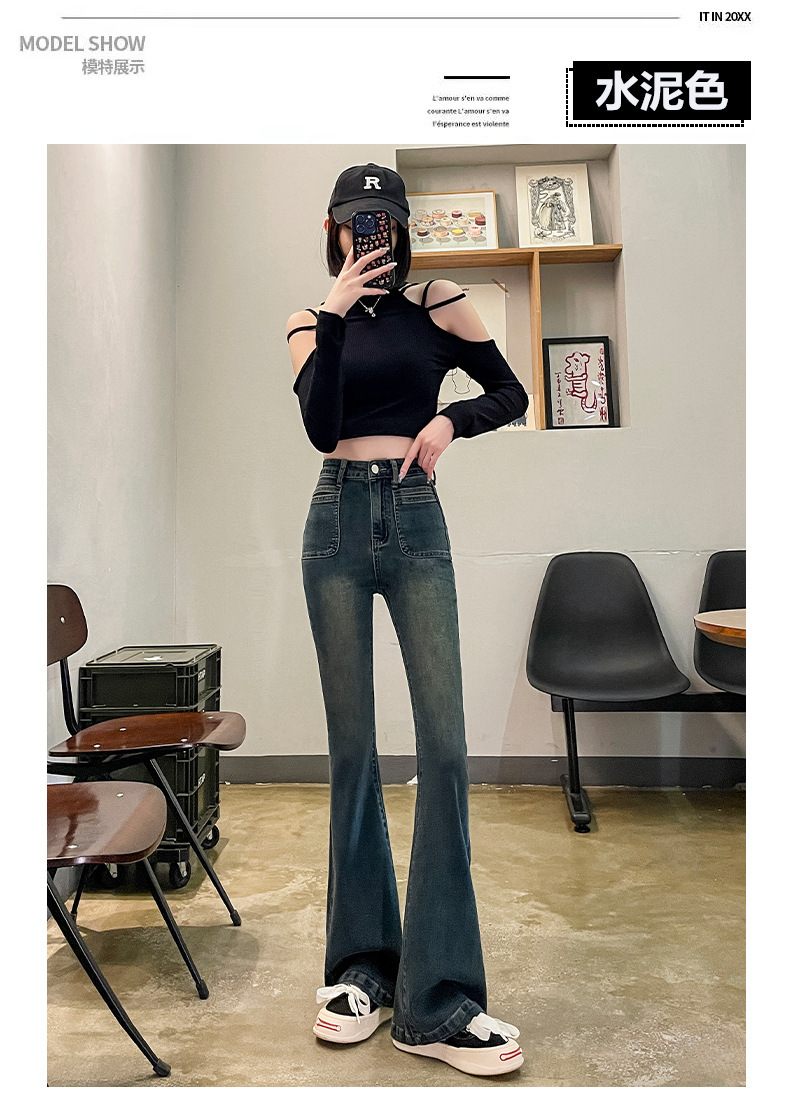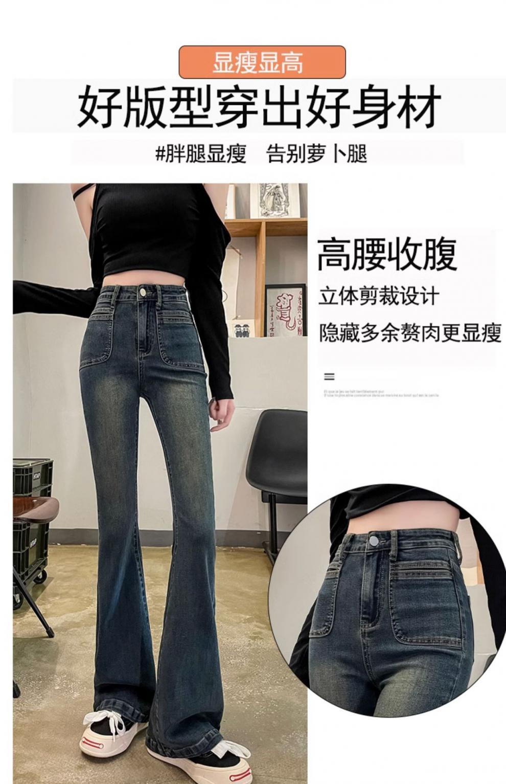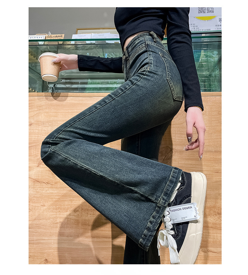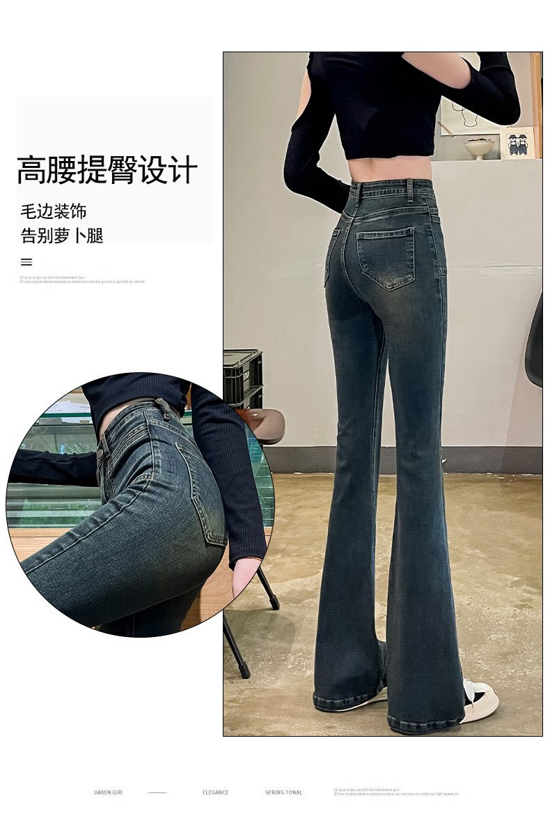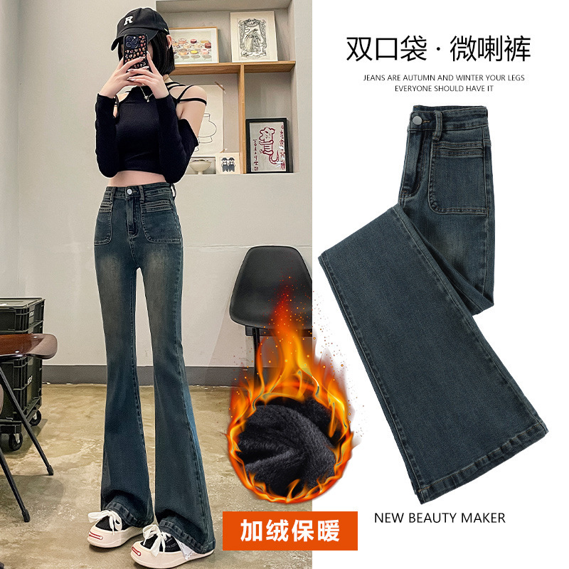 기모 높은 허리 플레어 바지 여성의 가을 2024 새로운 슬림 시멘트 회색 마이크로 블레 청바지 여성용 소형스토어 가기