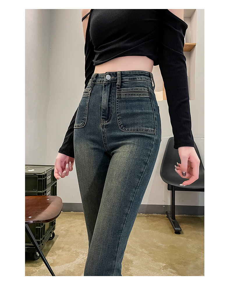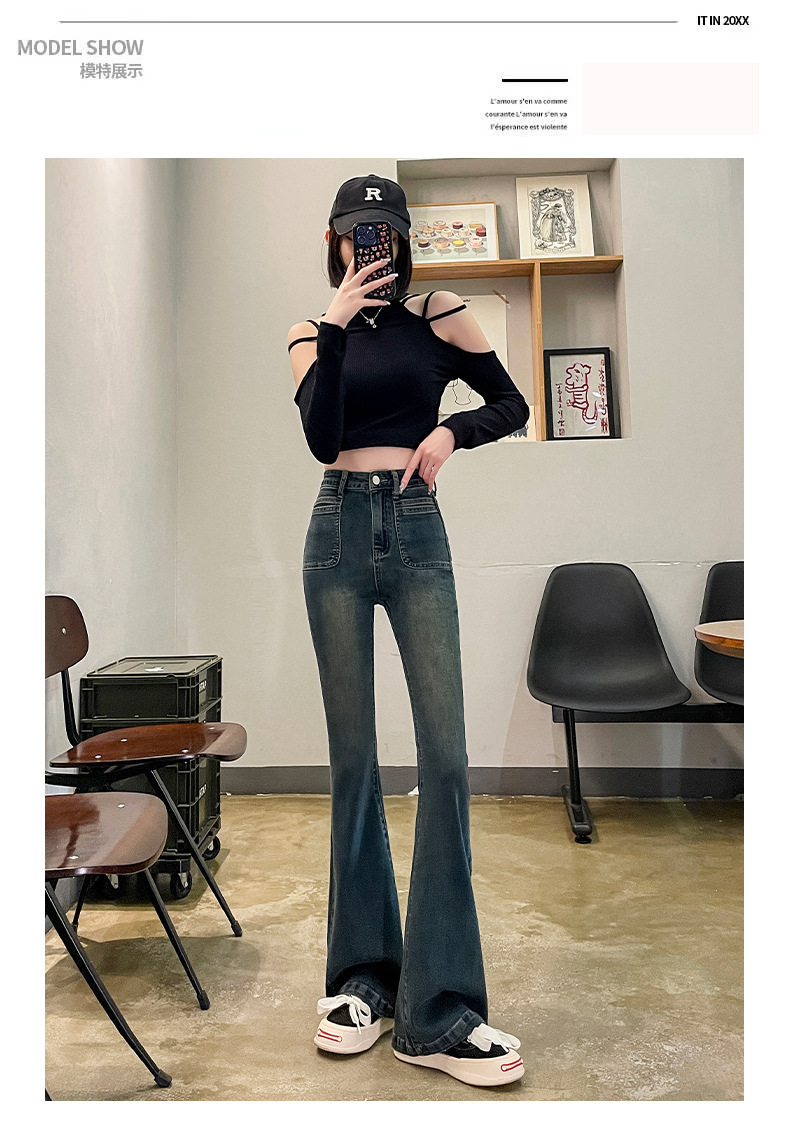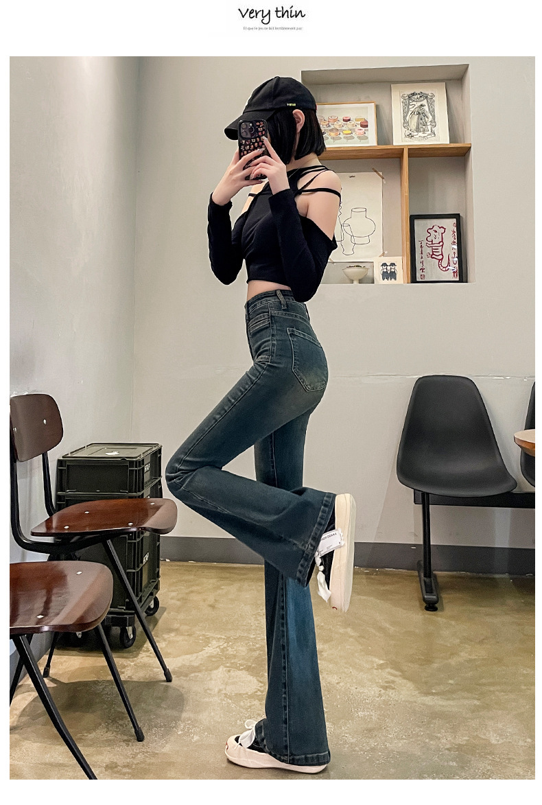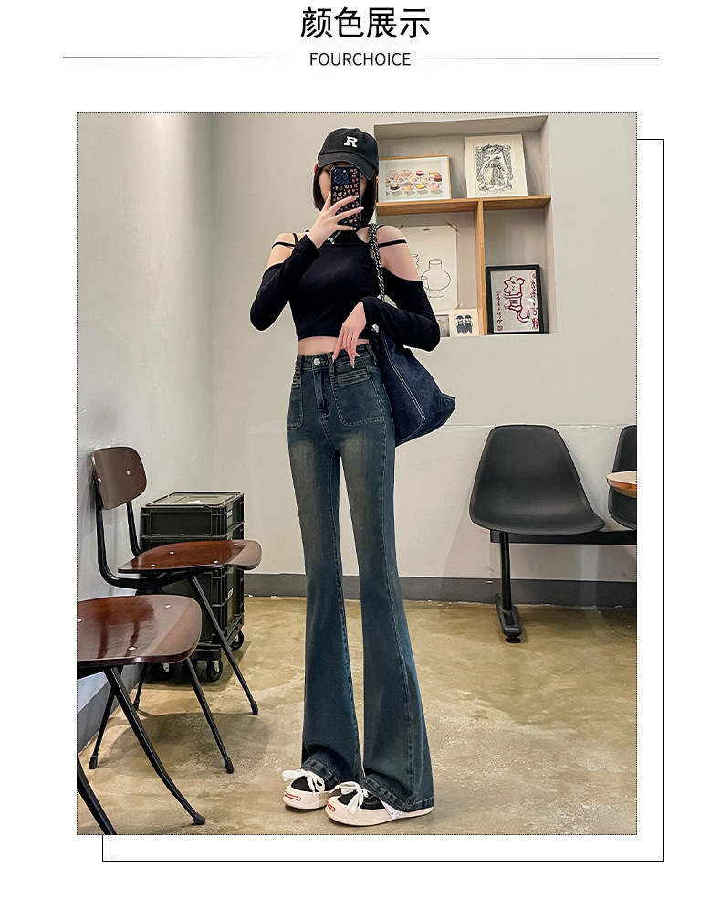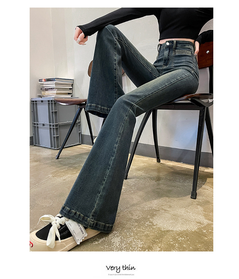 기모 높은 허리 플레어 바지 여성의 가을 2024 새로운 슬림 시멘트 회색 마이크로 블레 청바지 여성용 소형스토어 가기