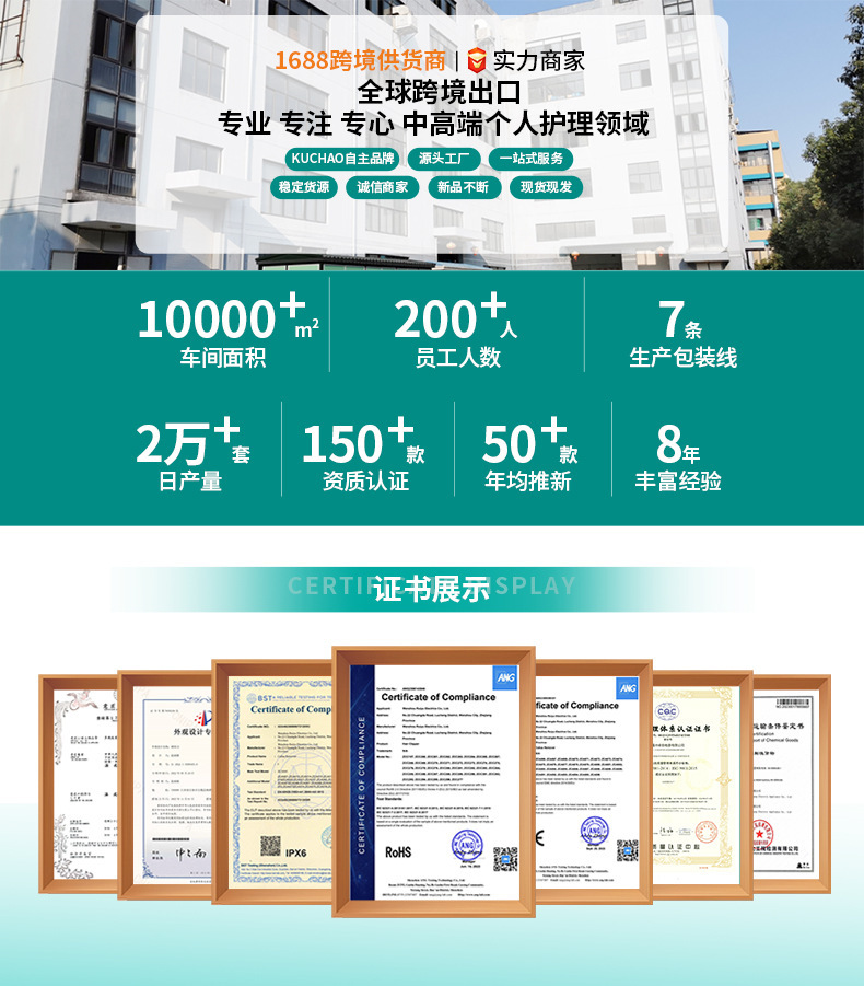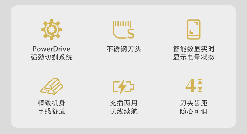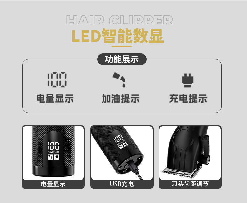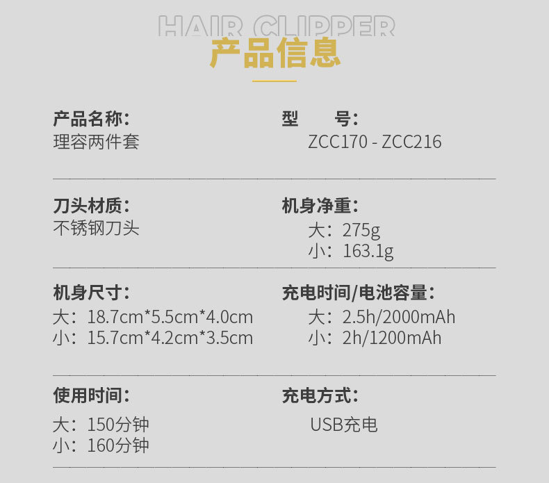 大款ZCC216:整机(配不锈钢刀头,含保护盖),限位梳8个,3-6-10-13-16-19-22-25MM, 数据线(黑色华为1M),黑色长毛刷,中性包装,英文说明书