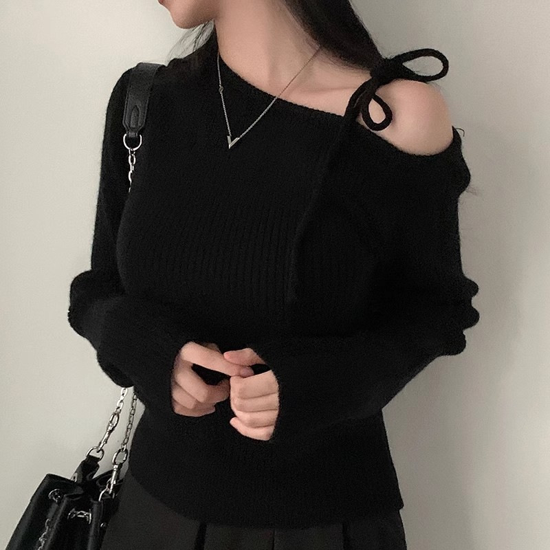 한국 스타일 아름다운 가을과 겨울 틈새 레트로 불규칙한 슬란 트 칼라 오픈 숄더 레이스 업 슬리밍 긴팔 니트 스웨터 여성용스토어 가기