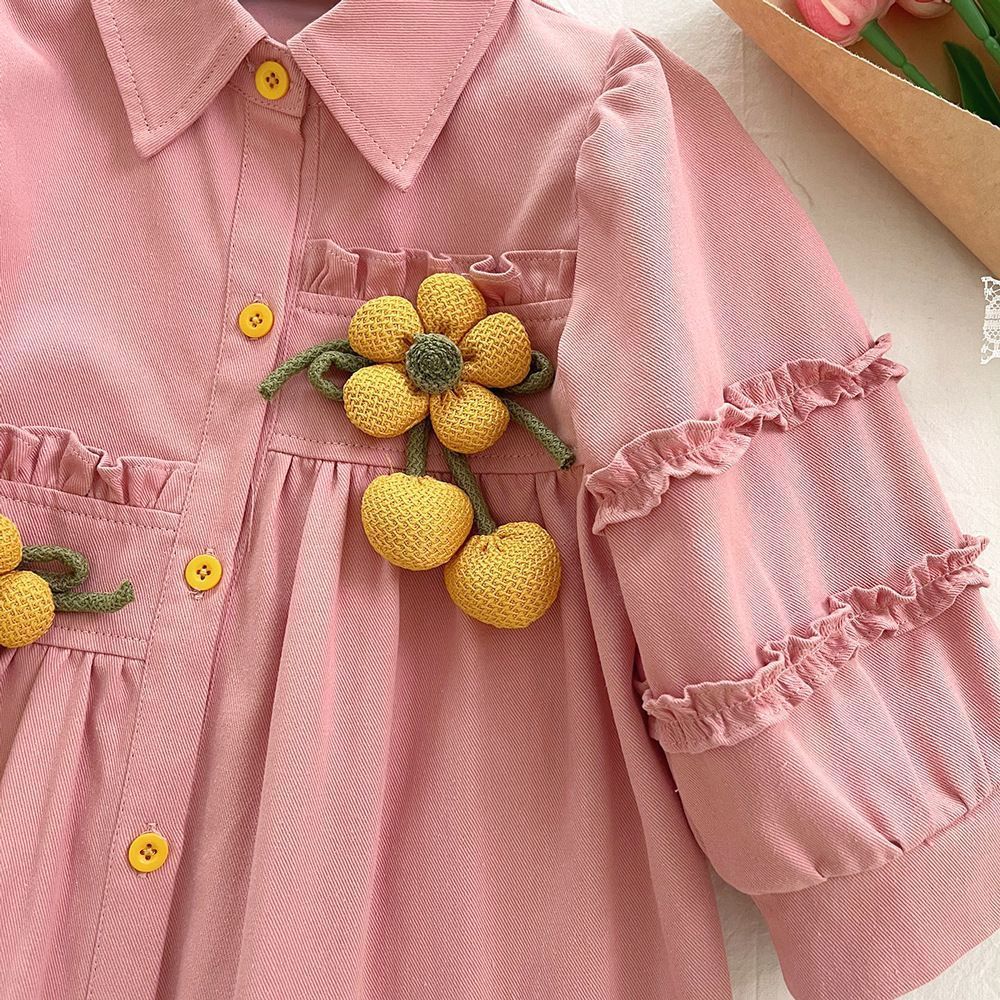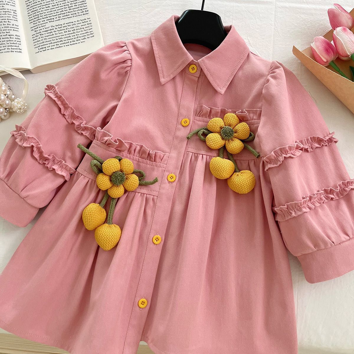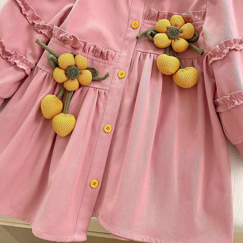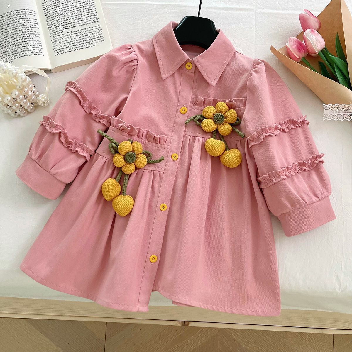 새로운 2025 봄 가을 한국 스타일 소녀 셔츠 원피스 소녀의 3 차원 해바라기 긴 소매 원피스 트렌디스토어 가기