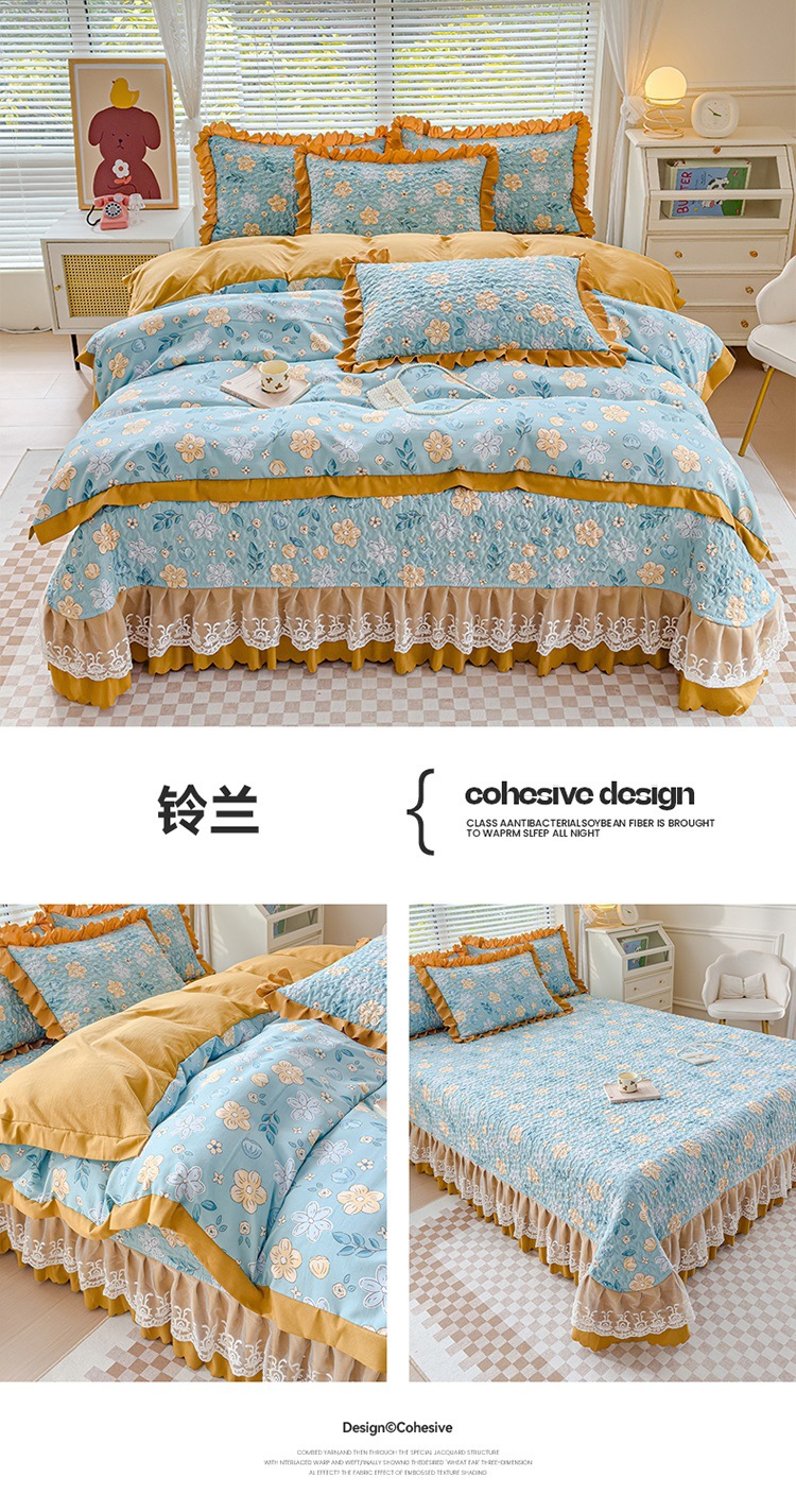 2025형 이중 거즈 워시드 코튼 린넨 침대 커버 4종 세트, 누빔 프린트 레이스 침대 커버