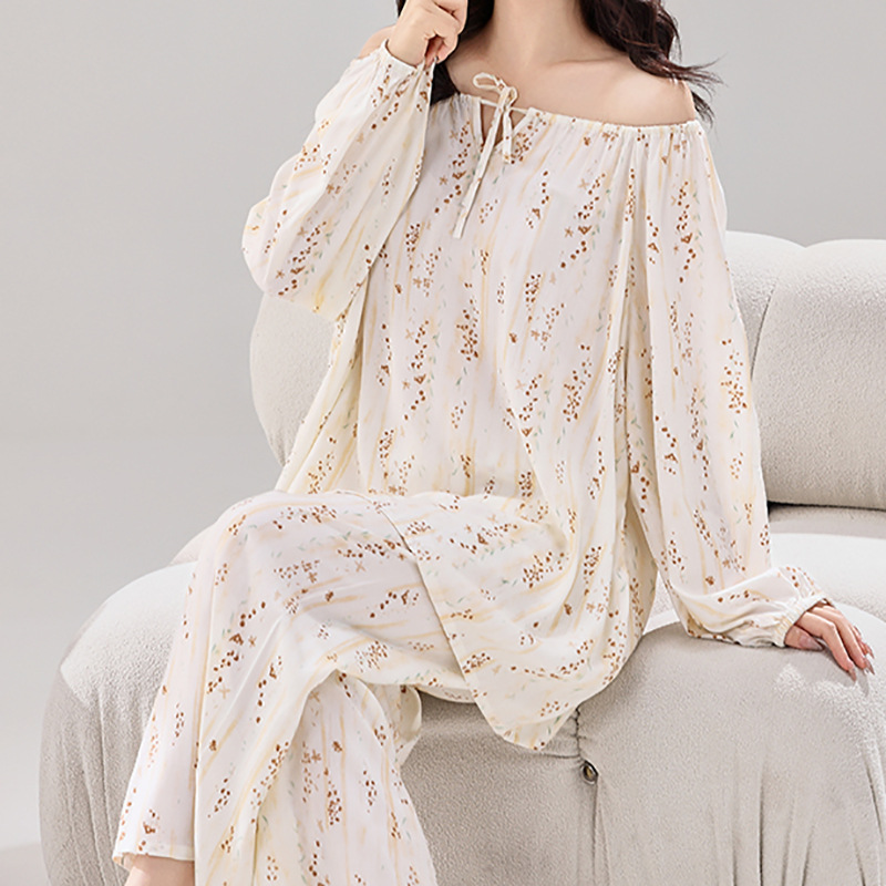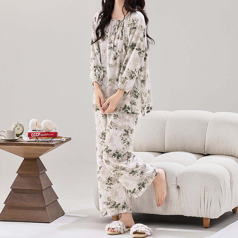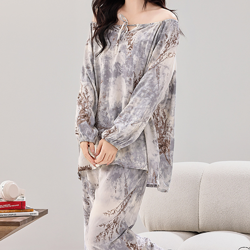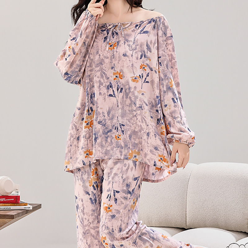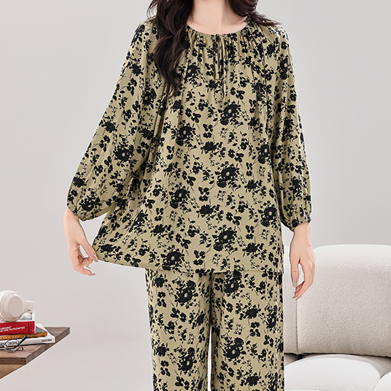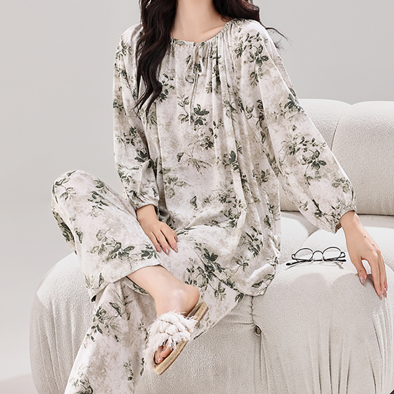 여성용 실크 파자마 대형 스타일 부드럽고 편안한 칼라 레이스 로프 우아한 새 긴 소매 바지 홈 의류