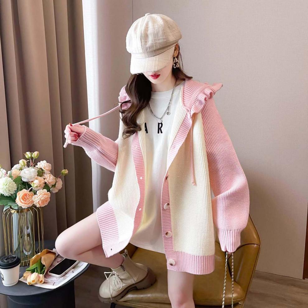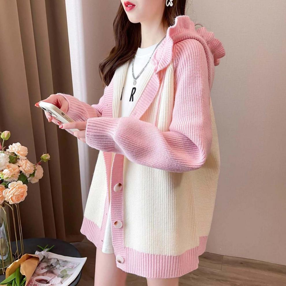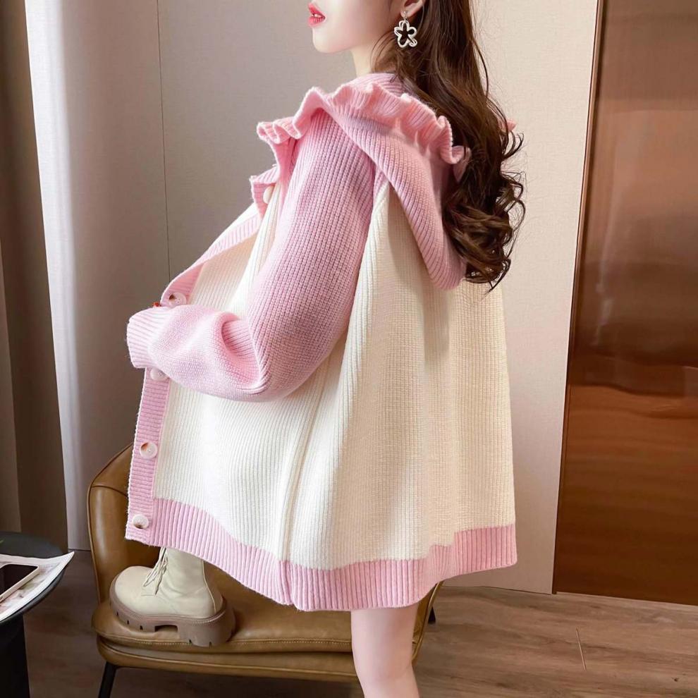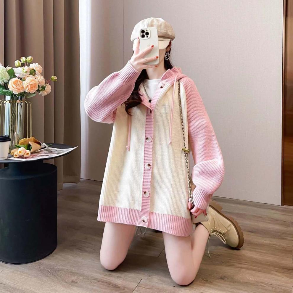 플러스 사이즈 지방 mm200 kg 인형 후드 니트 오픈 여성용 셔츠 가을과 겨울 2024 새로운 느슨한 연령 감소 스웨터 코트스토어 가기