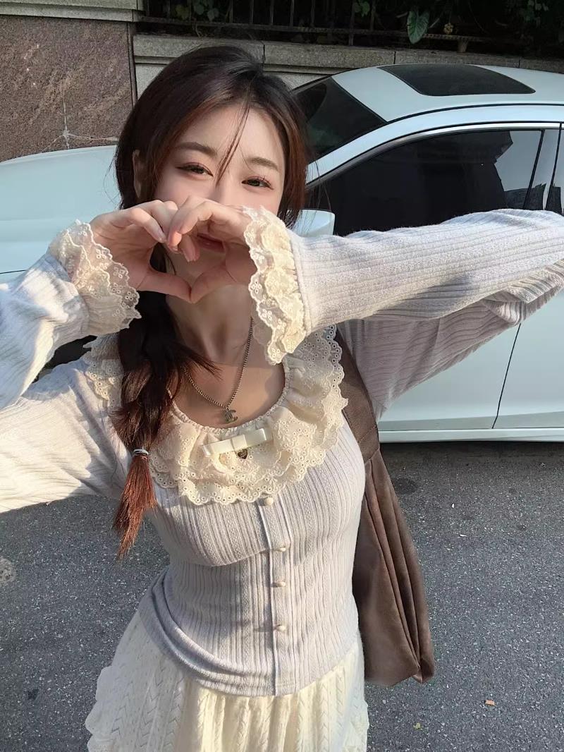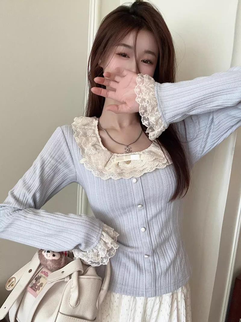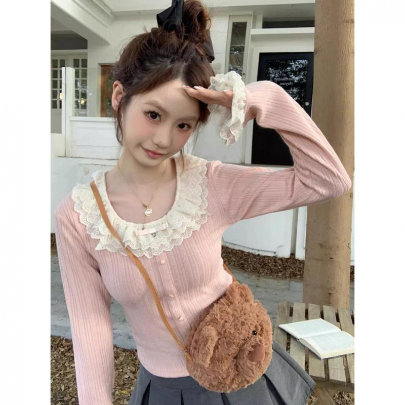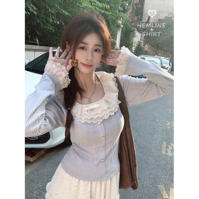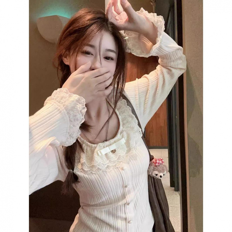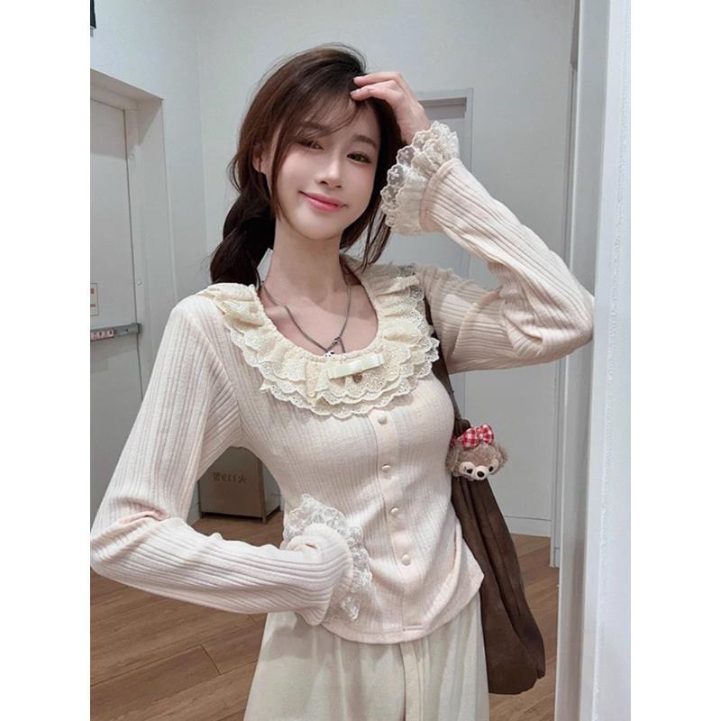 달콤한 디자인 센스 레이스 긴팔 티셔츠 여성용 봄 2024 새로운 올 매치 슬림핏 쇼트베이스 탑스토어 가기