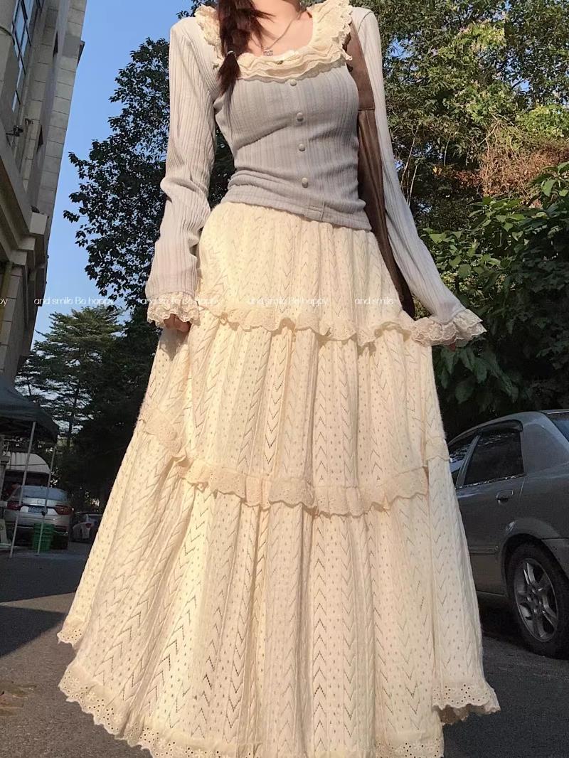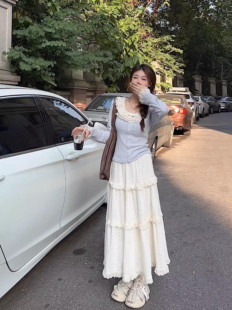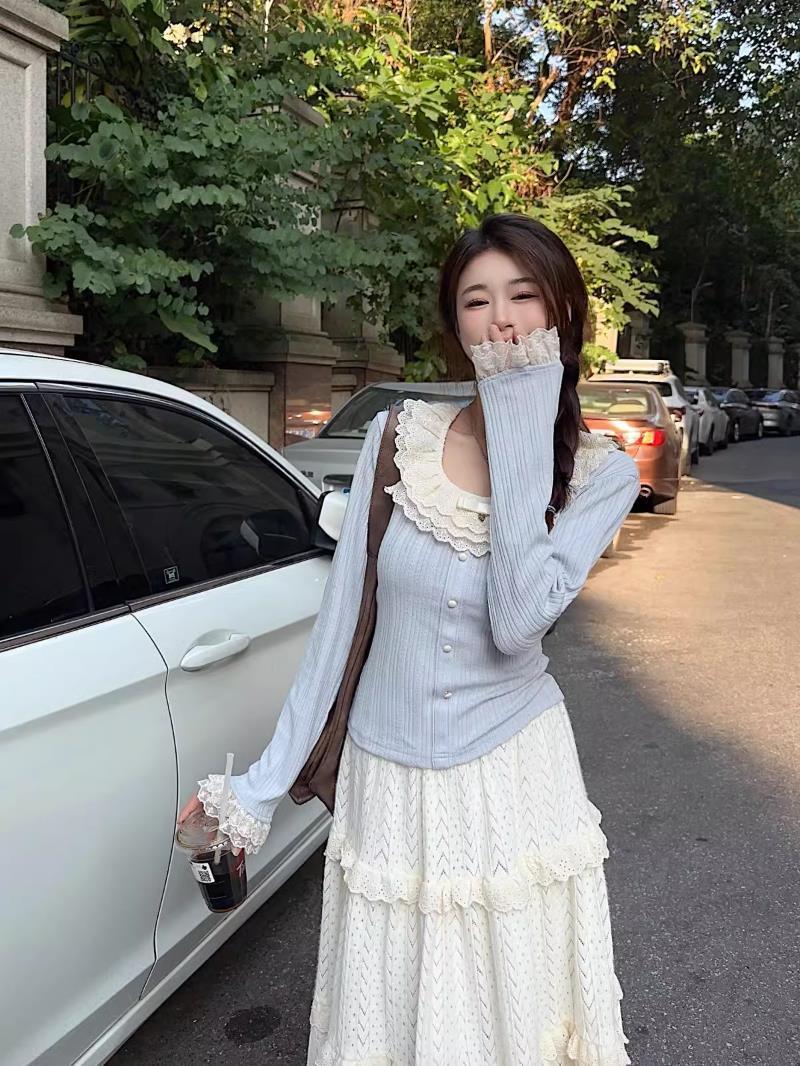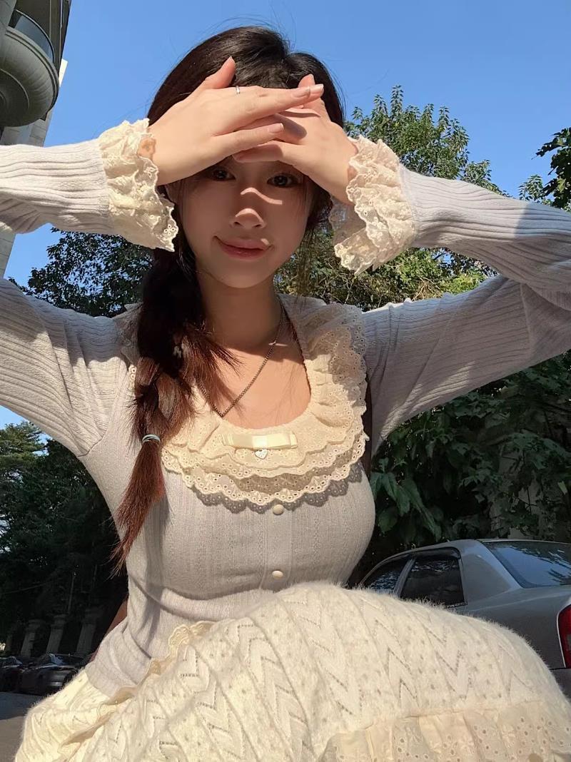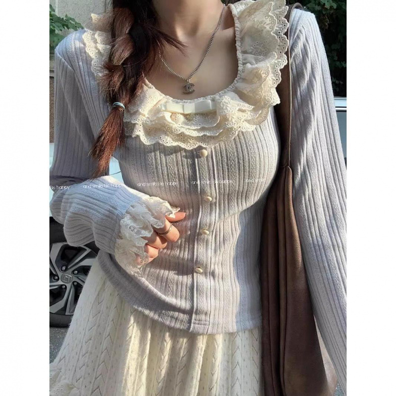 달콤한 디자인 센스 레이스 긴팔 티셔츠 여성용 봄 2024 새로운 올 매치 슬림핏 쇼트베이스 탑스토어 가기