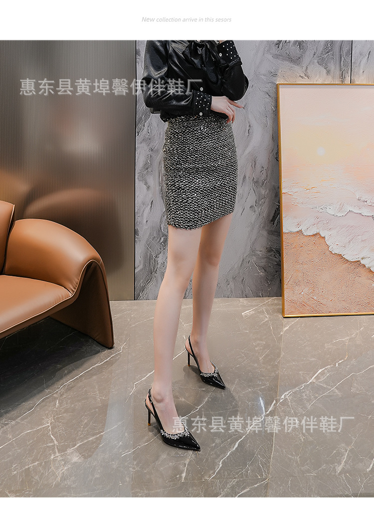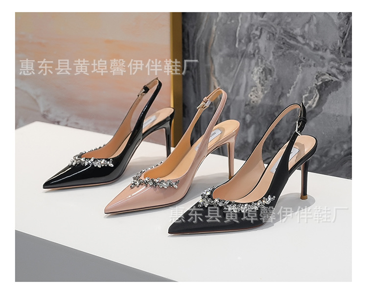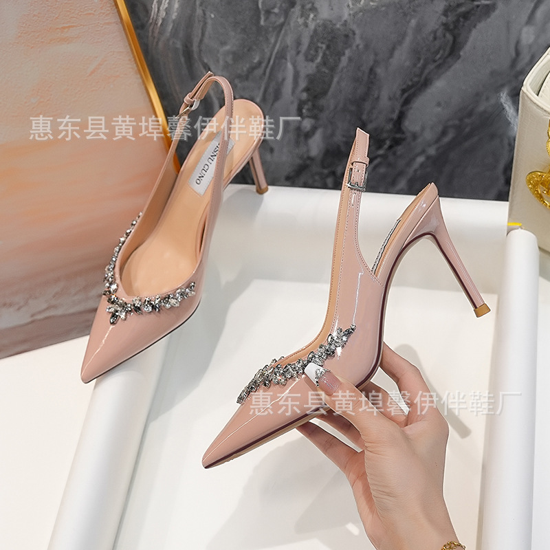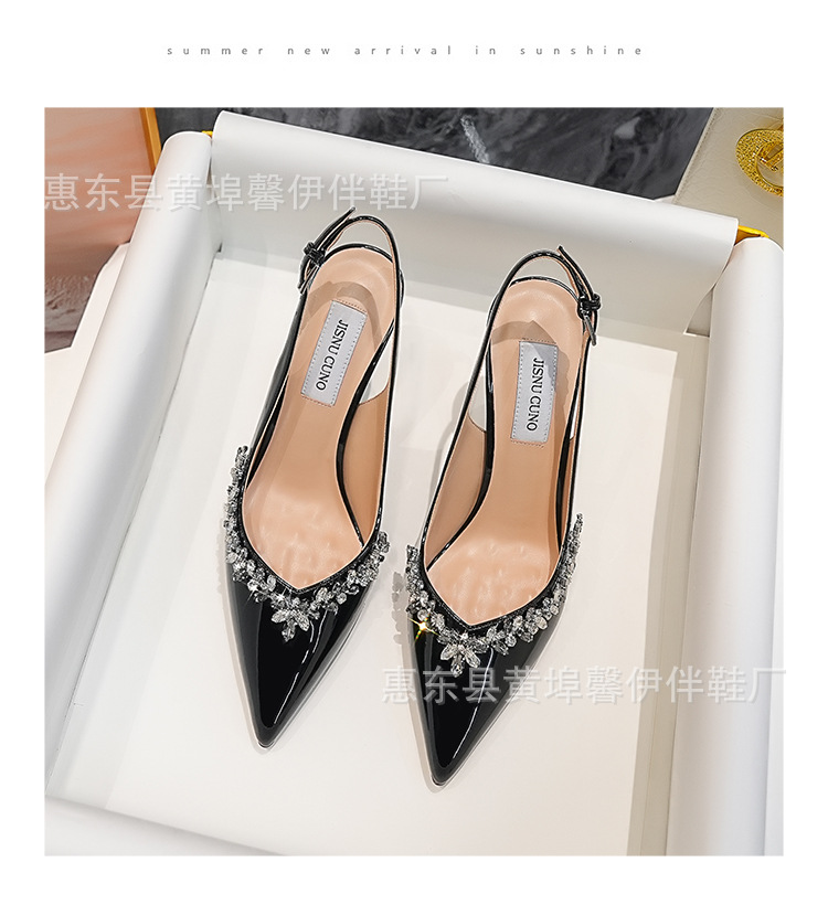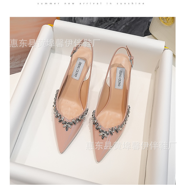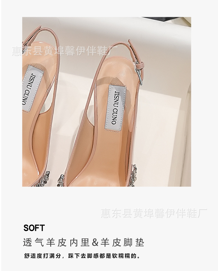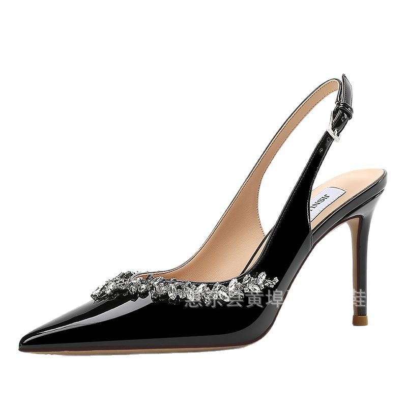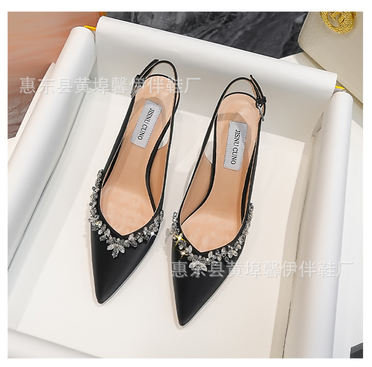 2025 년 봄과 여름 JC 새로운 뾰족한 블랙 라인스톤 하이힐 여성용 샌들 스틸레토 힐 얕은 입 아름다운 누드 신발스토어 가기