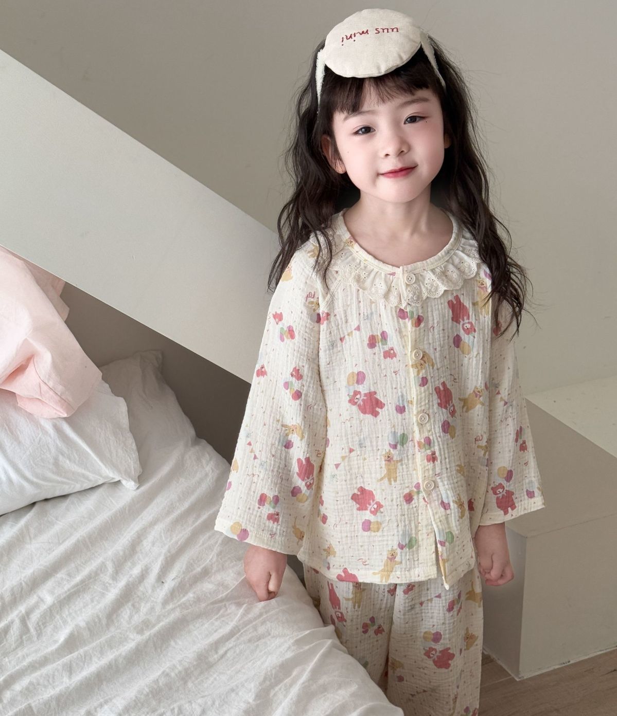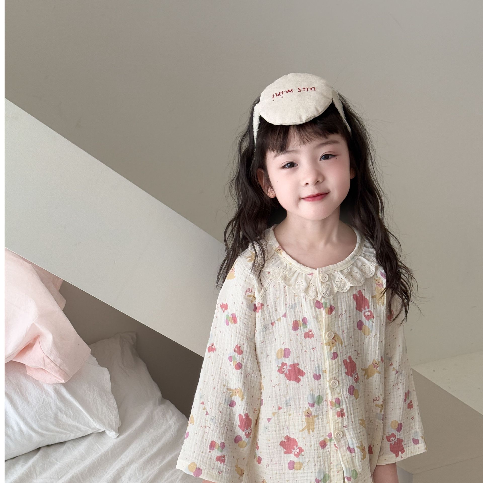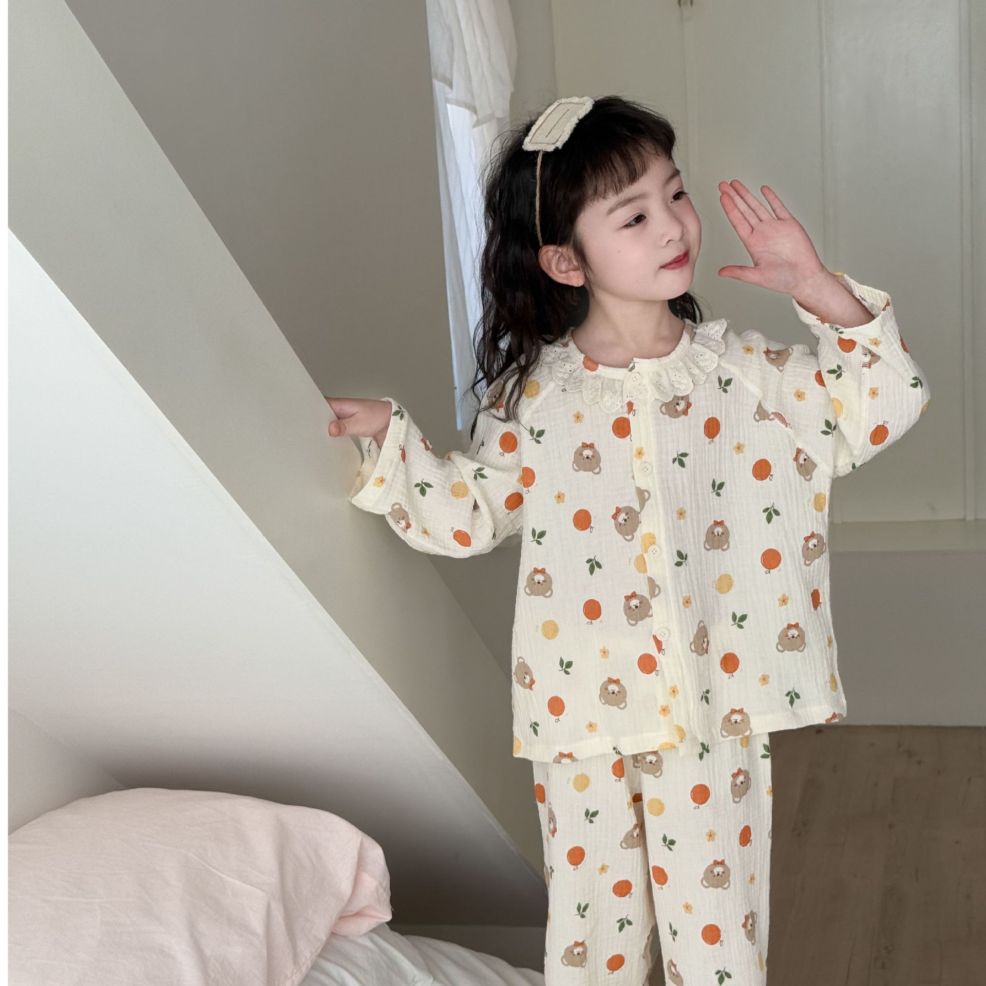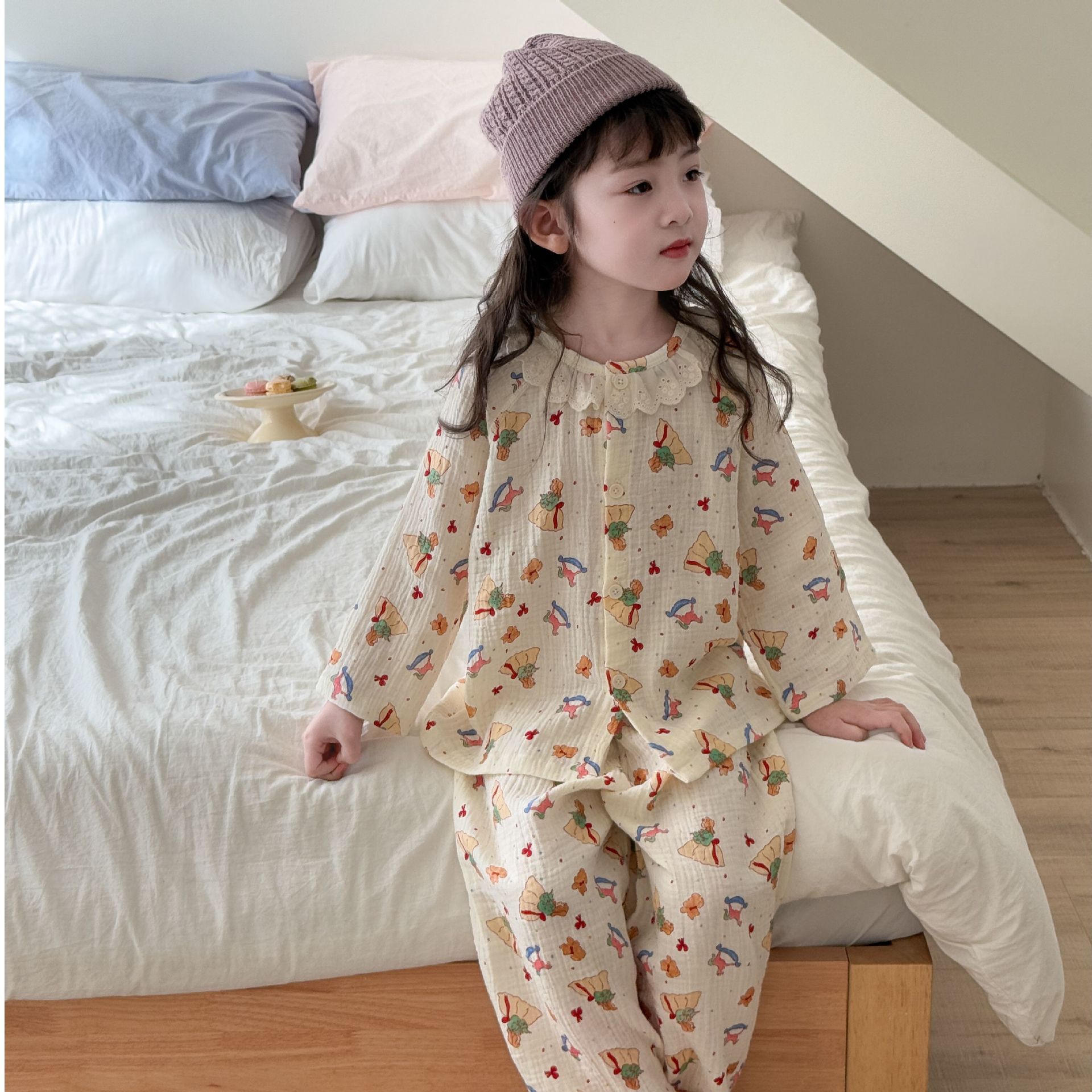 순면 어린이 잠옷 세트 집 옷 긴 소매 꽃 소녀의 달콤한 사이버 연예인 부모-아이 잠옷 세트 느슨한스토어 가기