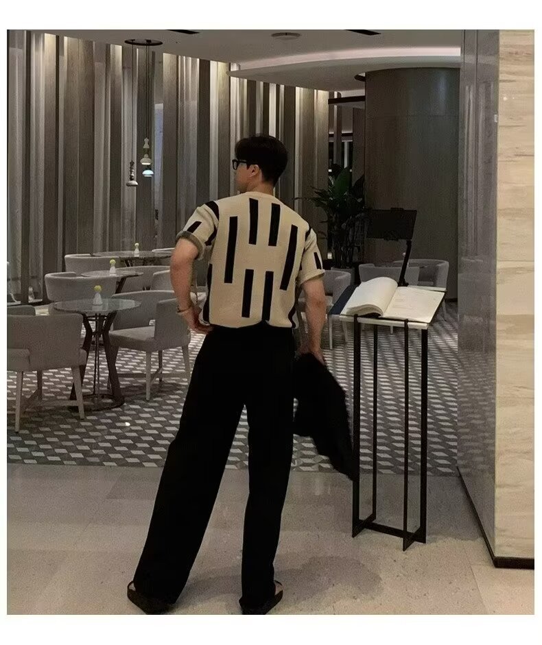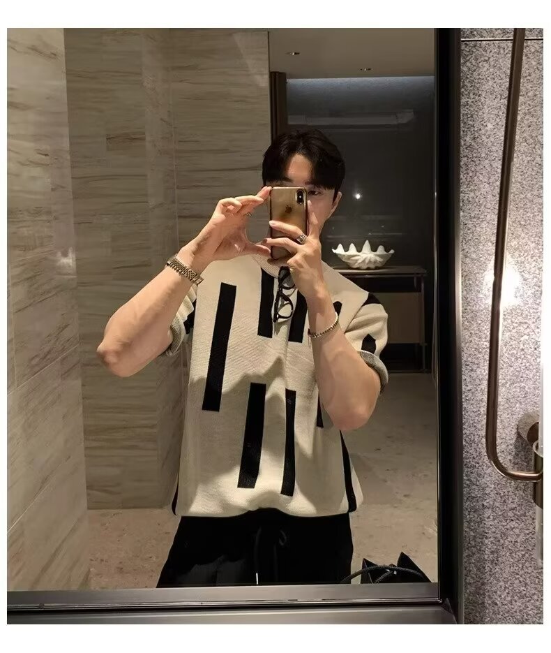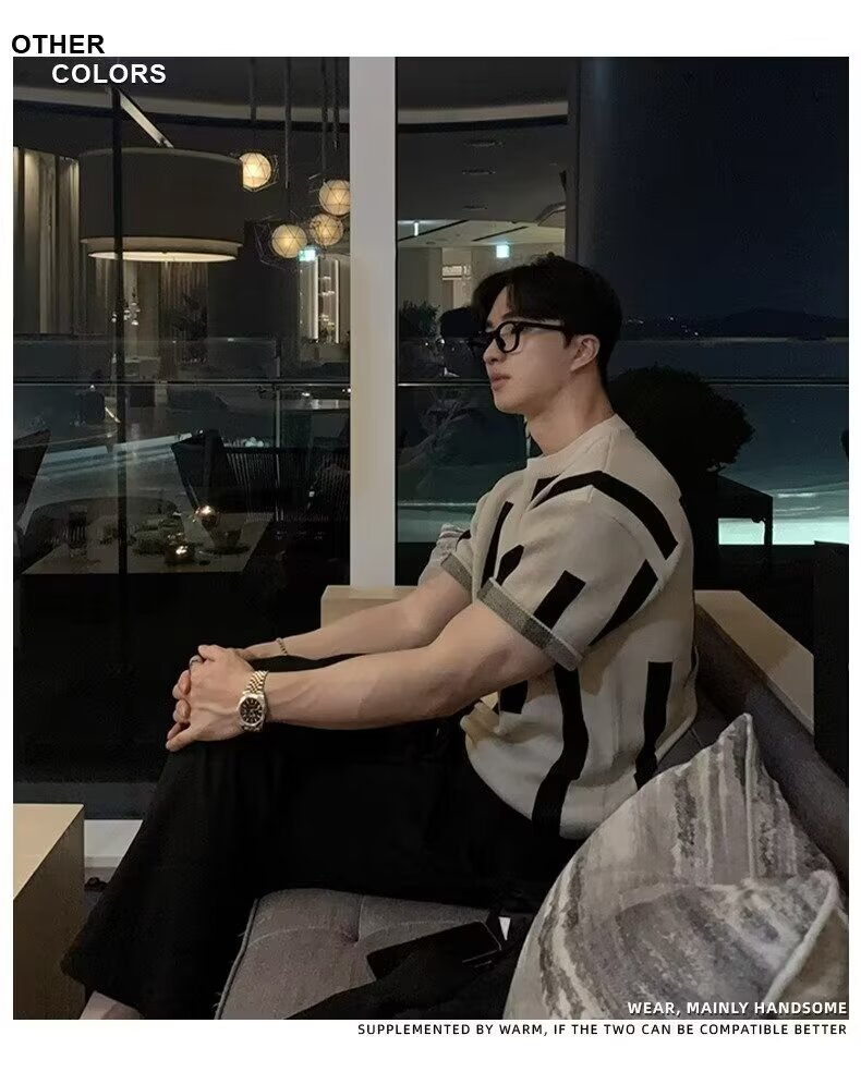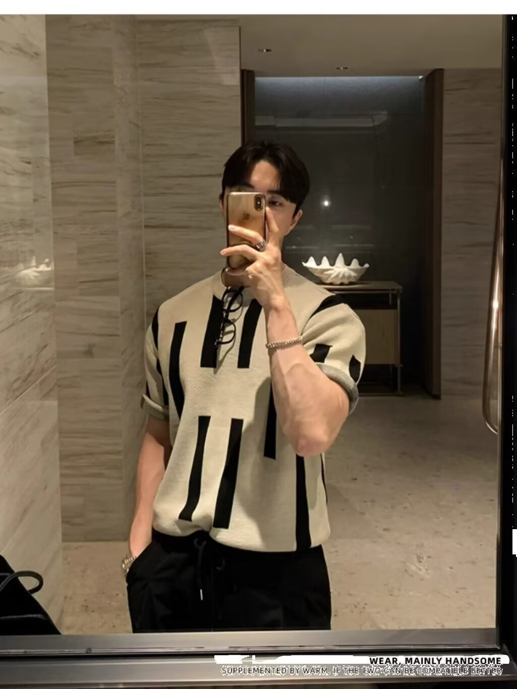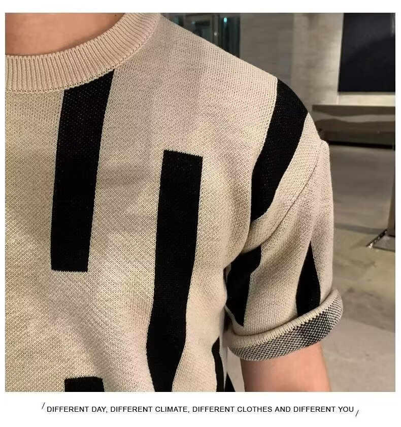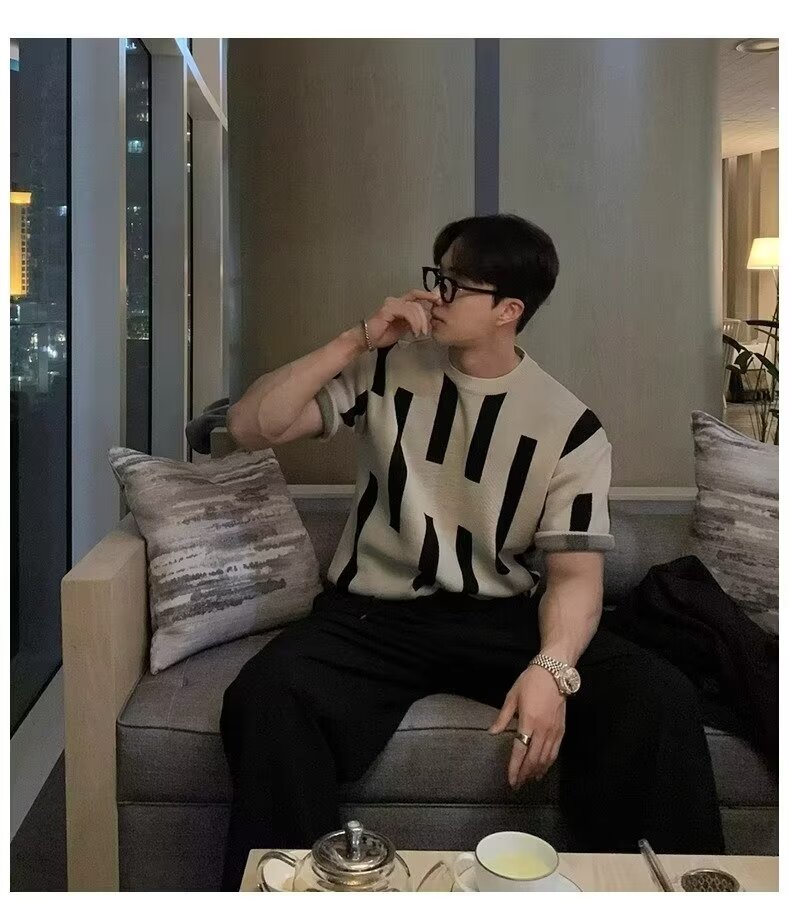 고급 센스 다크 스트라이프 크루 넥 반팔 유행 남자 올 매치 내베이스 셔츠 남자 봄과 여름 반팔 스웨터