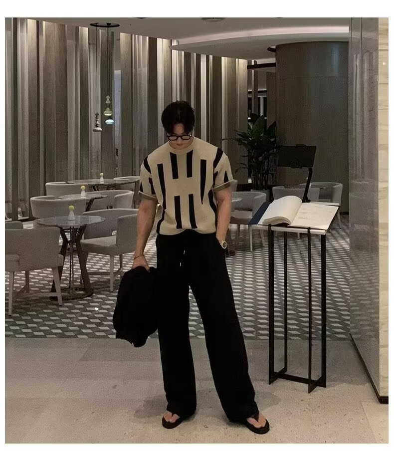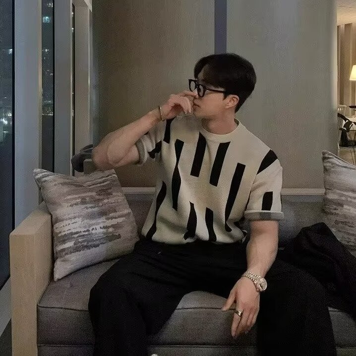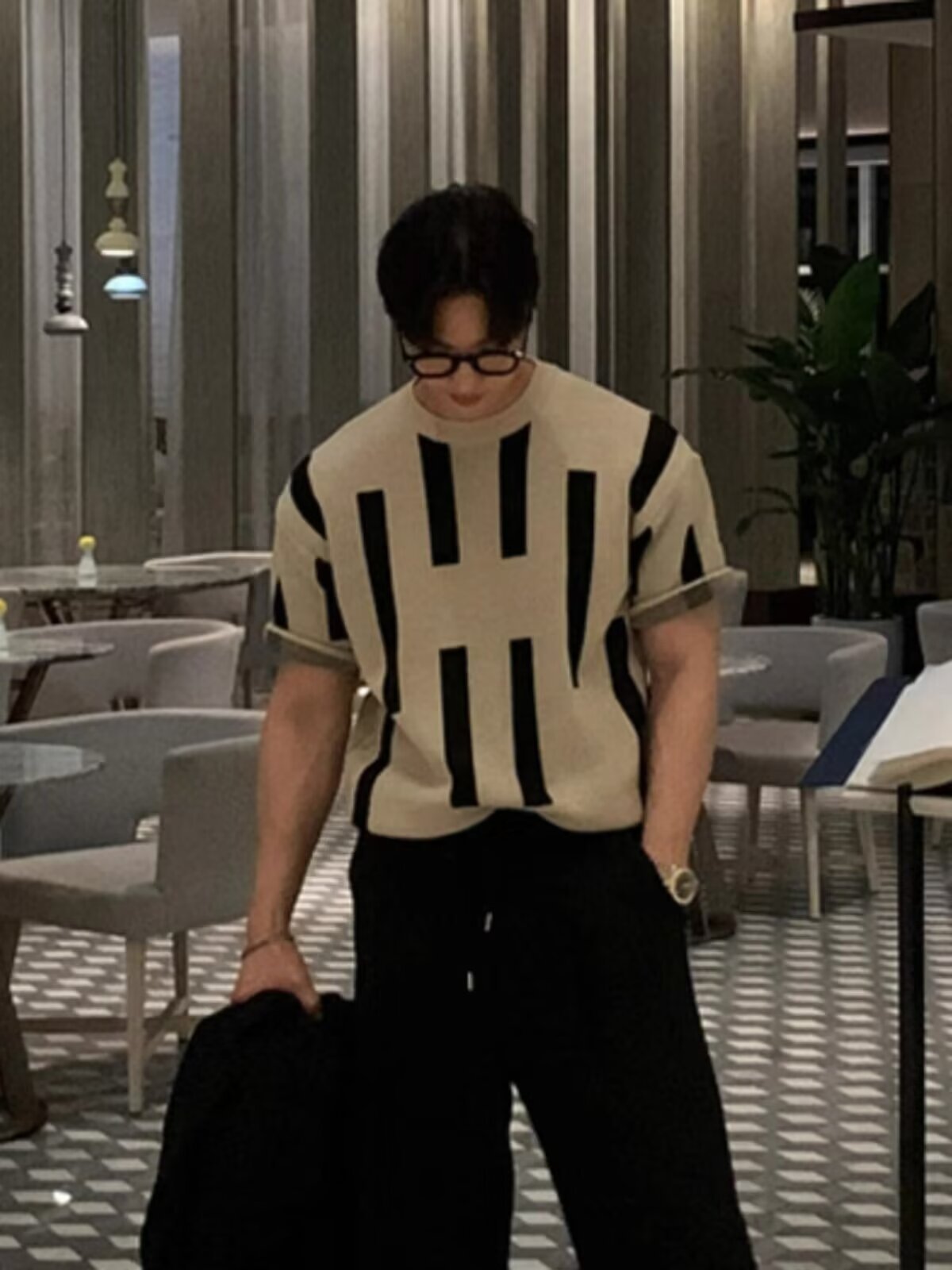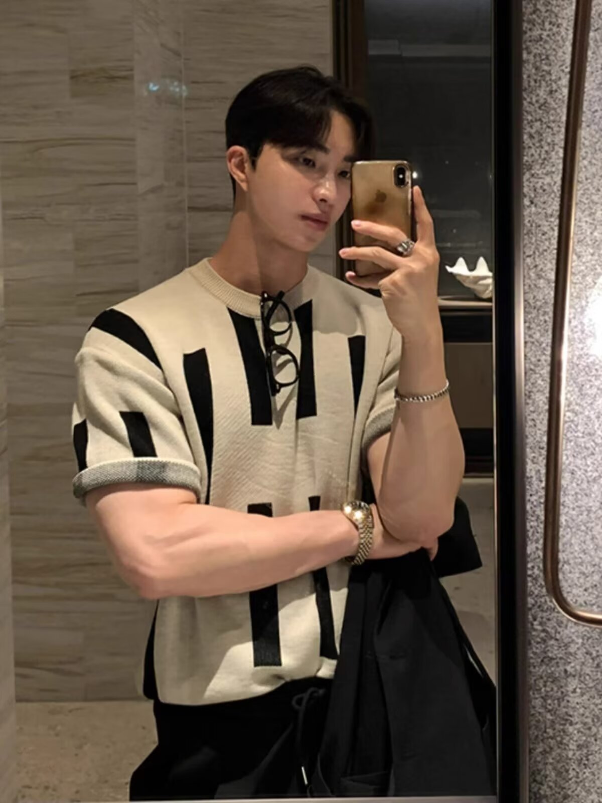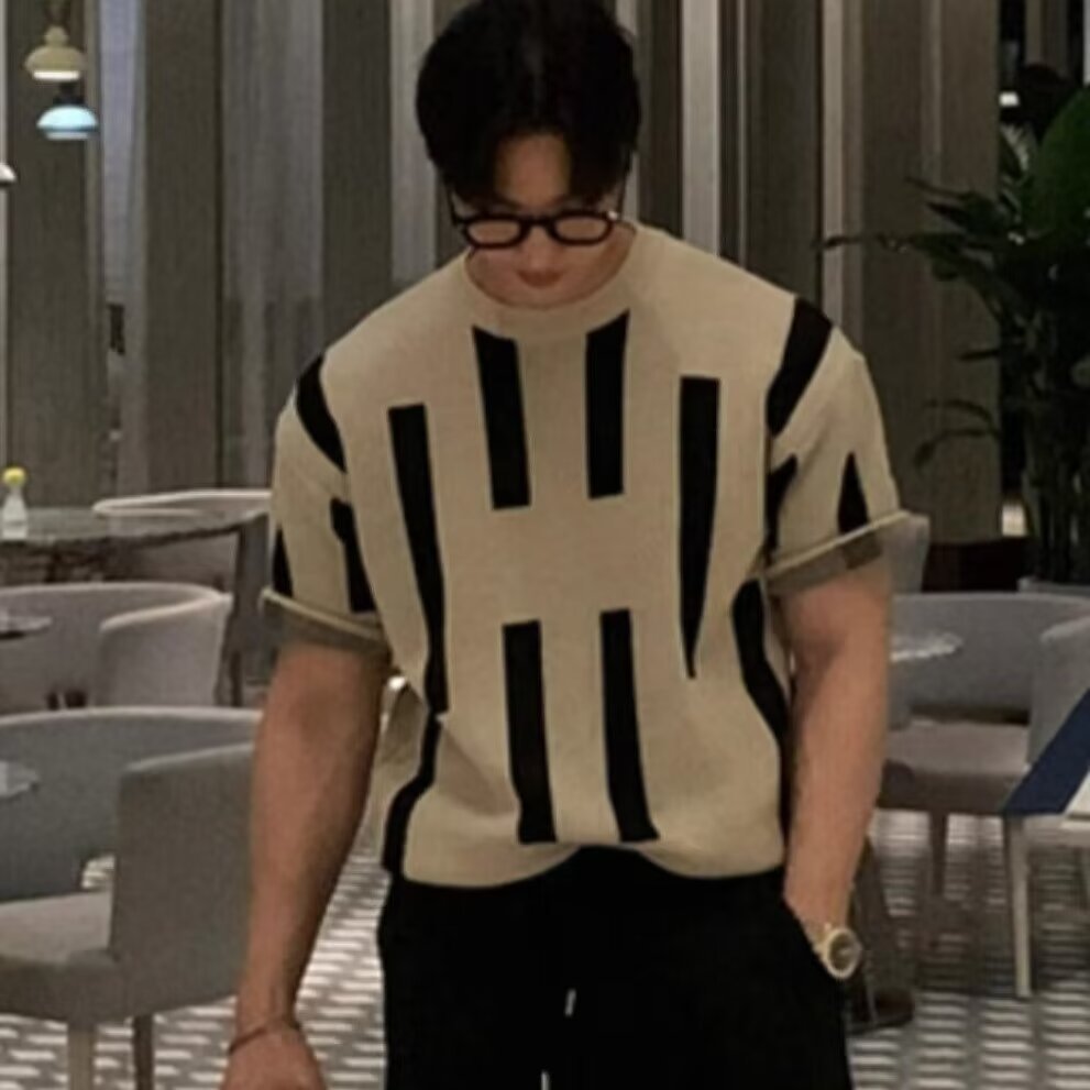 고급 센스 다크 스트라이프 크루 넥 반팔 유행 남자 올 매치 내베이스 셔츠 남자 봄과 여름 반팔 스웨터스토어 가기