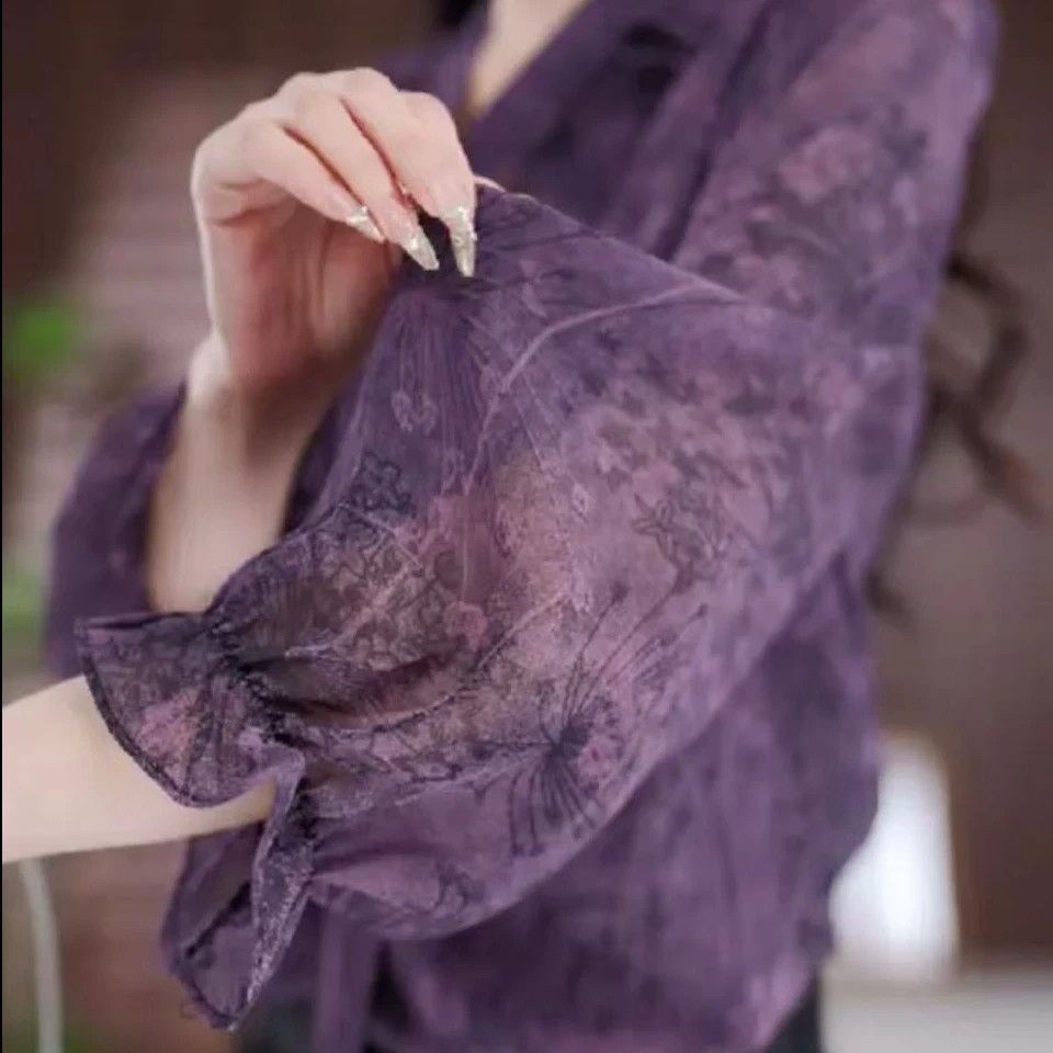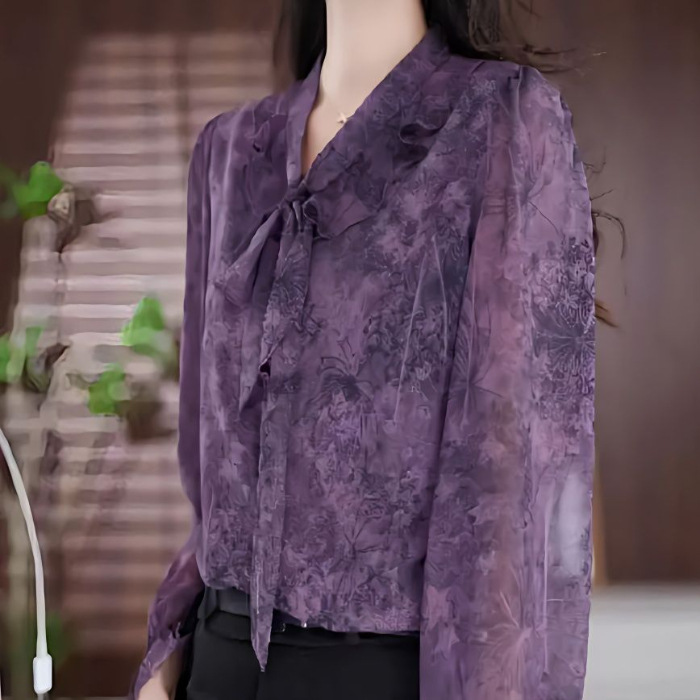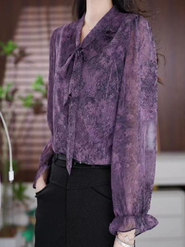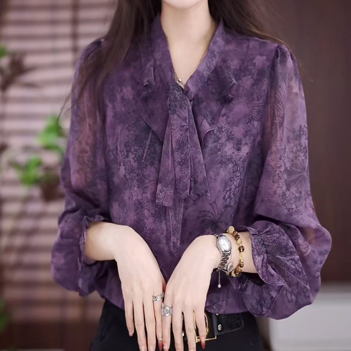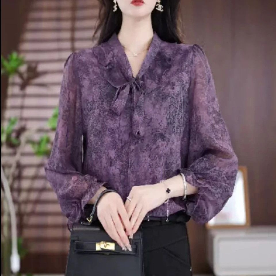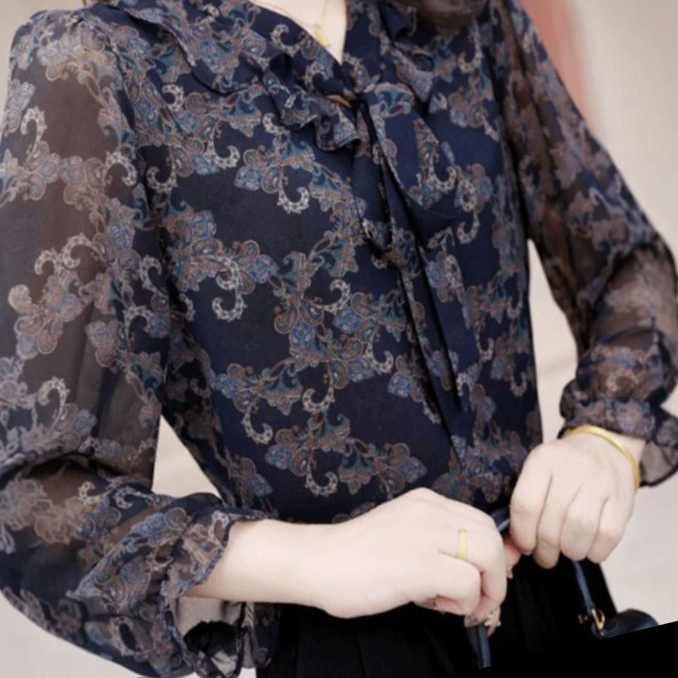2025 작은 셔츠 새로운 봄 최고 패션 세련된 활 인쇄 셔츠 우아한 여성의 긴 소매 쉬폰 셔츠스토어 가기