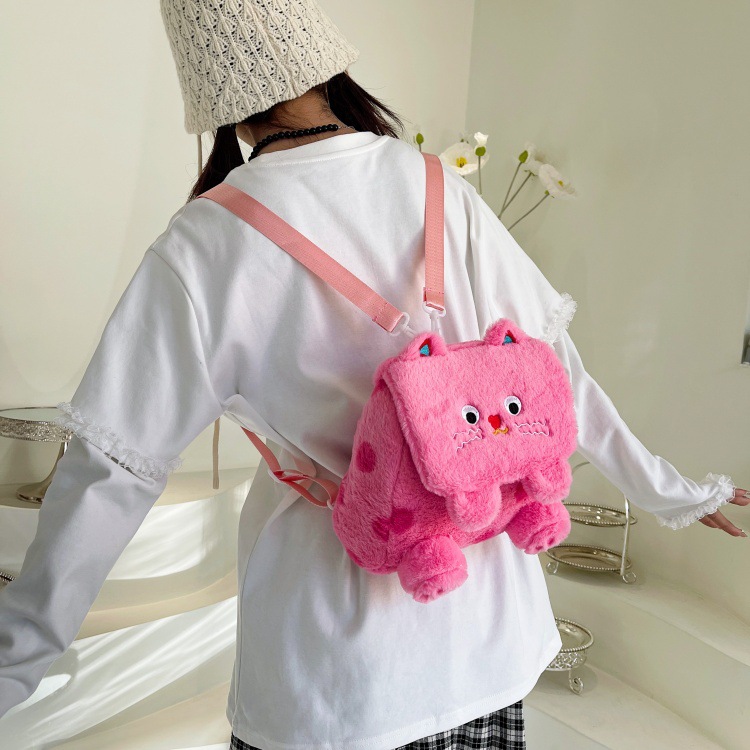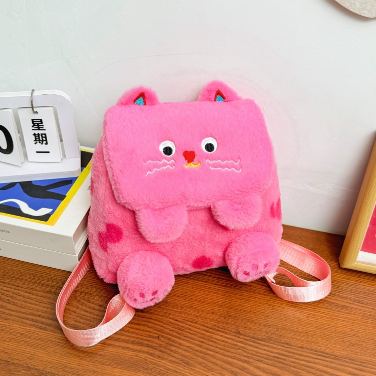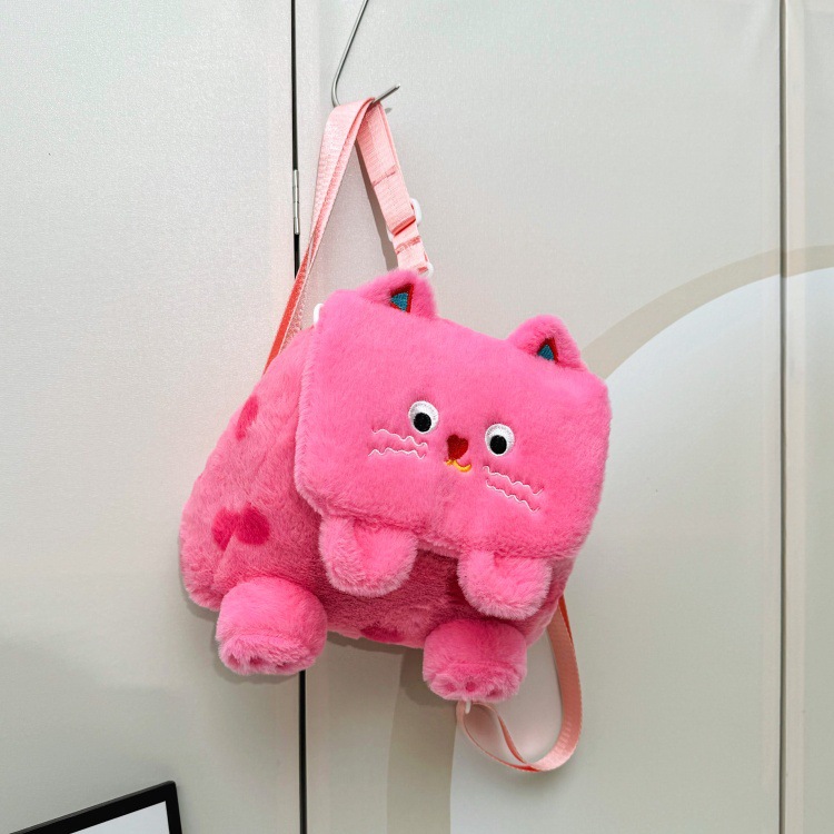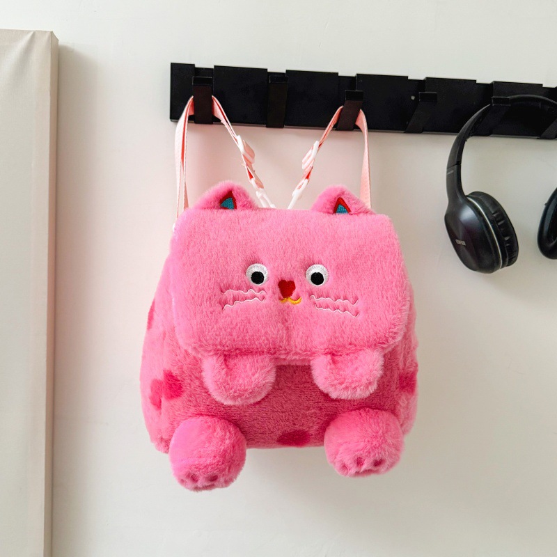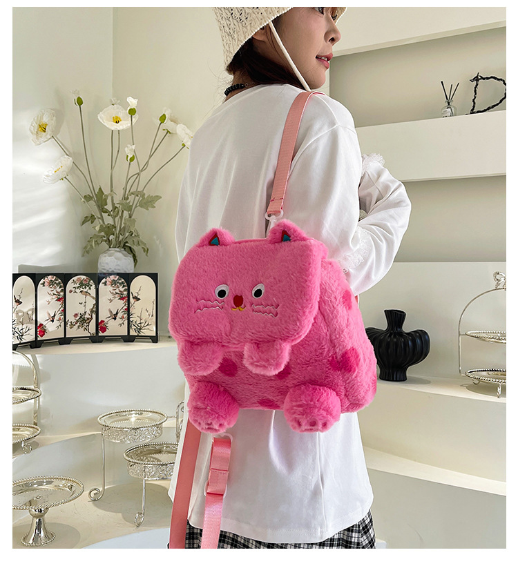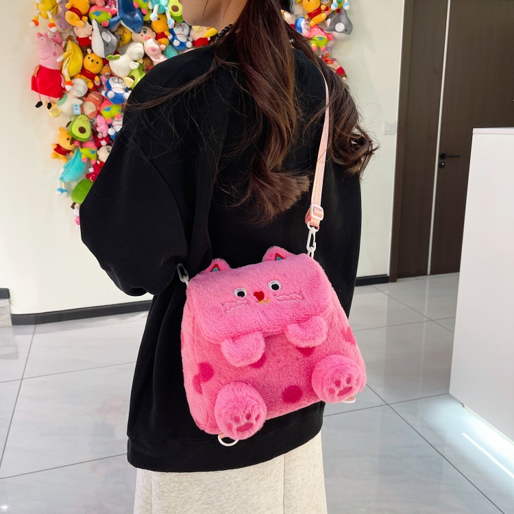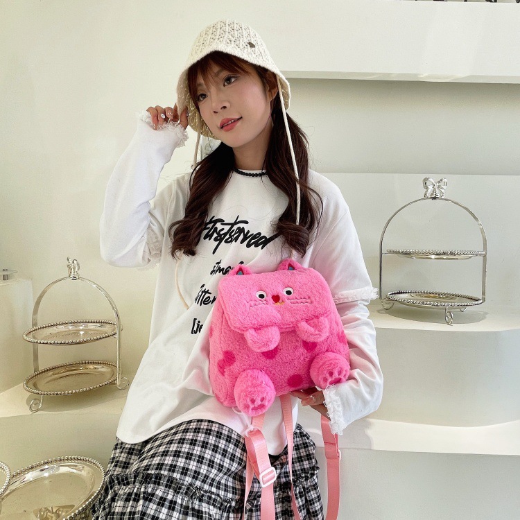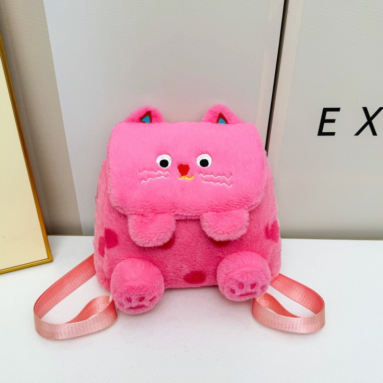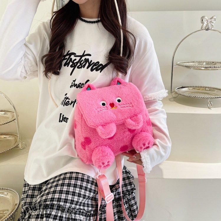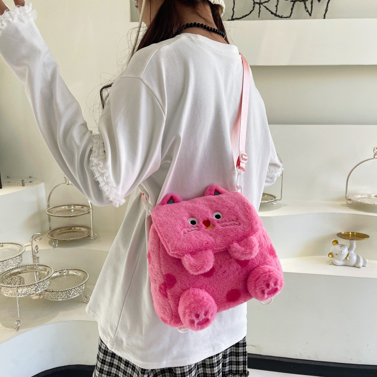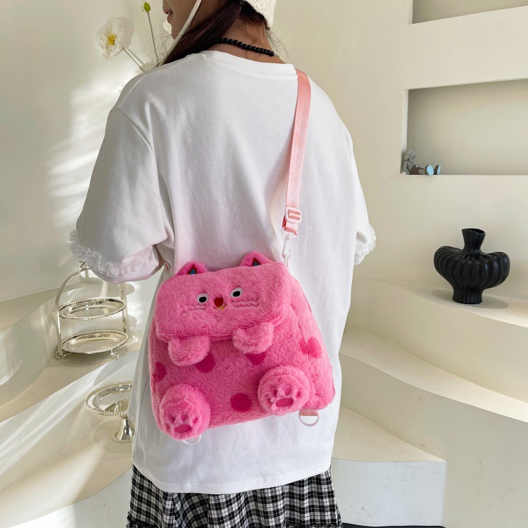 자수 일본식 여성용 크로스백 핑크색 귀여운 어린이 물방울 무늬 플러시 백팩 만화 고양이 인형 가방