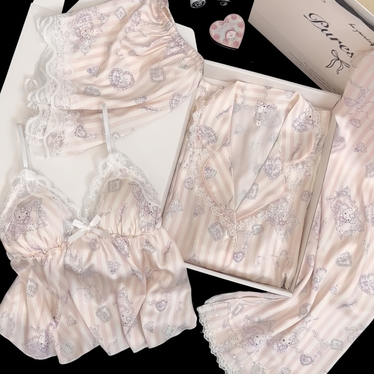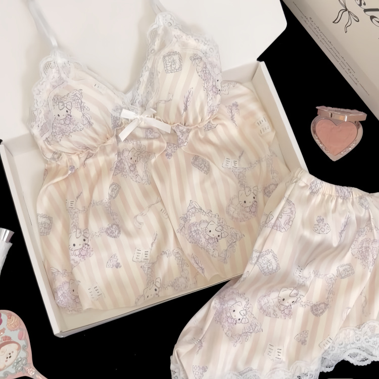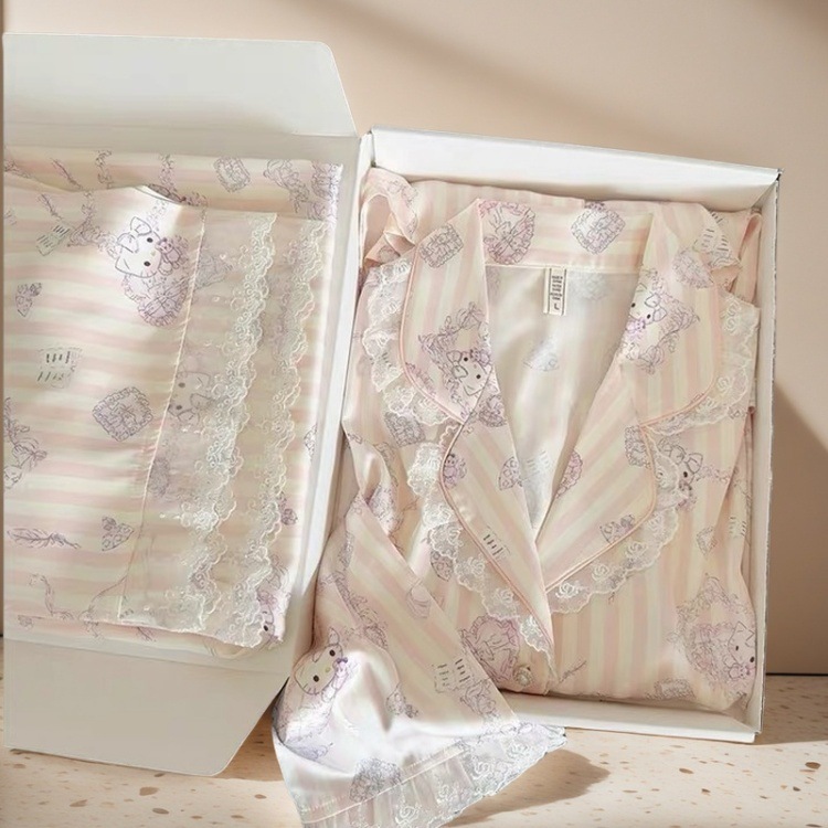 헬로 키티 아이스 실크 잠옷 여성의 봄과 가을 2025 새로운 높은 기질 아이스 실크 홈 의류 세트스토어 가기