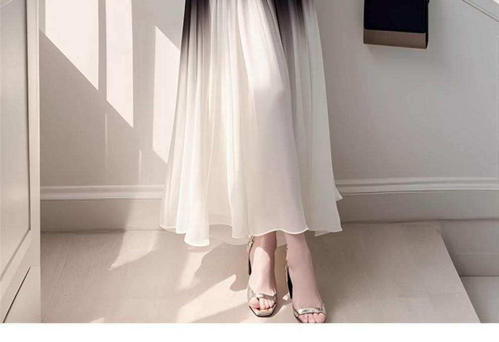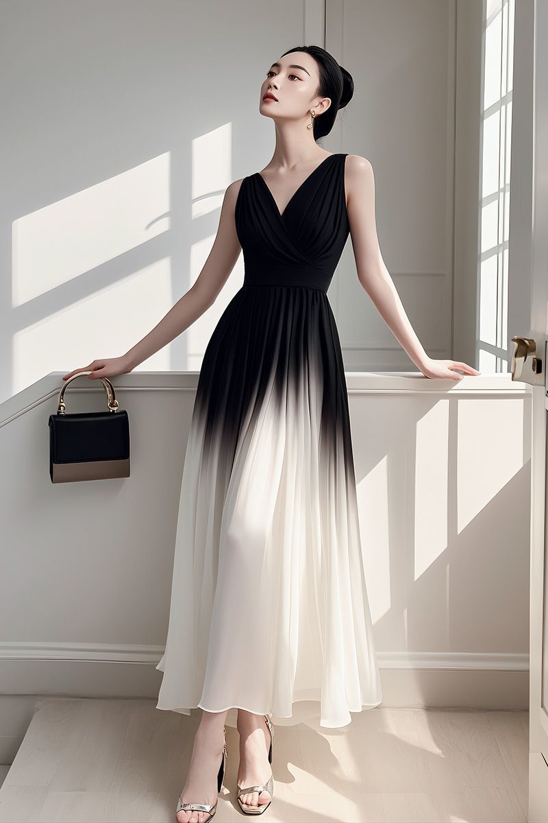 니치 비 범핑 흑백 그라디언트 민소매 원피스 여성 여름 독특한 아름다운 프랑스 기질 쉬폰 긴 스커트