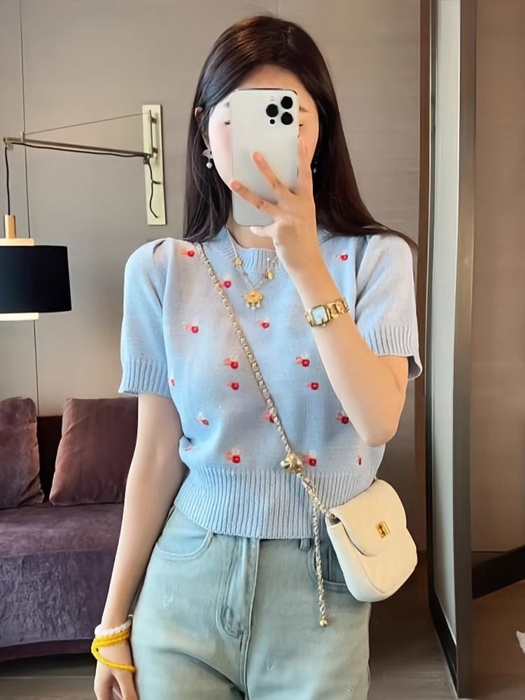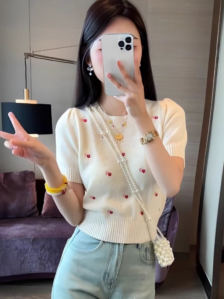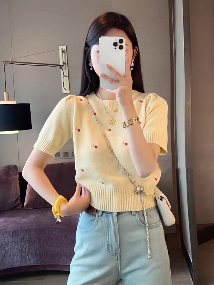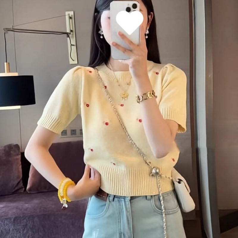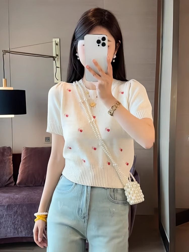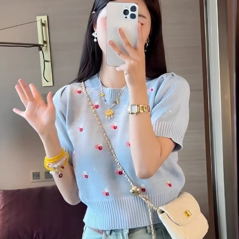 흰색 자수 꽃 둥근 목 짧은 소매 니트 스웨터 여성의 2025 새로운 폭발 여름 우아한 짧은 니트 탑
