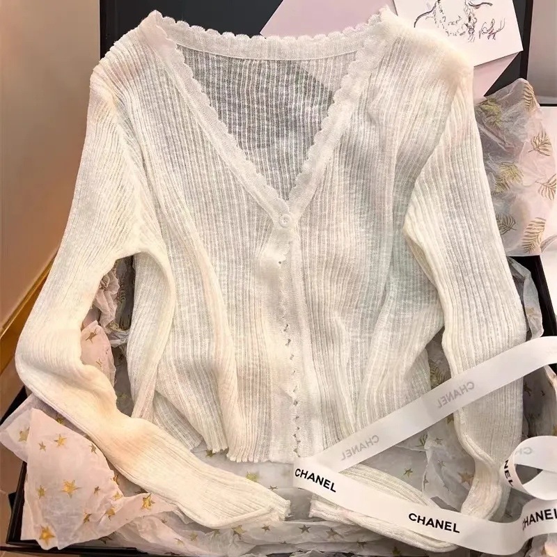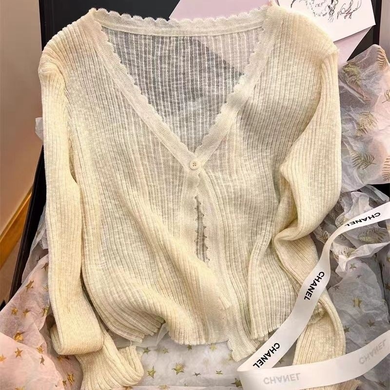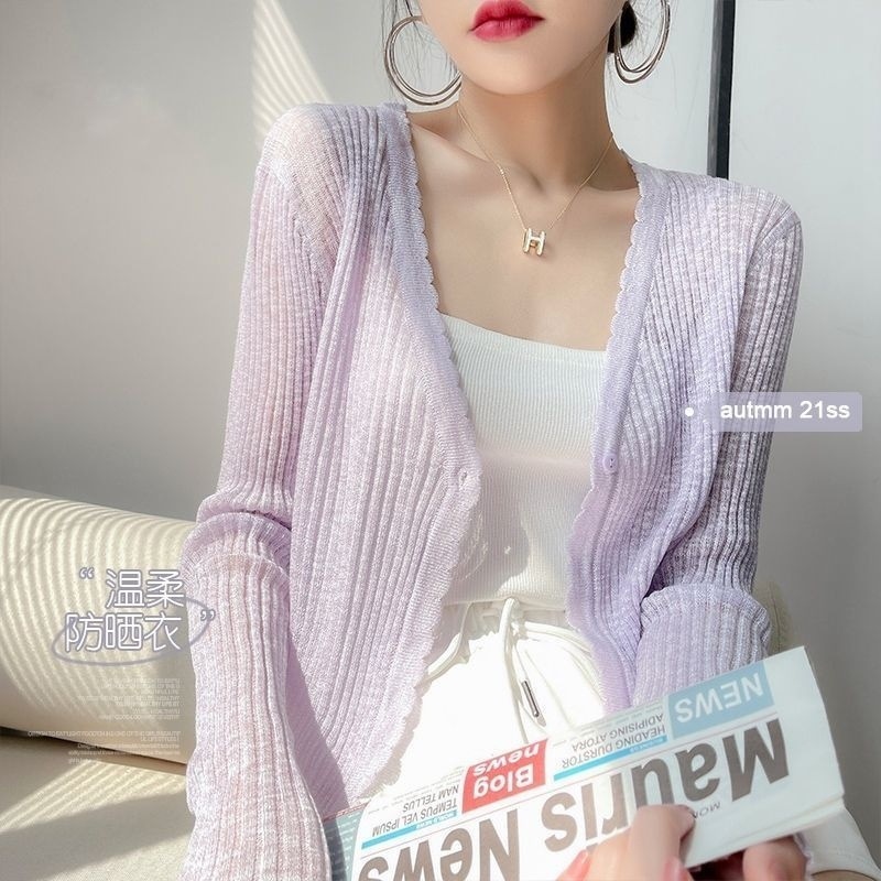 선스크린 카디건 쇼트 코트 여성용 아이스 실크 니트 긴 소매 여름 V-Neck 외부 목도리 에어컨 셔츠 탑 뉴스토어 가기