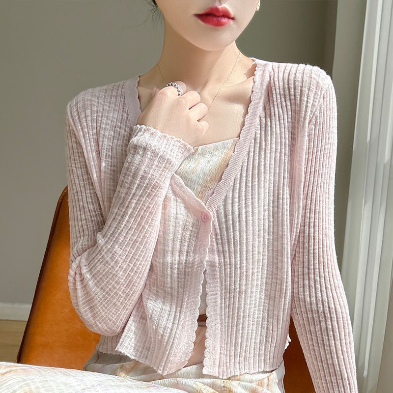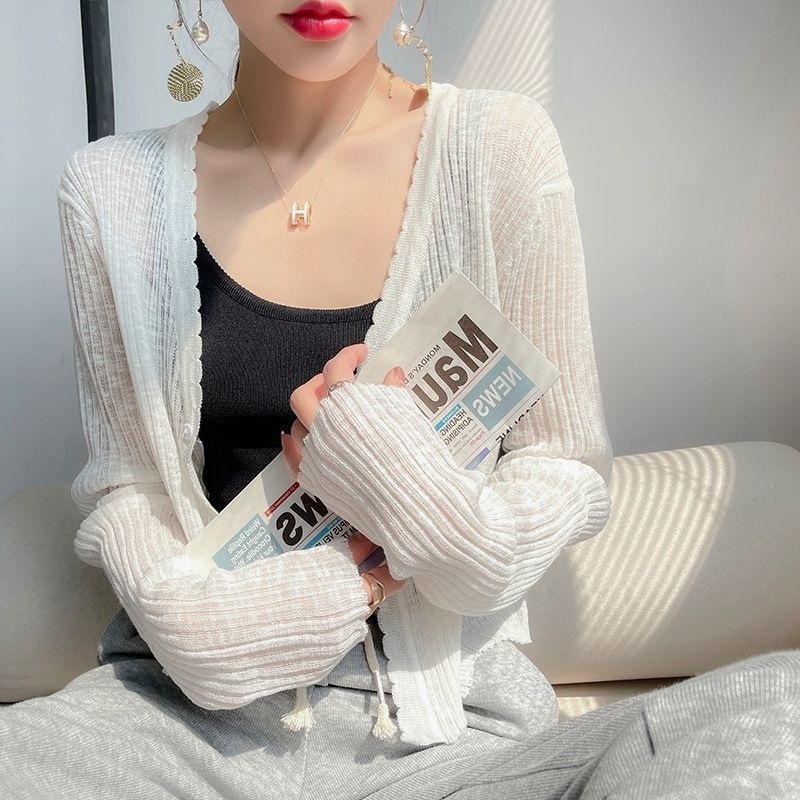 선스크린 카디건 쇼트 코트 여성용 아이스 실크 니트 긴 소매 여름 V-Neck 외부 목도리 에어컨 셔츠 탑 뉴