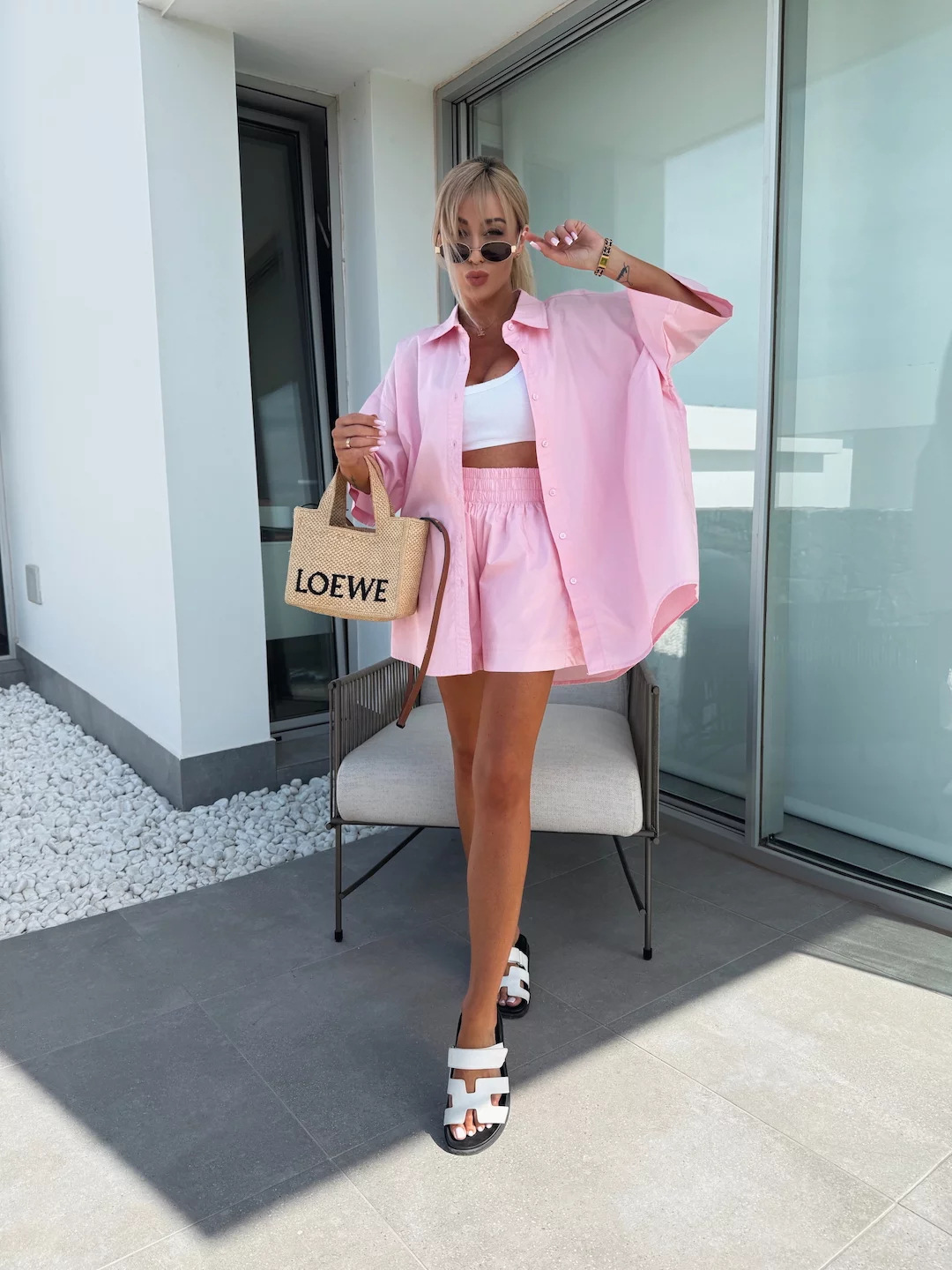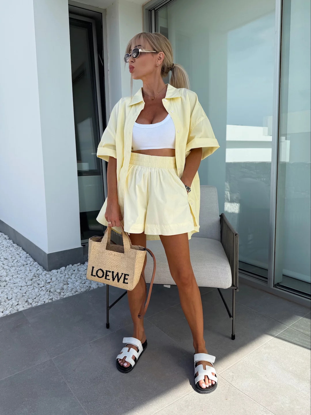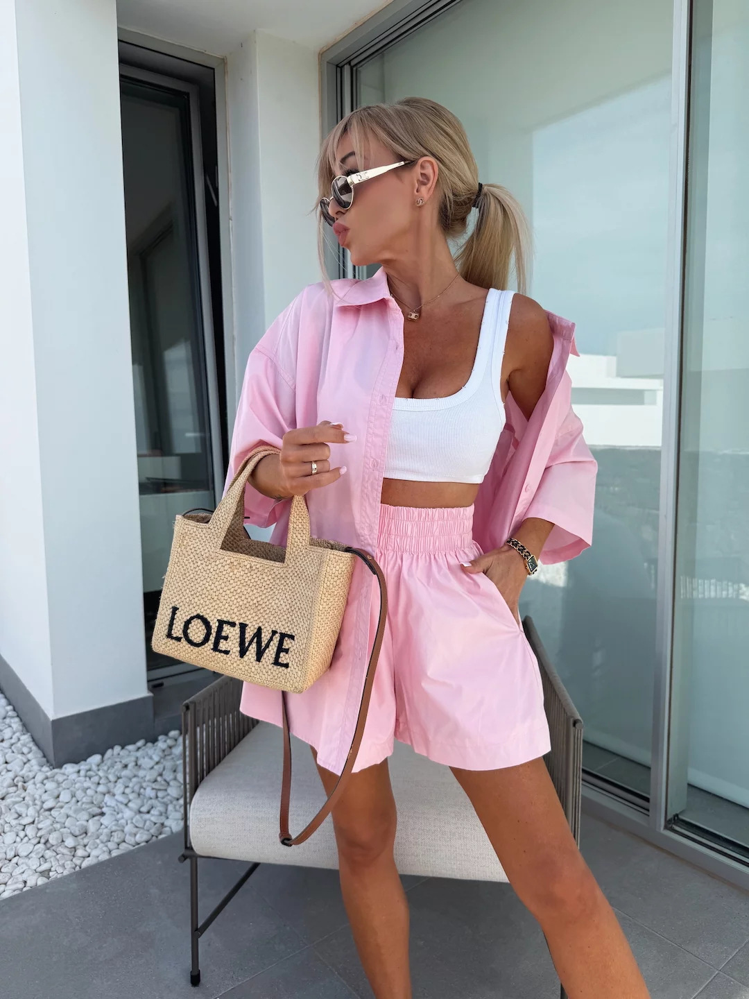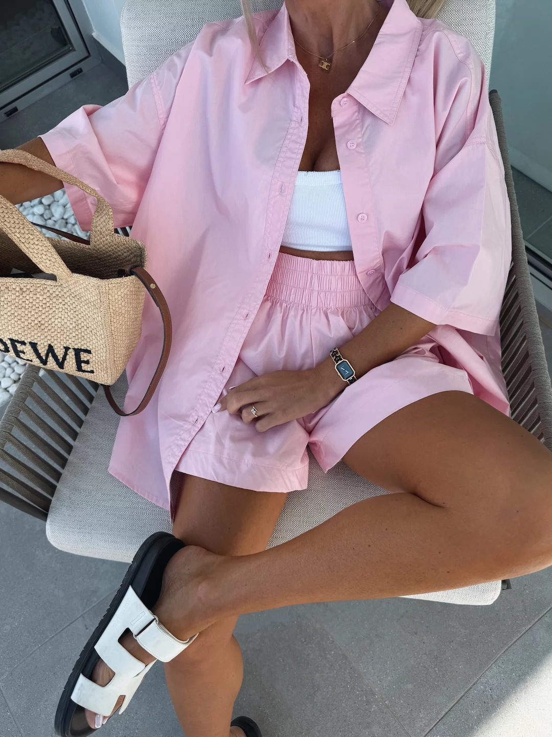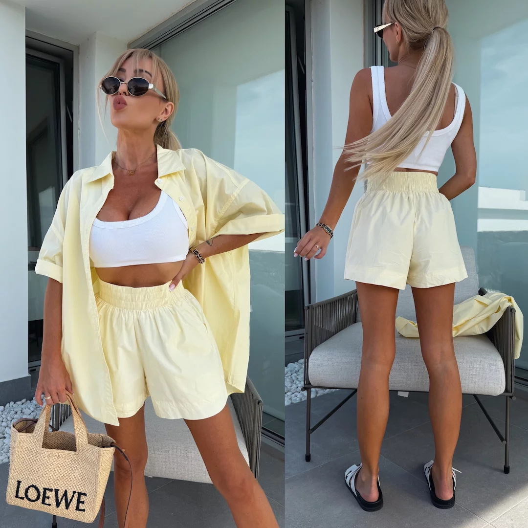유럽과 미국의 새로운 2025 봄과 여름 캐주얼 여성 세트 단색 반팔 셔츠 투피스 세트스토어 가기