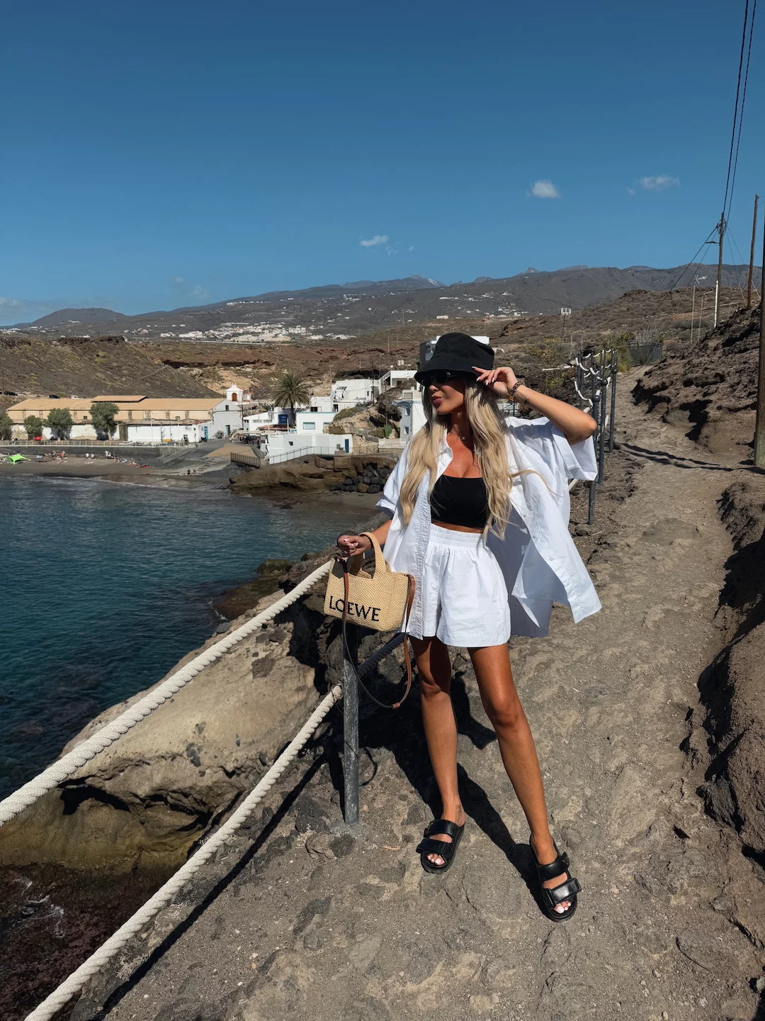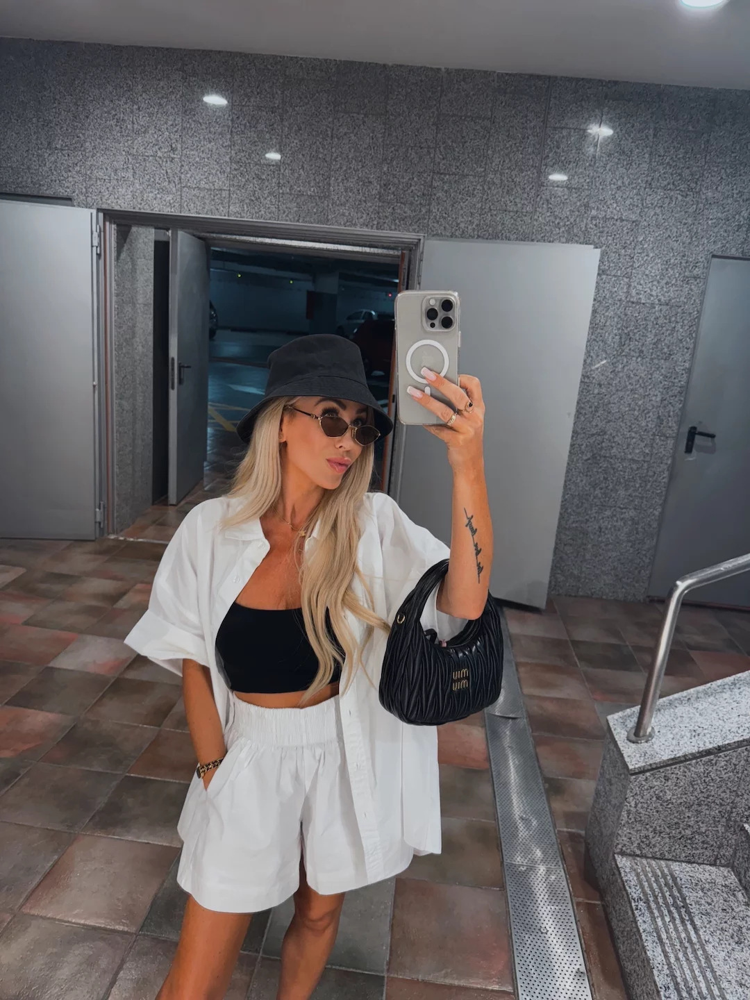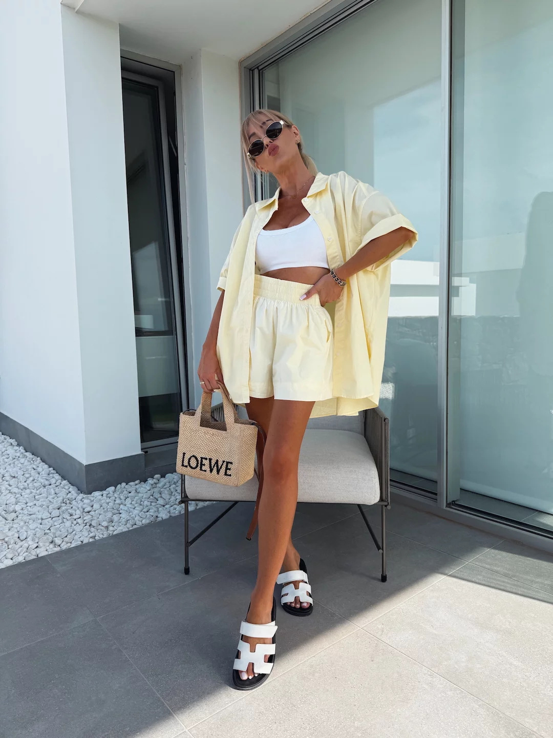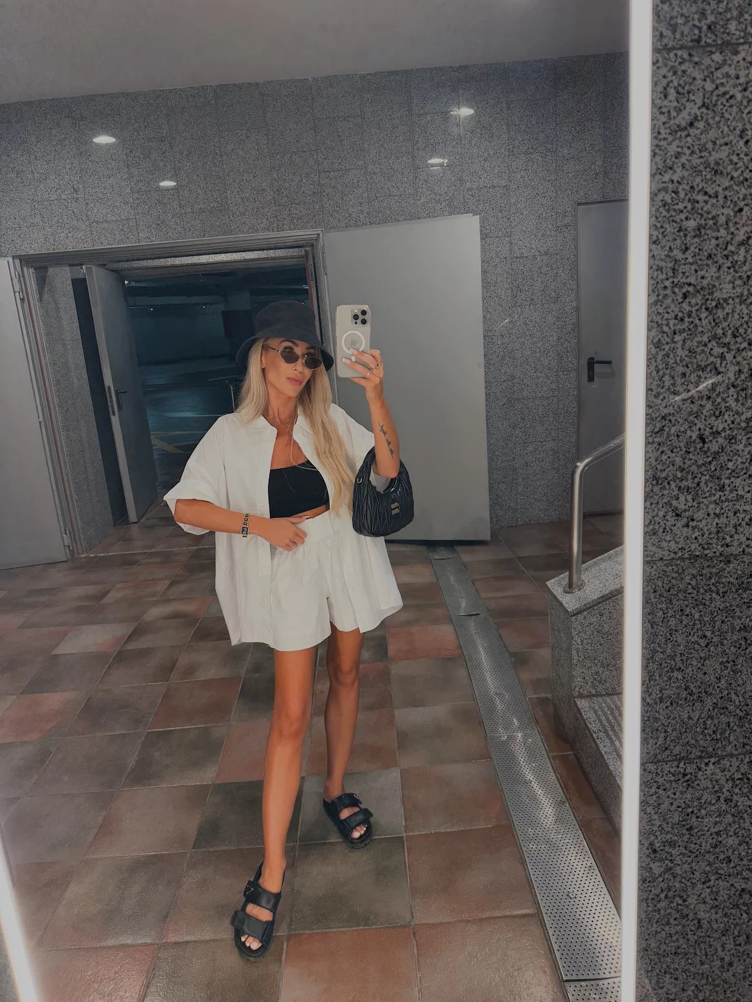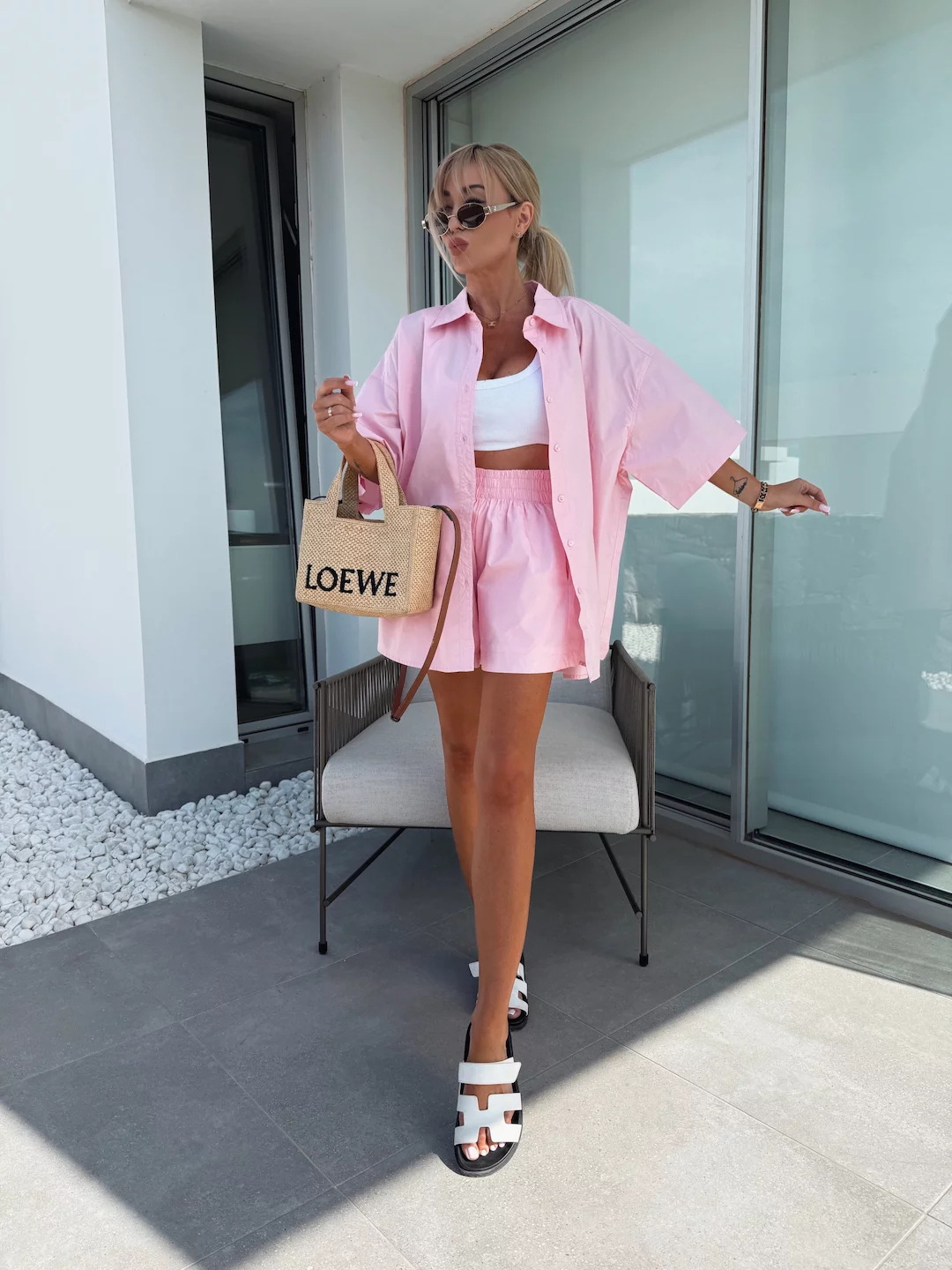 유럽과 미국의 새로운 2025 봄과 여름 캐주얼 여성 세트 단색 반팔 셔츠 투피스 세트스토어 가기