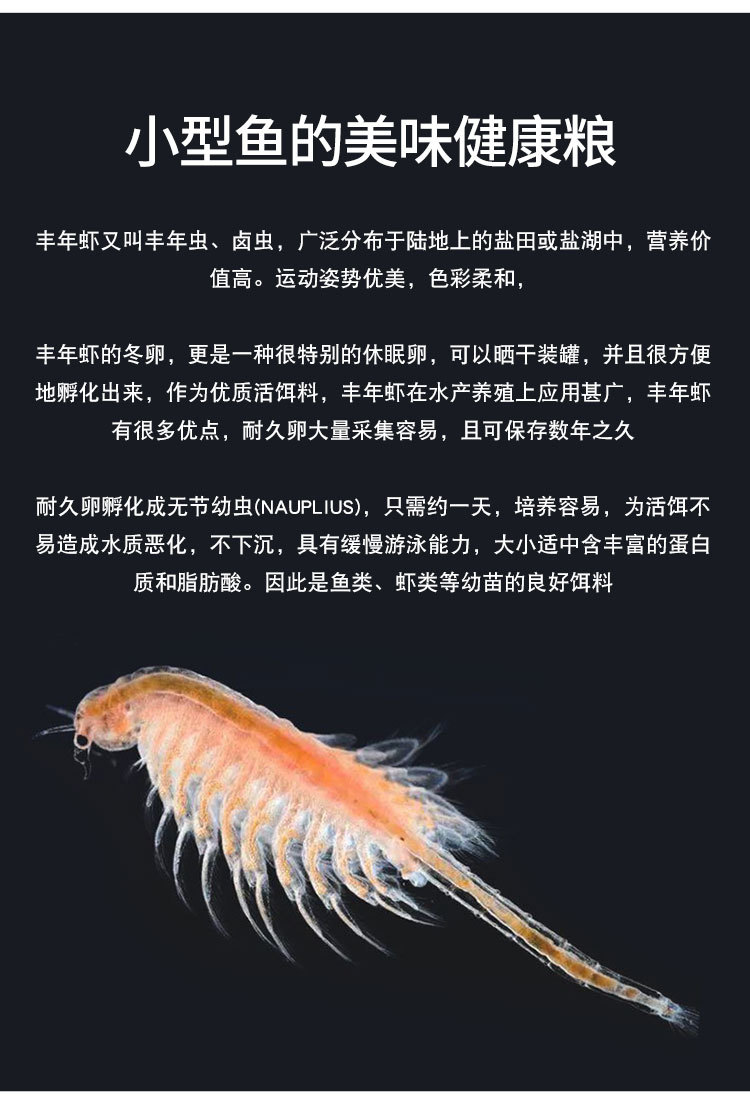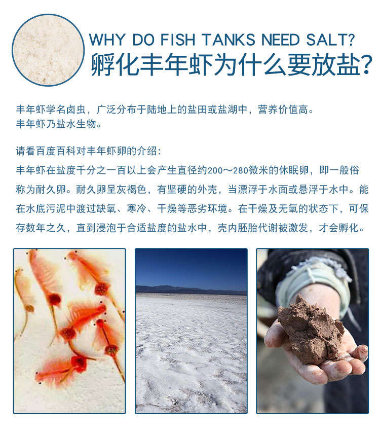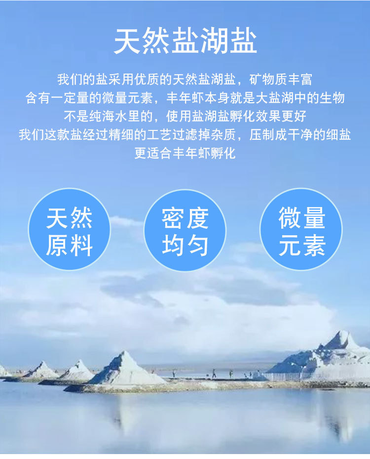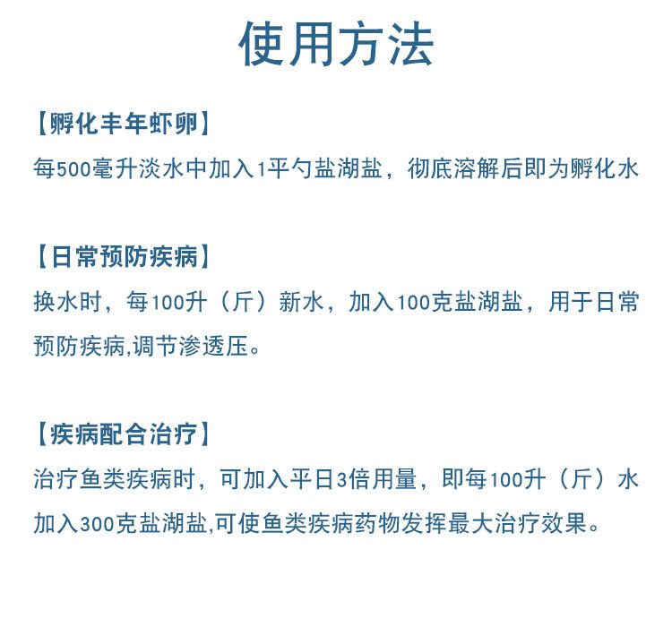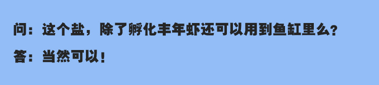 本品专用于丰年虾的孵化,丰年虾孵化比重范围为1.01-1.02之间,即每升的水中含有10~15克的盐。