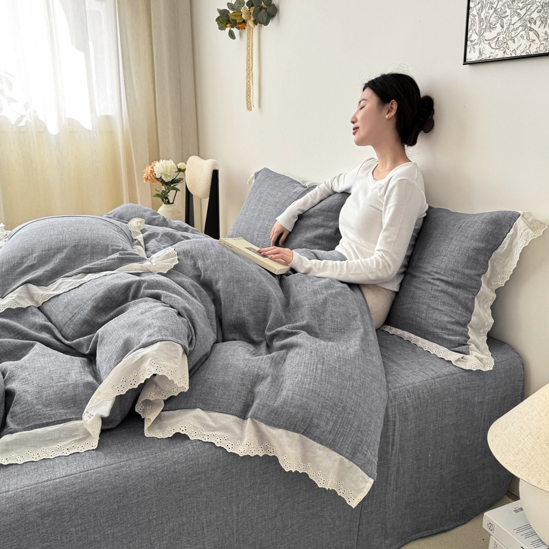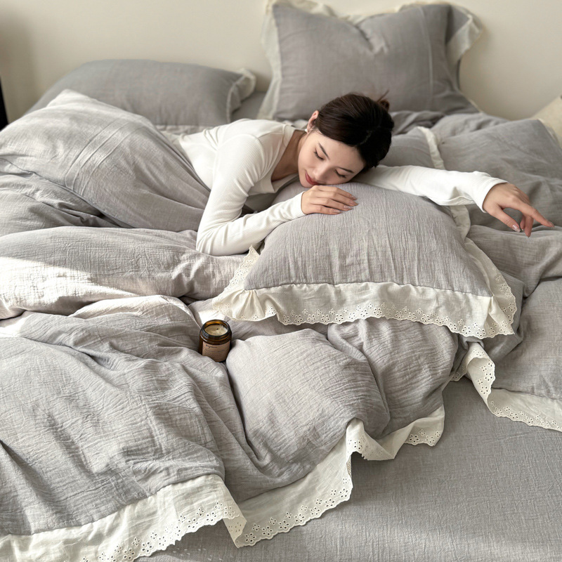 2025 새로운 면 더블 레이어 주름진 모래 단색 거즈 레이스 침대 시트 4 피스 세트 프렌치 매트리스 세트