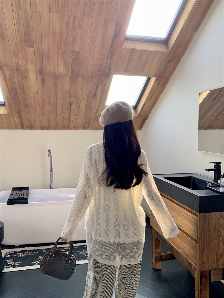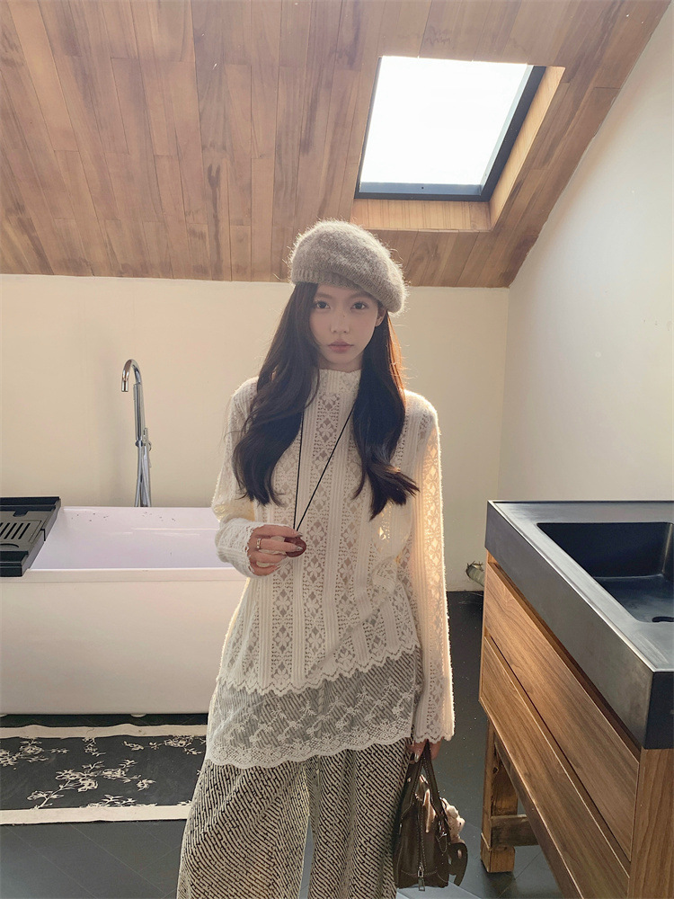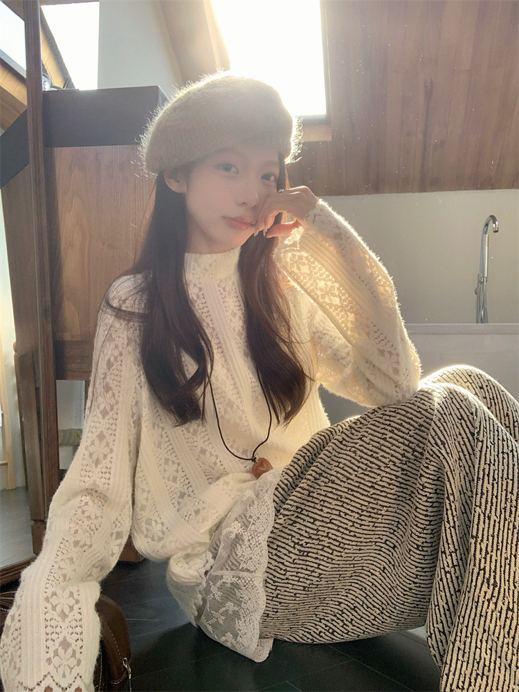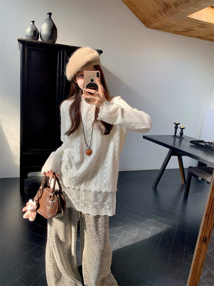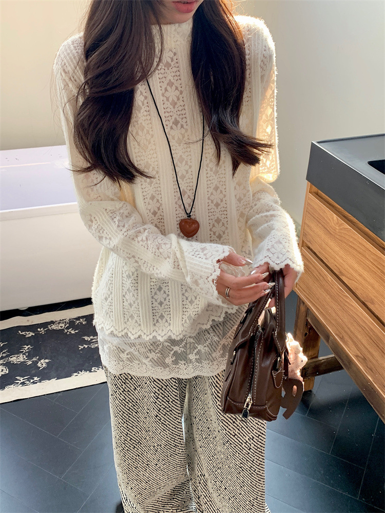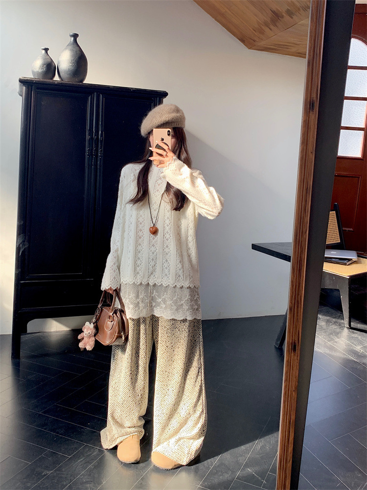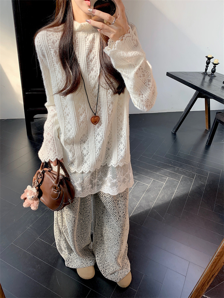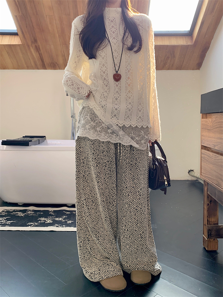 리얼 샷 ~ 기질 조커 레이스 바닥 셔츠 여성의 작은 하이 칼라 탑 느슨한 걸레 바지 스트레이트 팬츠 세트 77522
