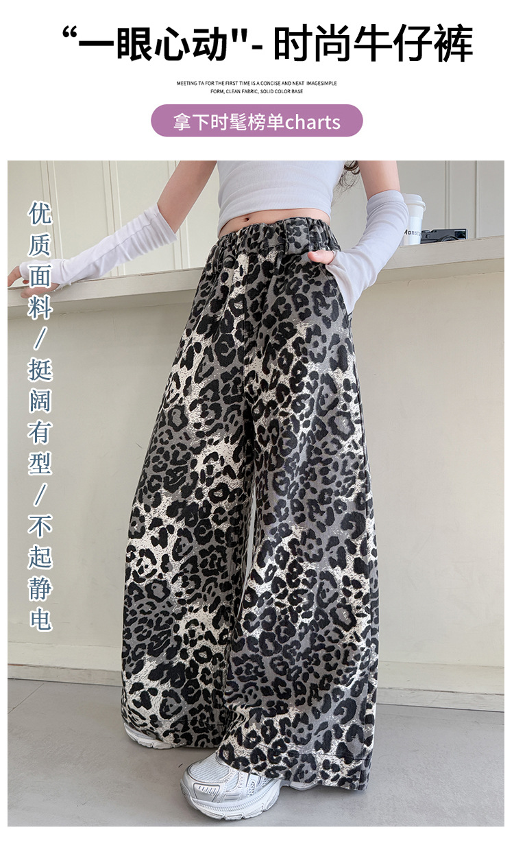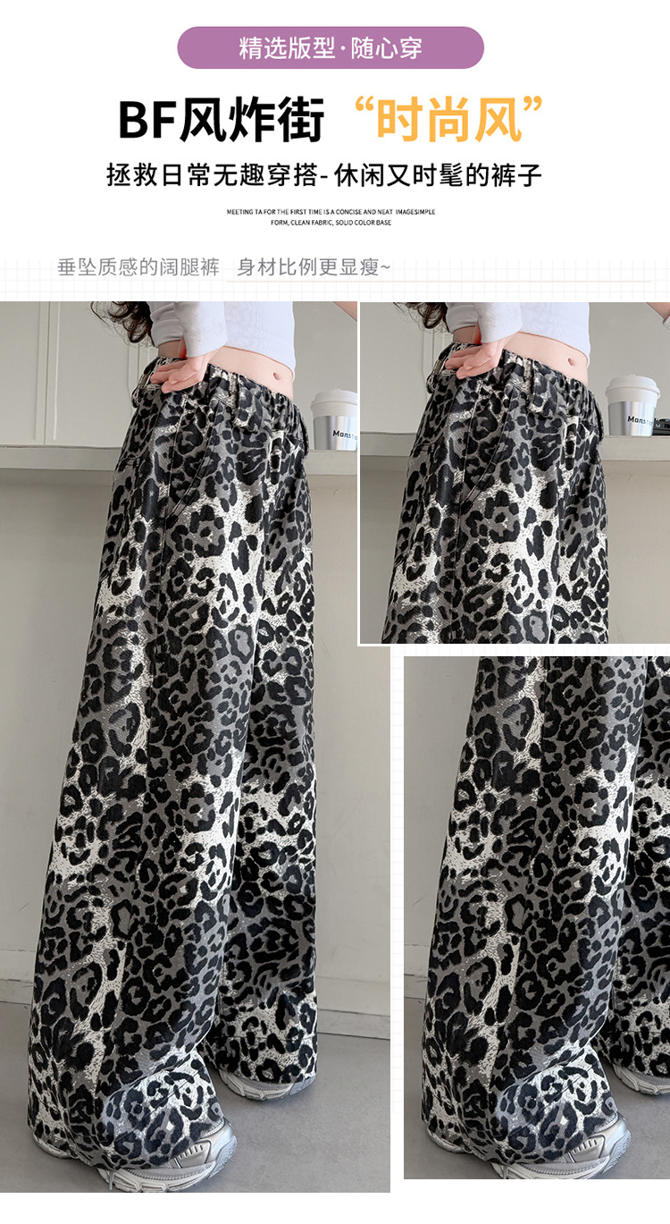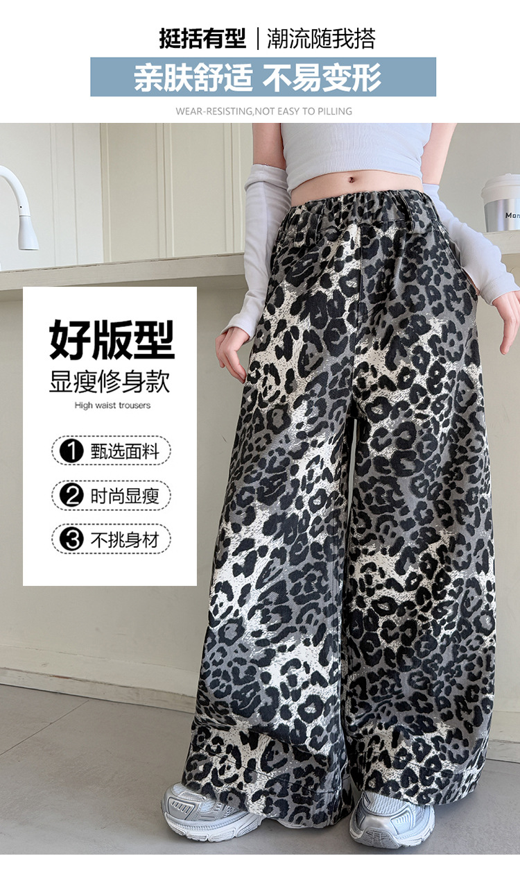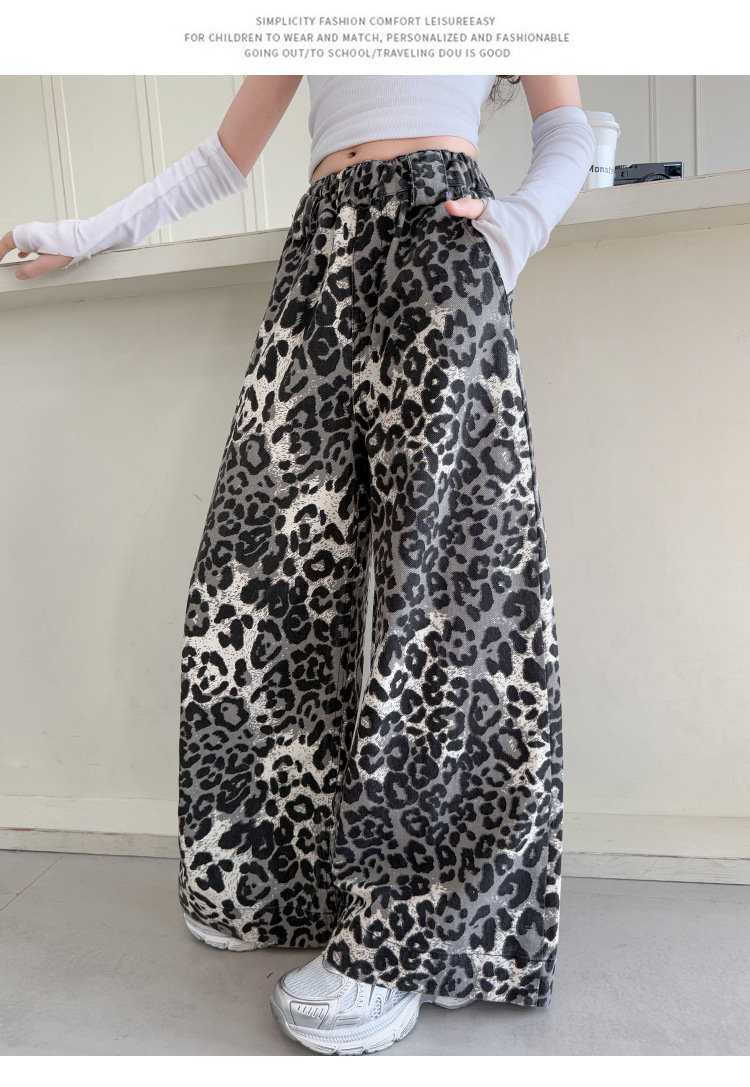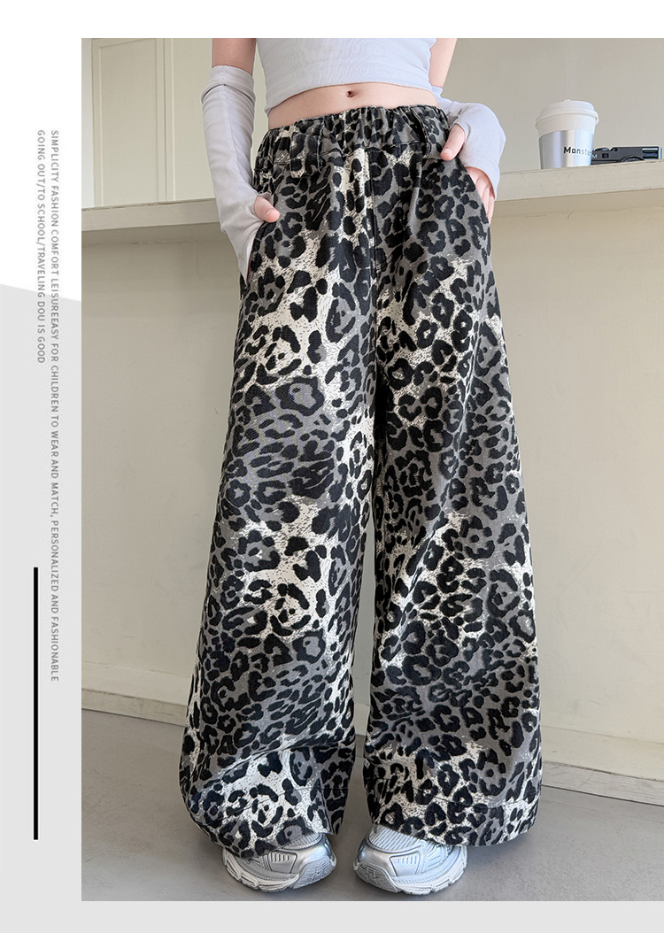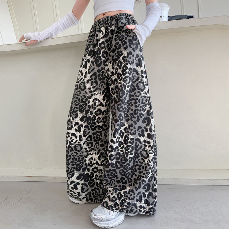 소녀의 봄과 가을 바지 2025 새로운 어린이 넓은 다리 바지 오픈 봄 서양식 유행 큰 어린이 레오파드 무늬 바지 슈퍼 아름다운스토어 가기