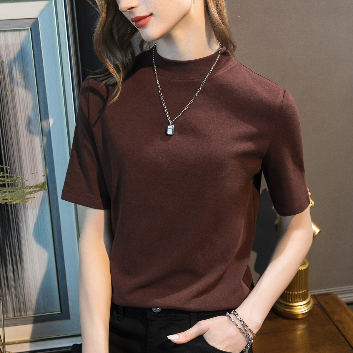 2025 가을 새로운 여성 소매 칼라 디자인 감각 반소매 티셔츠 여성 슬림 티셔츠 재킷 머리카락 세대스토어 가기