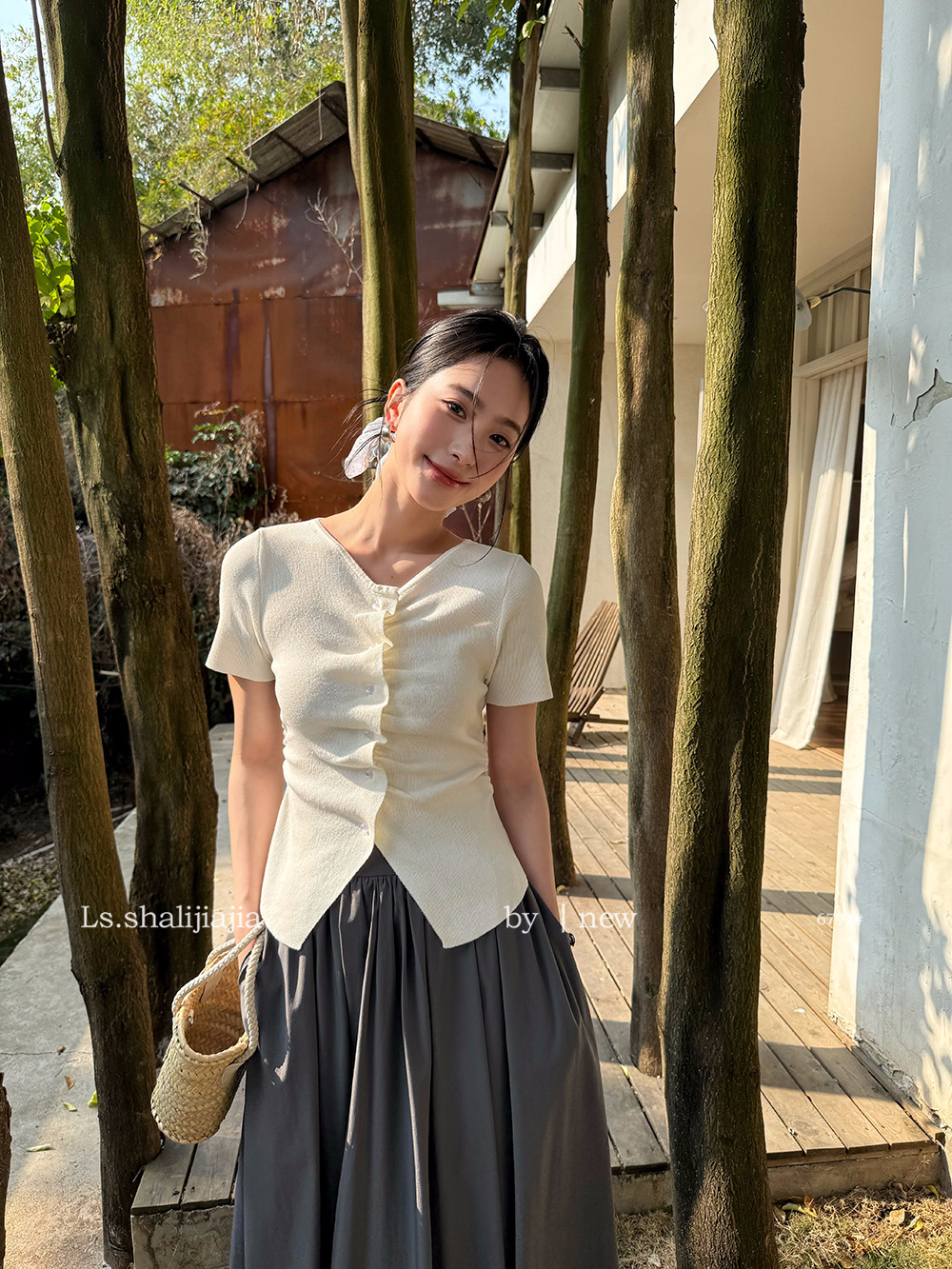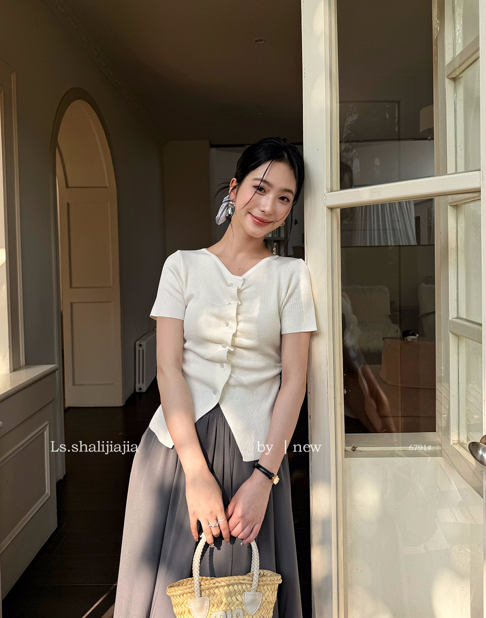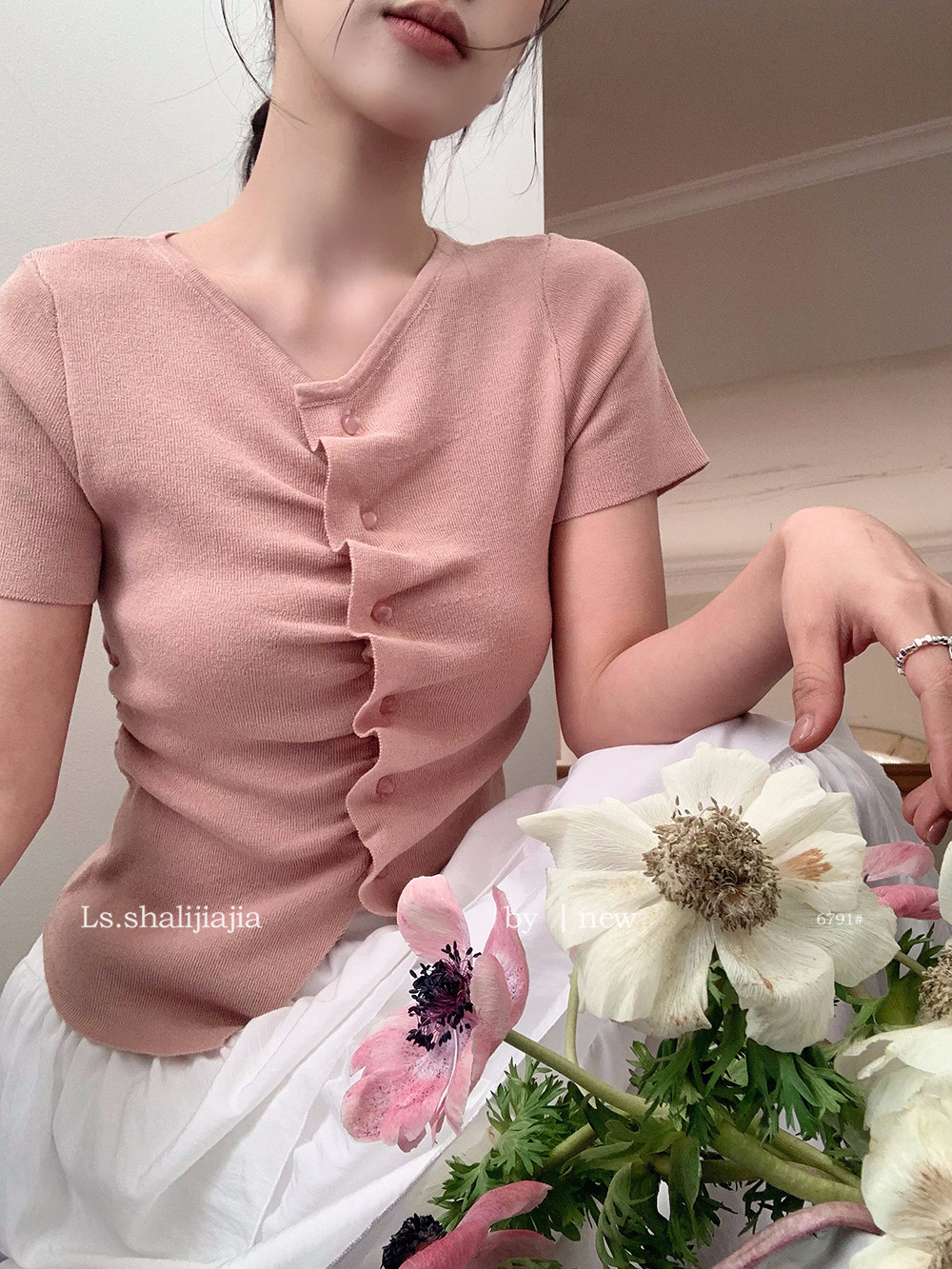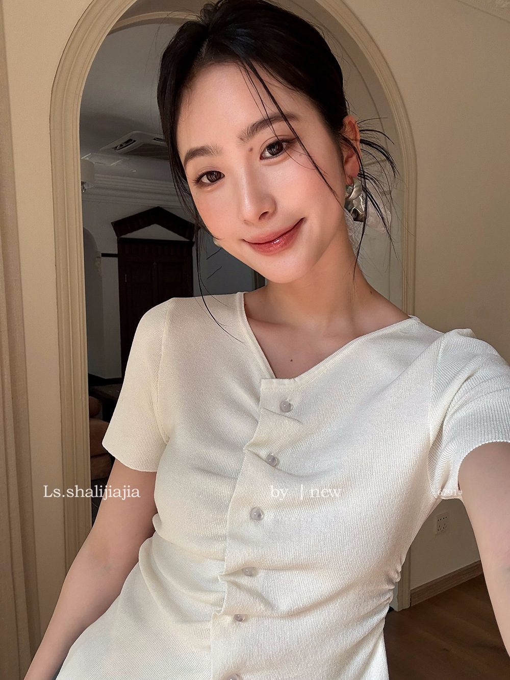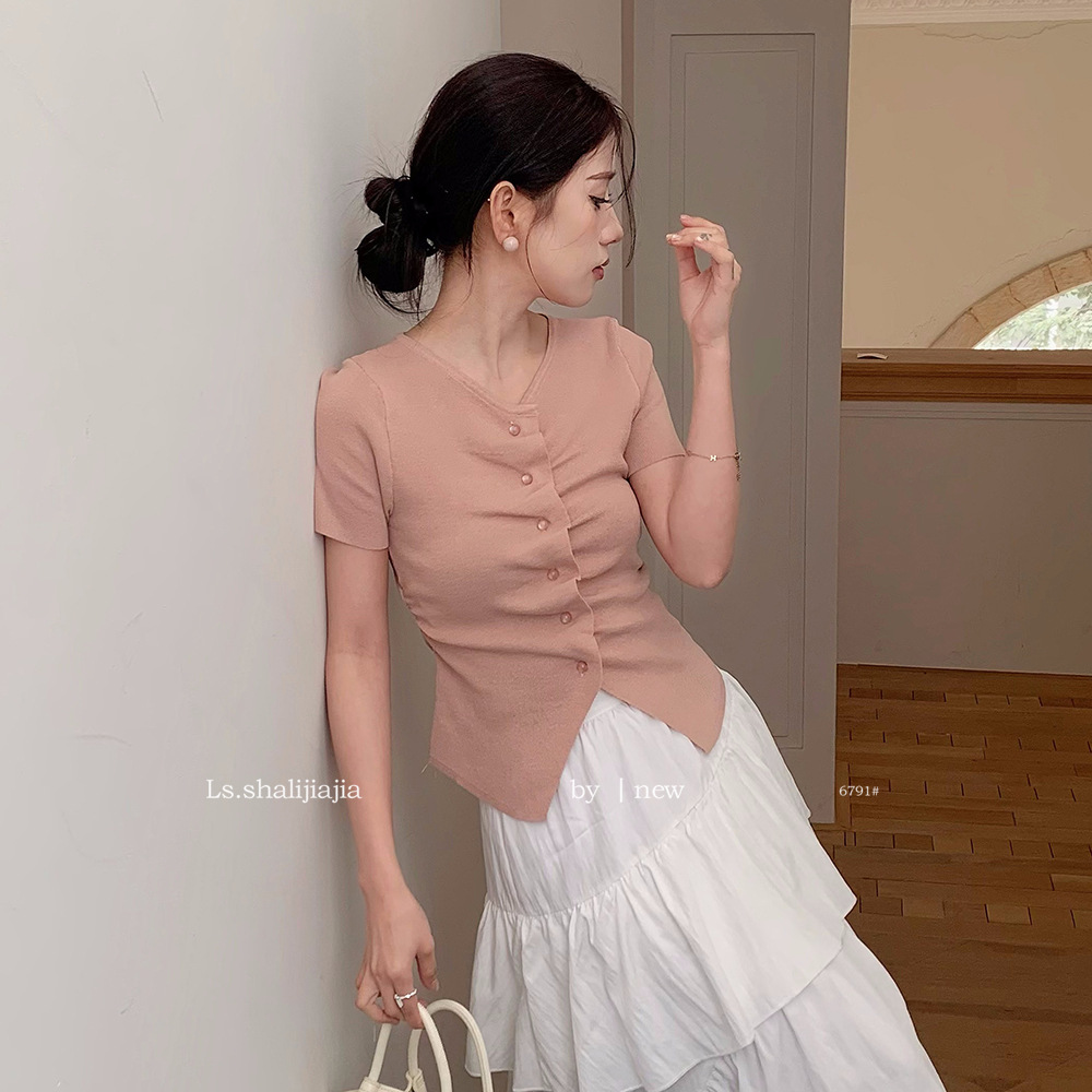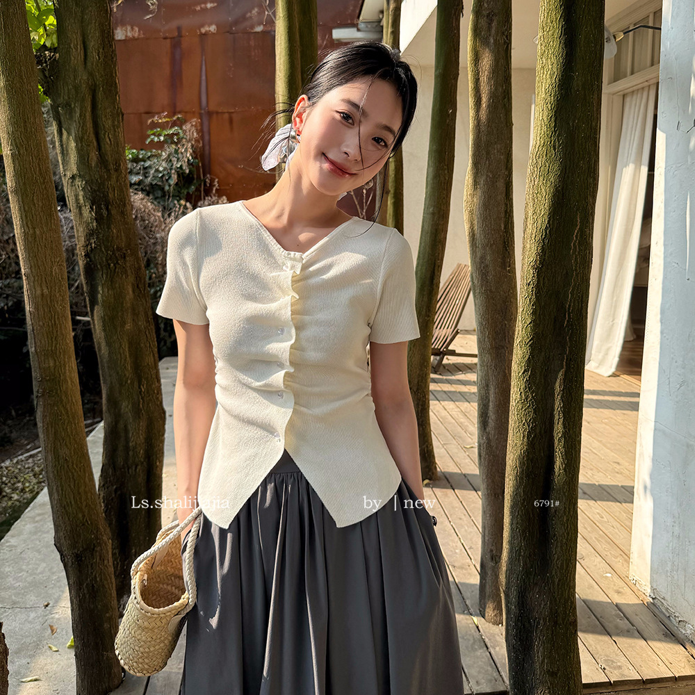 LS 프렌치 플리츠 니쉬 슬림 핏 쇼트 슬리브 탑 광저우 13 라인 2025 봄 새로운 여성복 6791 #스토어 가기