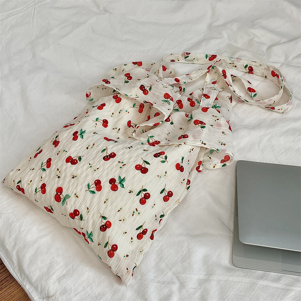 52202 봄과 여름 새로운 쉬폰 러플 숄더 백 귀여운 체리 캔버스 가방 대용량 휴대용 토트 백스토어 가기