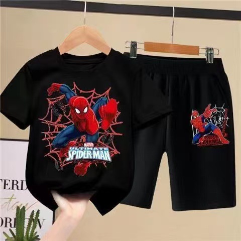 여름 어린이 둥근 목 반팔 티셔츠 키즈 스파이더 맨 소년 스포츠 세트 서양식 반바지 얇은 세트 트렌디