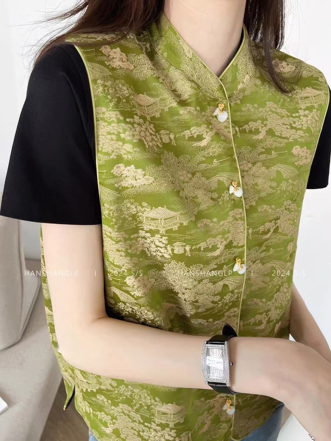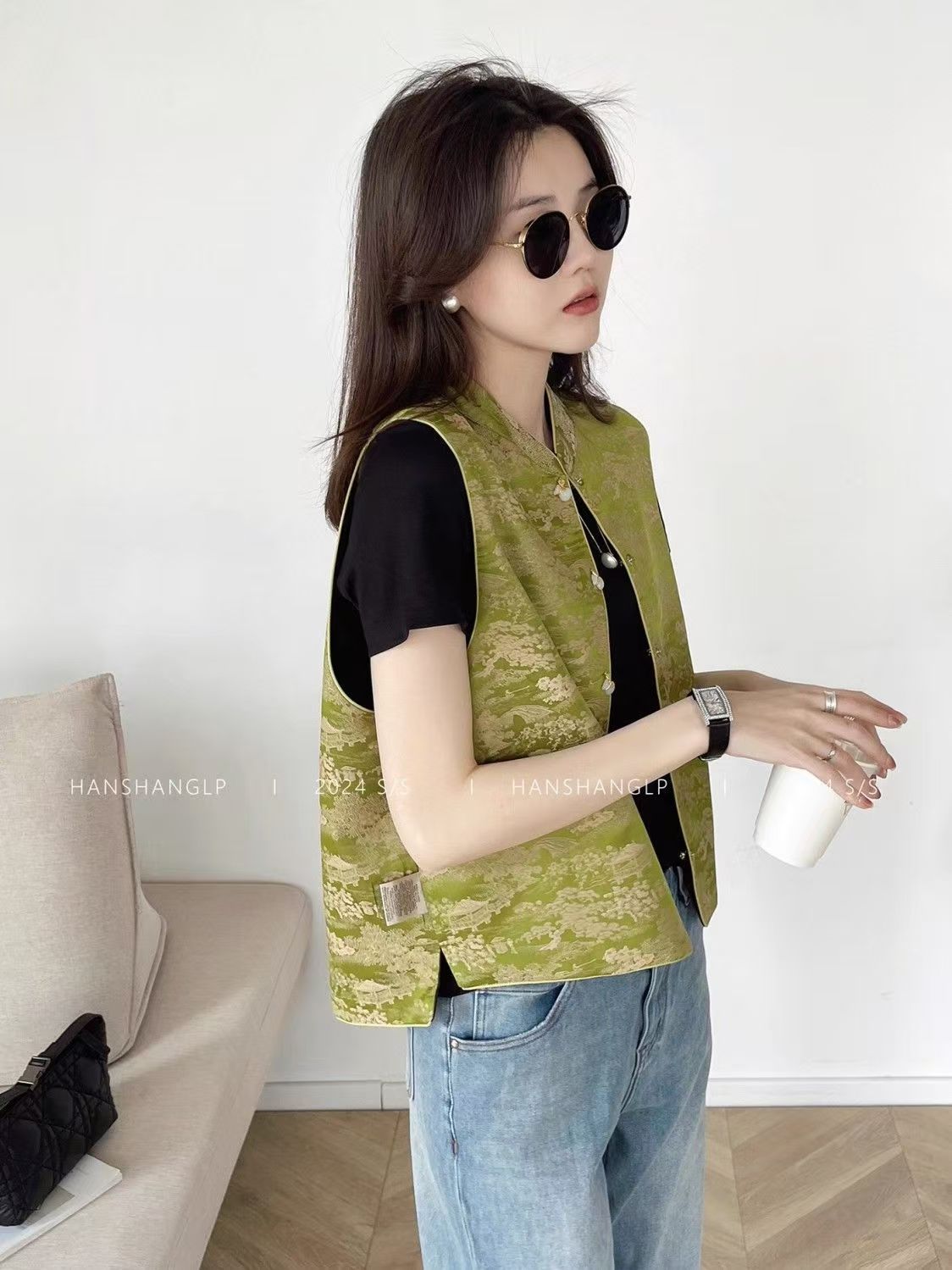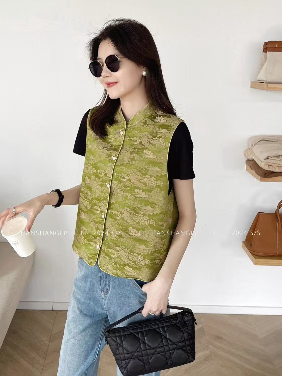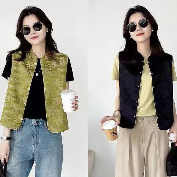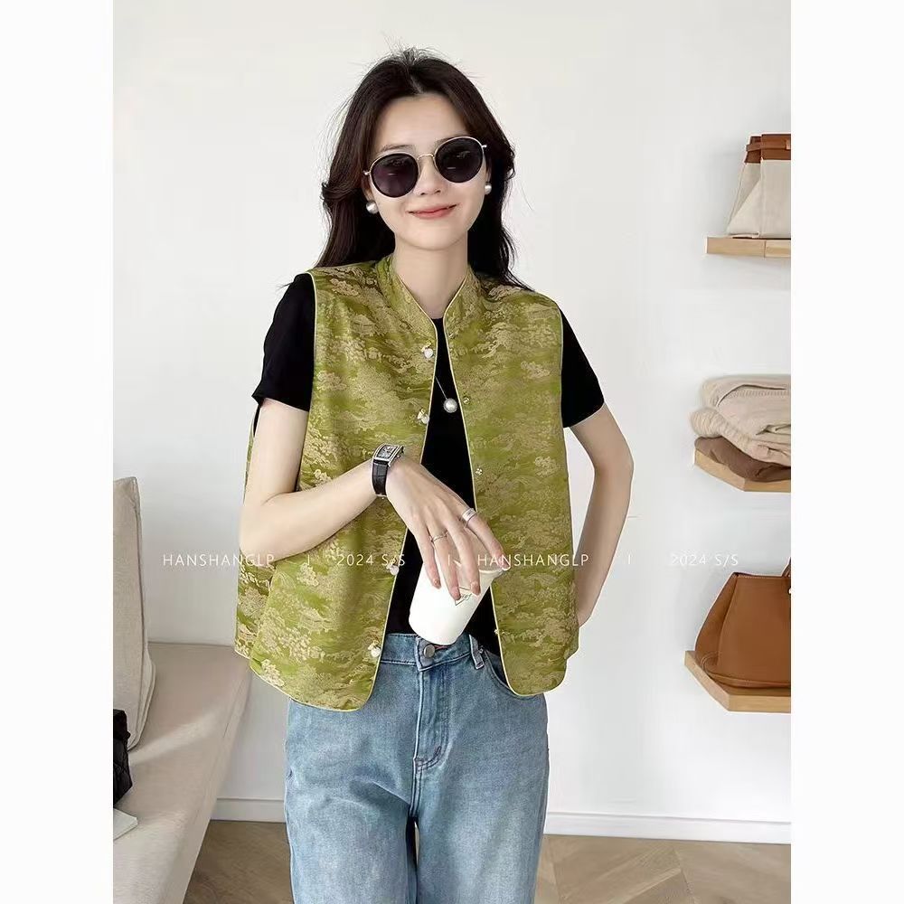 봄과 가을 더블 입고 국가 스타일 중국 스타일 조끼 여성 봄 착용 수직 칼라 탑 빈티지 재킷 자카드 조끼 여성스토어 가기