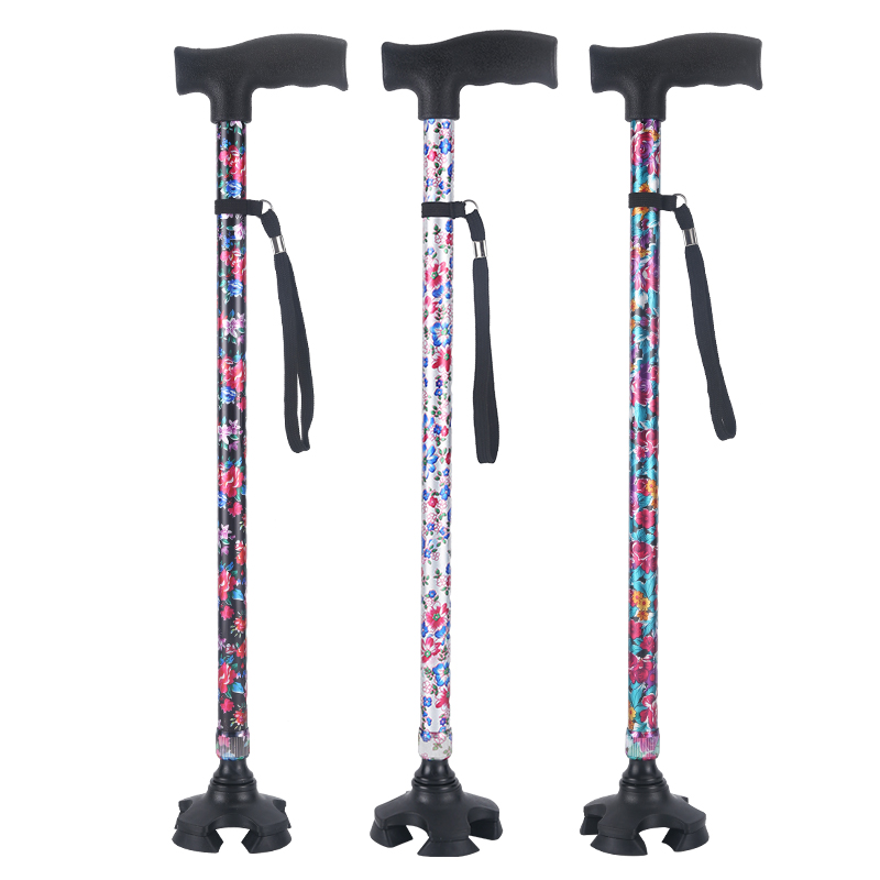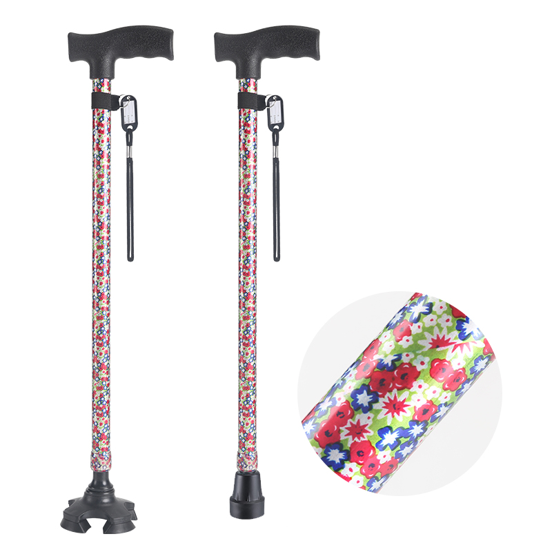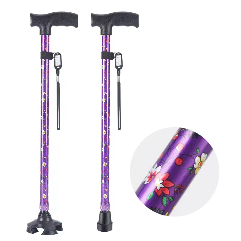 노인을위한 절묘한 인쇄 워킹 스틱 등산 스틱 경량 다기능 망원경 미끄럼 4 다리 알루미늄 합금 목발 고무