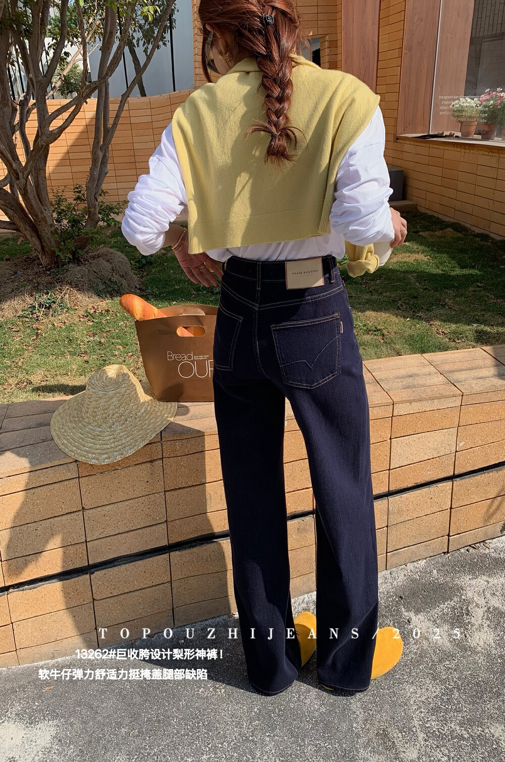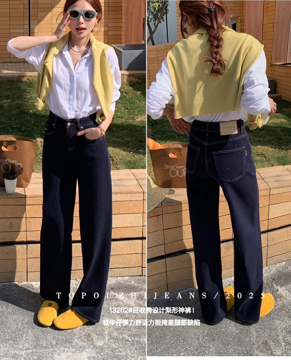 봄과 가을을위한 좁은 고관절을 덮는 여성용 다크 블루 넓은 다리 청바지 높은 허리 느슨한 긴 스트레이트 바지스토어 가기