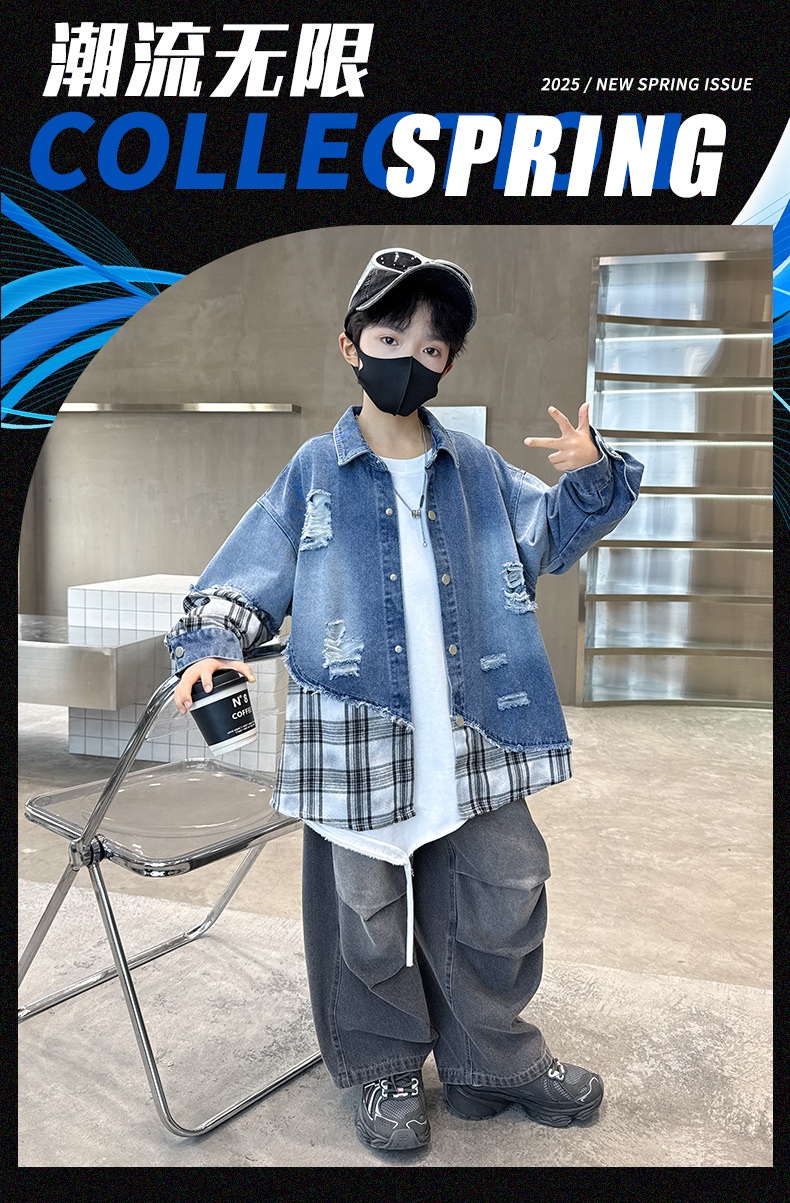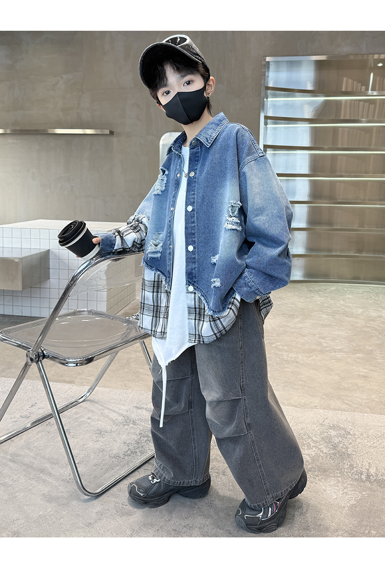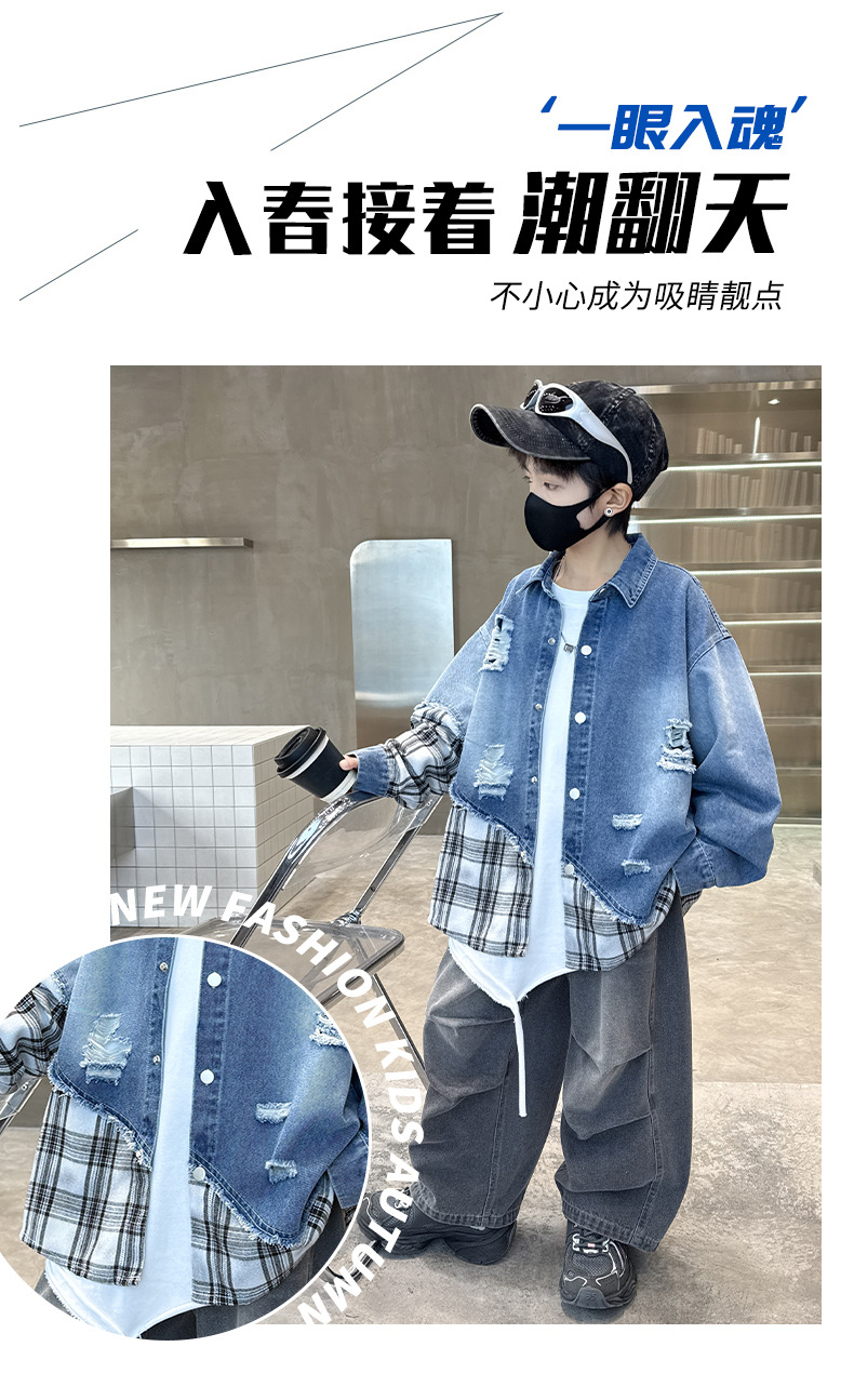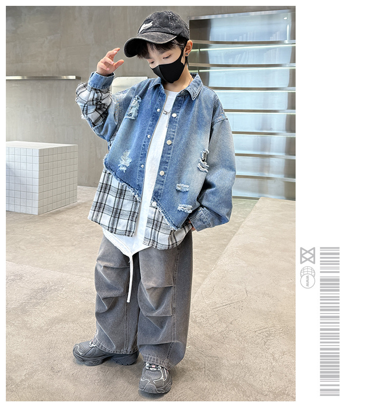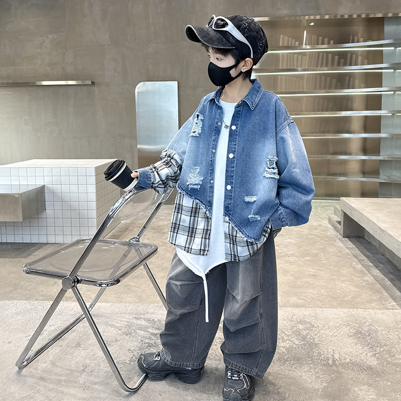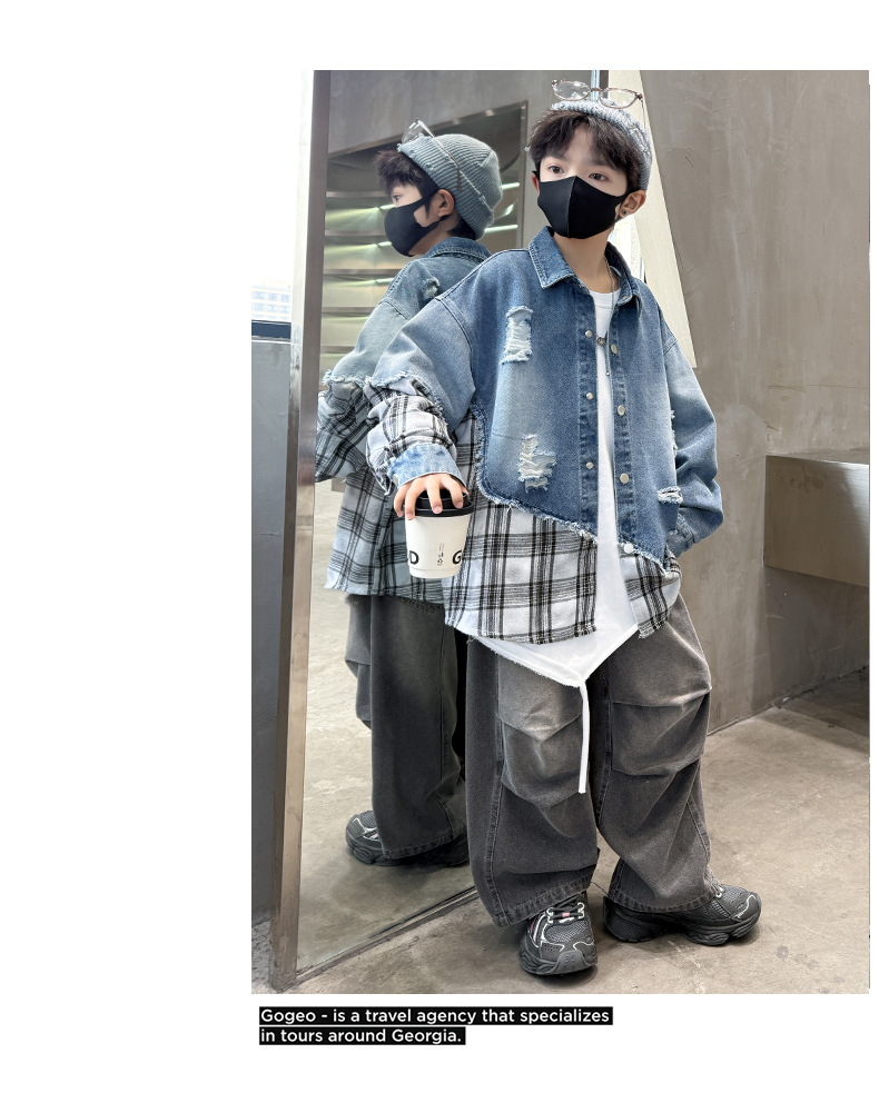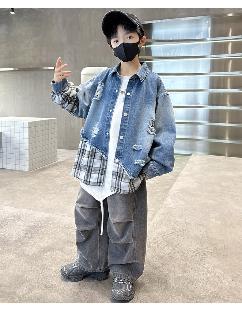 봄 소년 데님 코트 아동복 대형 어린이 봄과 가을 소년 격자 무늬 스티칭 청바지 유행 의상 잘 생긴스토어 가기