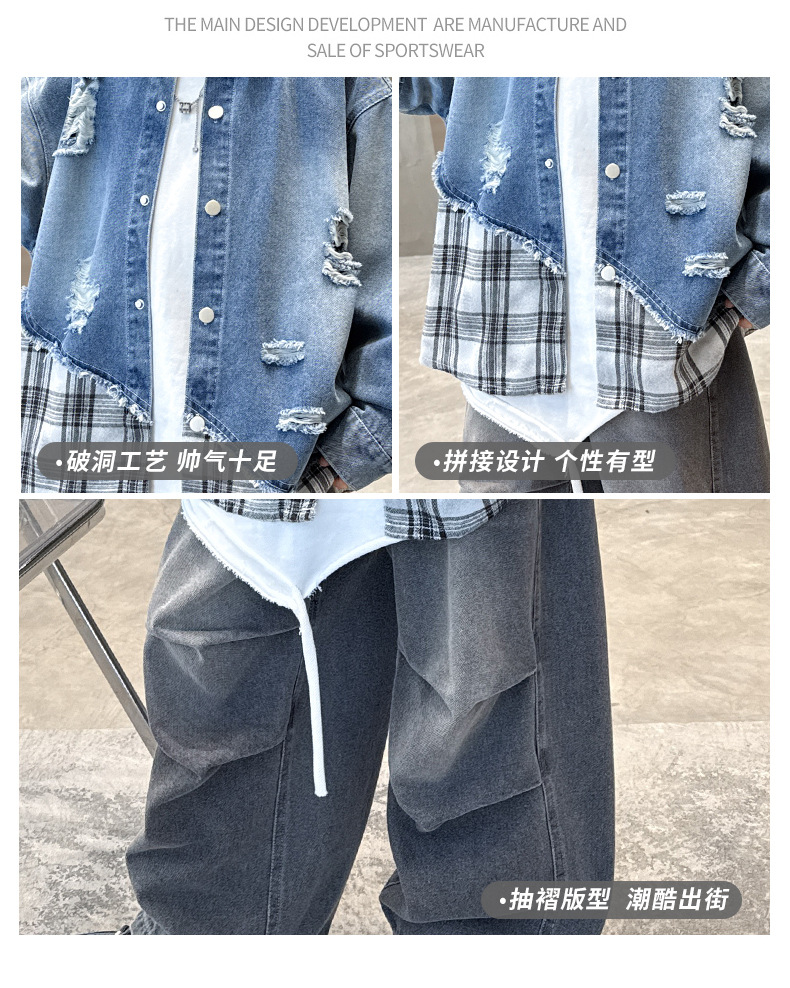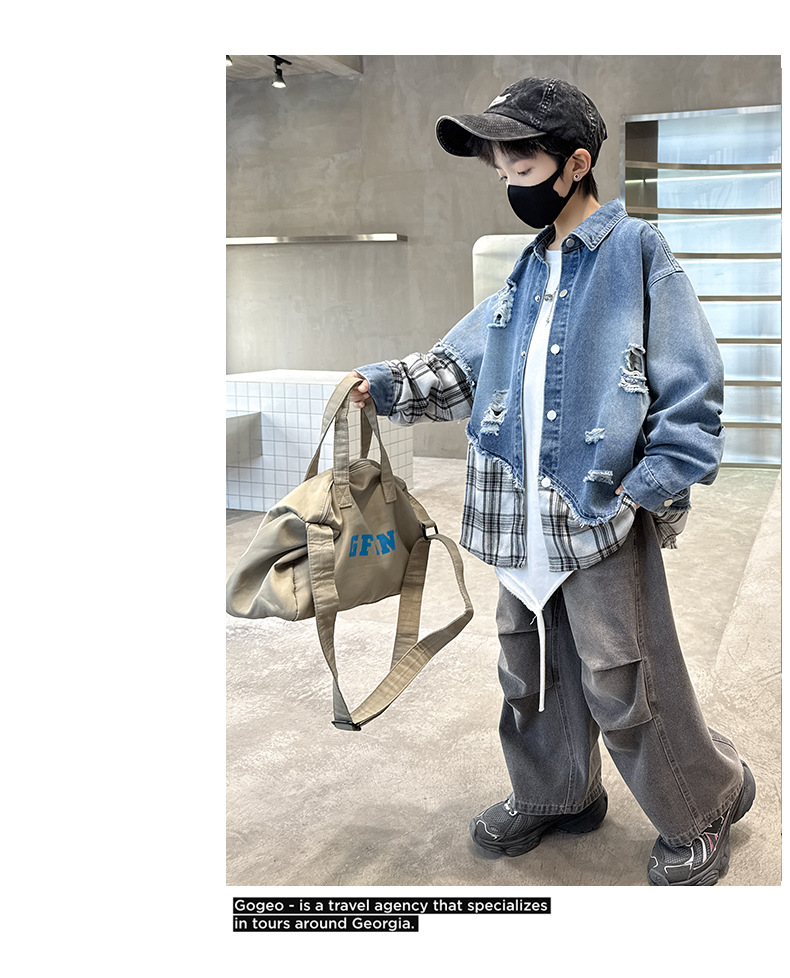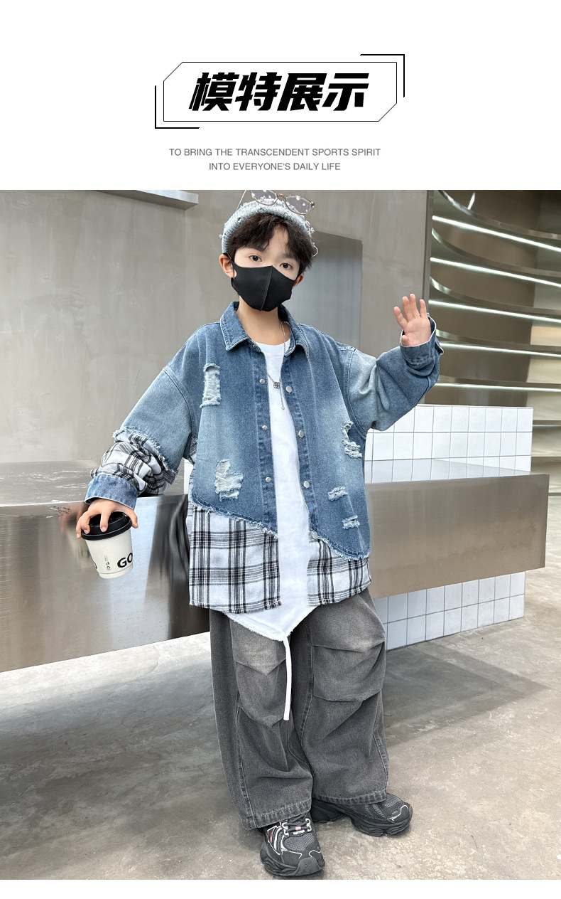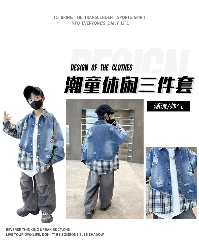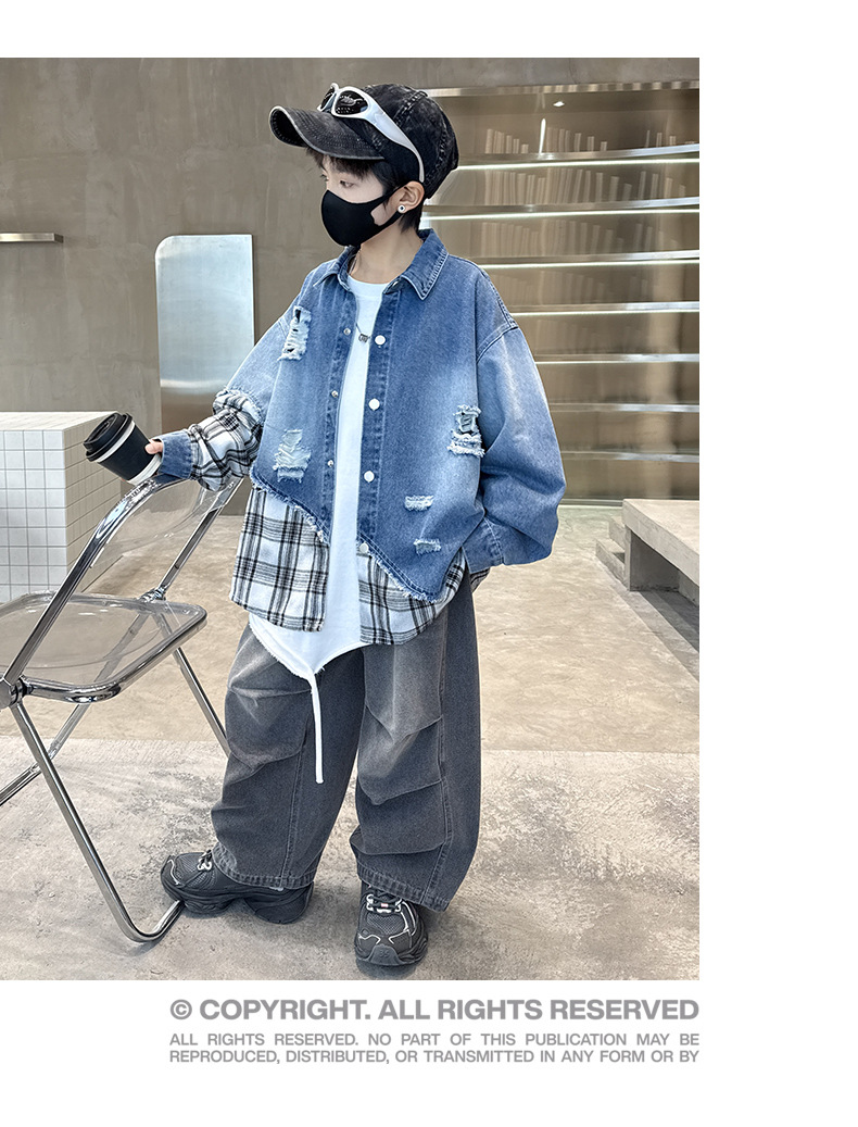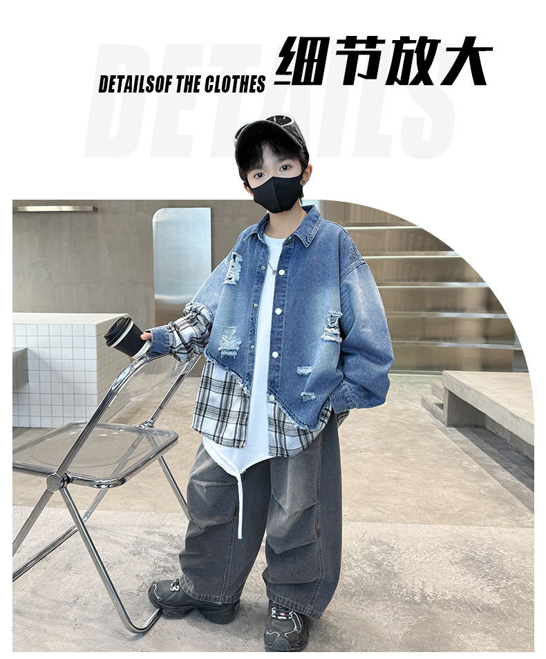 봄 소년 데님 코트 아동복 대형 어린이 봄과 가을 소년 격자 무늬 스티칭 청바지 유행 의상 잘 생긴스토어 가기