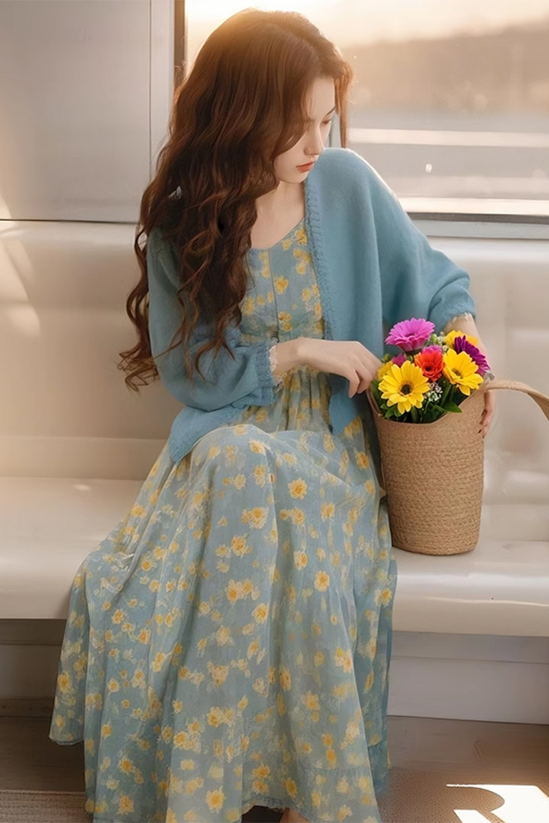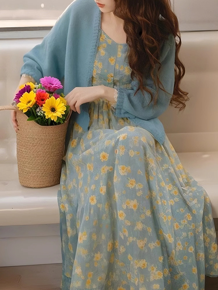봄 여성의 2025 새로운 슈퍼 핫 엔드 향수 부드러운 나이 감소 슬리밍 꽃 원피스 세트